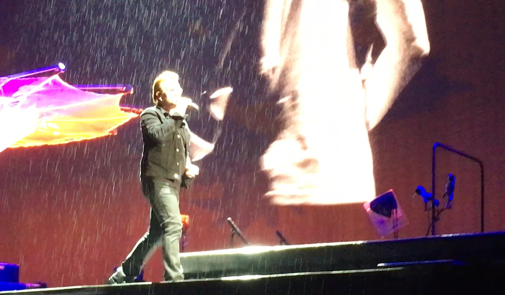 Azzal a végtelen U2-s eleganciával, szeretetosztó költészettel, az egész világra kiterjedő öleléssel végig énekli, végig járja, végig mosolyogja, végig kiabálja a koncertet. Miközben bőrig ázik, és tócsákban felgyűlt vízben jár.