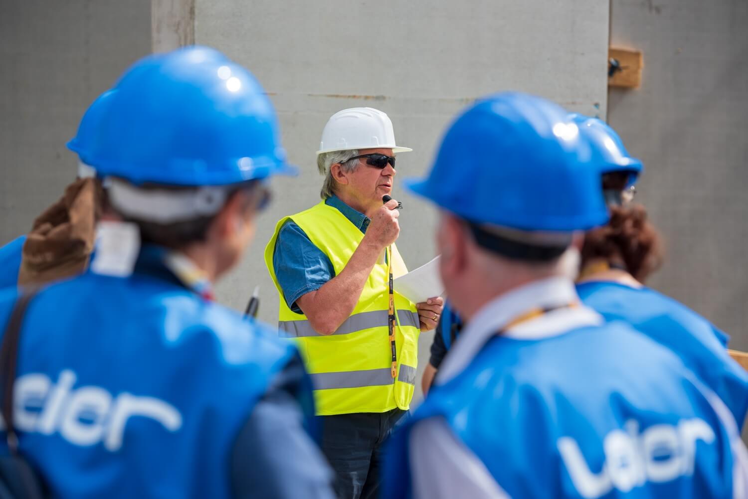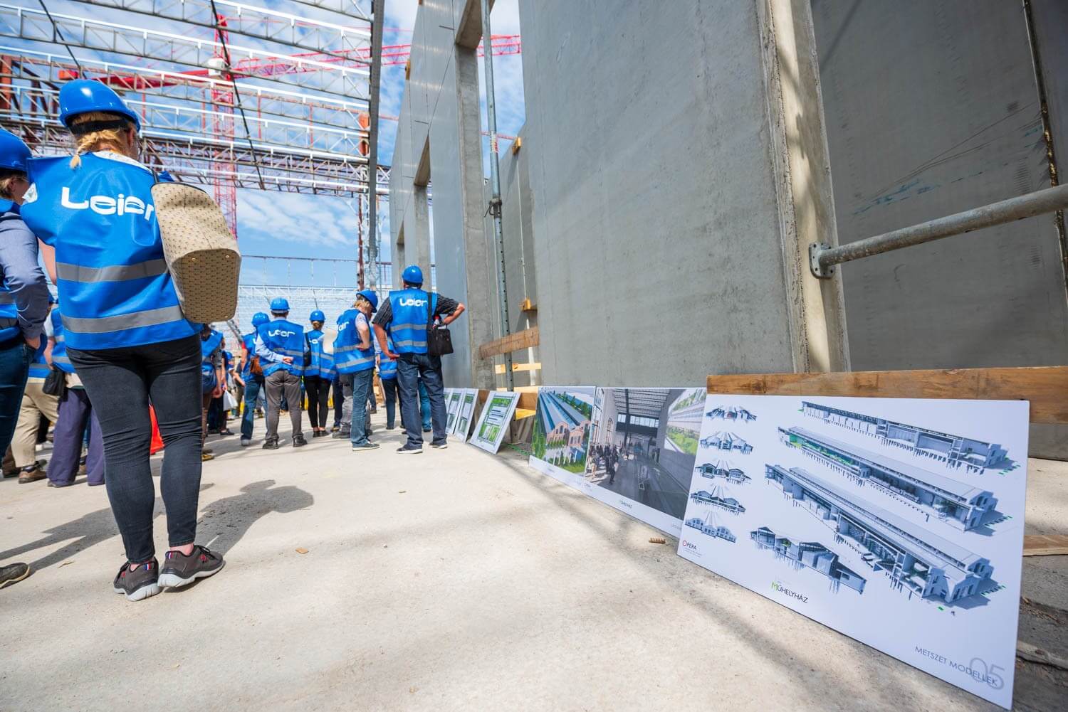 Nagy mennyiségben használják fel az építkezés során a Leier előregyártott betonelem termékcsaládjából a kéregfalat, amely a cég győri üzeméből érkezik a helyszínre. A termék kifejlesztését a magas minőségi elvárások és a feszes határidők hívták életre: 260 m2 falat négy fő egy nap alatt képes beépíteni, gyakorlatilag időjárástól függetlenül – mondta el Grieszler Zsolt, a Leier építőmérnöke, aki hozzátette, hogy a 2019-es határidejű projektben összesen 15 ezer négyzetméterre van szükség a termékből. A Leier falpanel kétoldali vasbeton kéregrészből és az ezeket összekötő hegesztett betonacél rácsból, illetve (a tervező által megadott mennyiségű) falvasalásból áll, s minden esetben az adott igényeknek megfelelő egyedi méretben készül. A két kéreg közti részt a statikusok által meghatározott minőségű betonnal kell kitölteni a beépítést követően, így az a betonmag szilárdulása után teljes értékű monolit vasbeton szerkezetté válik.