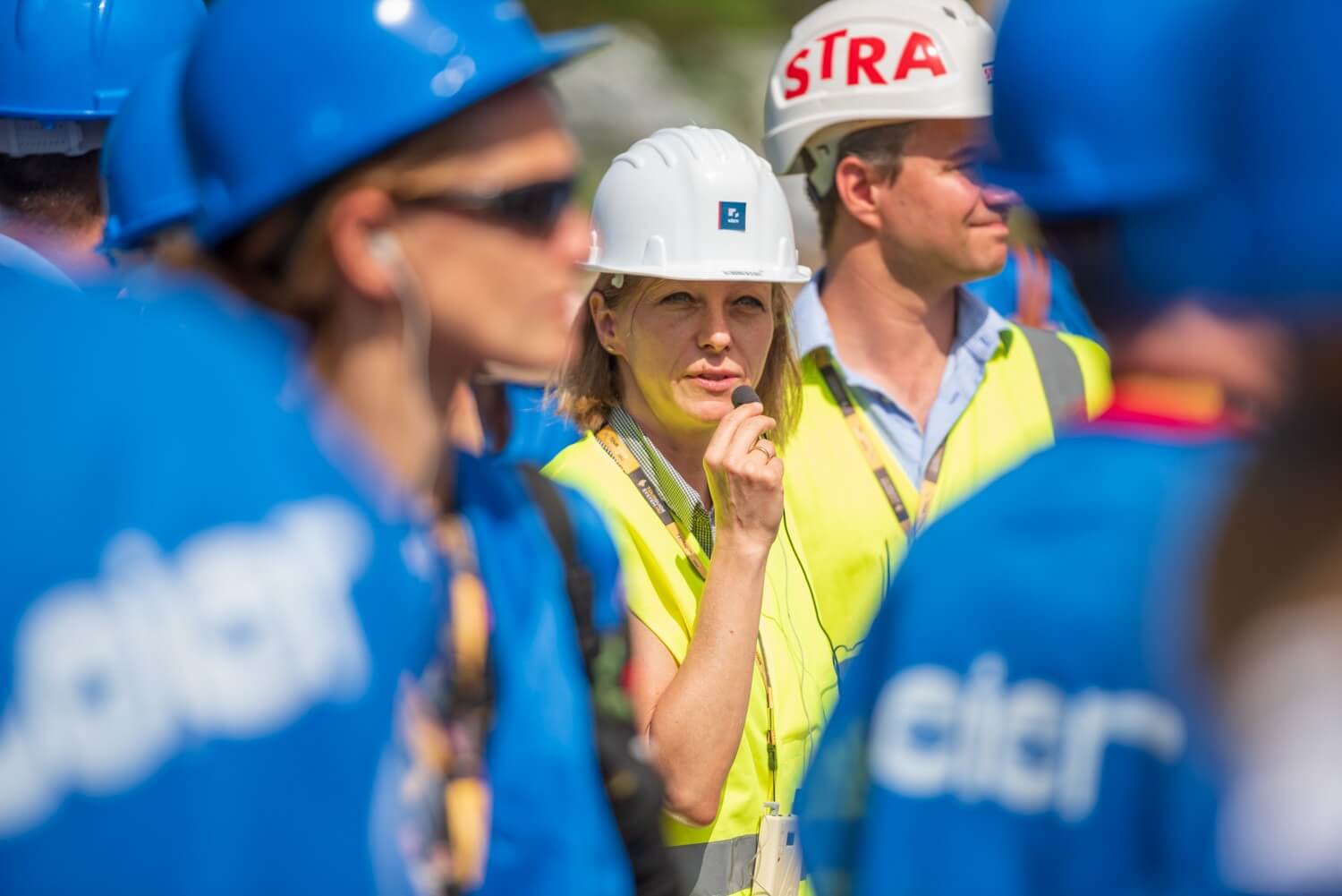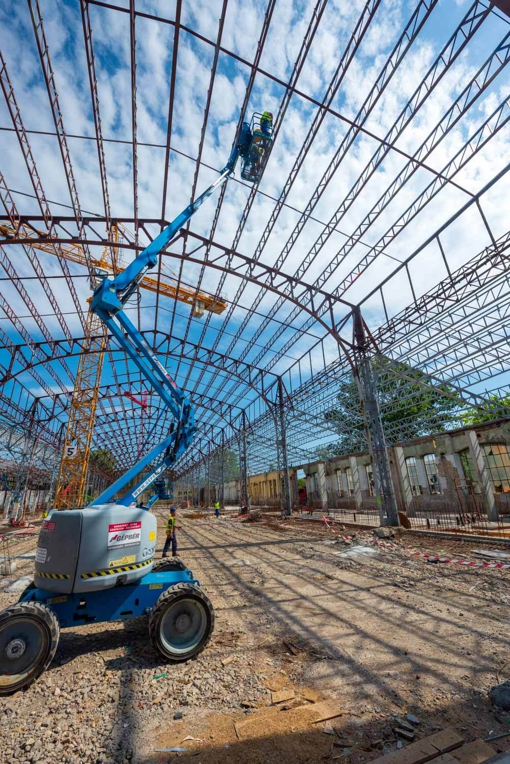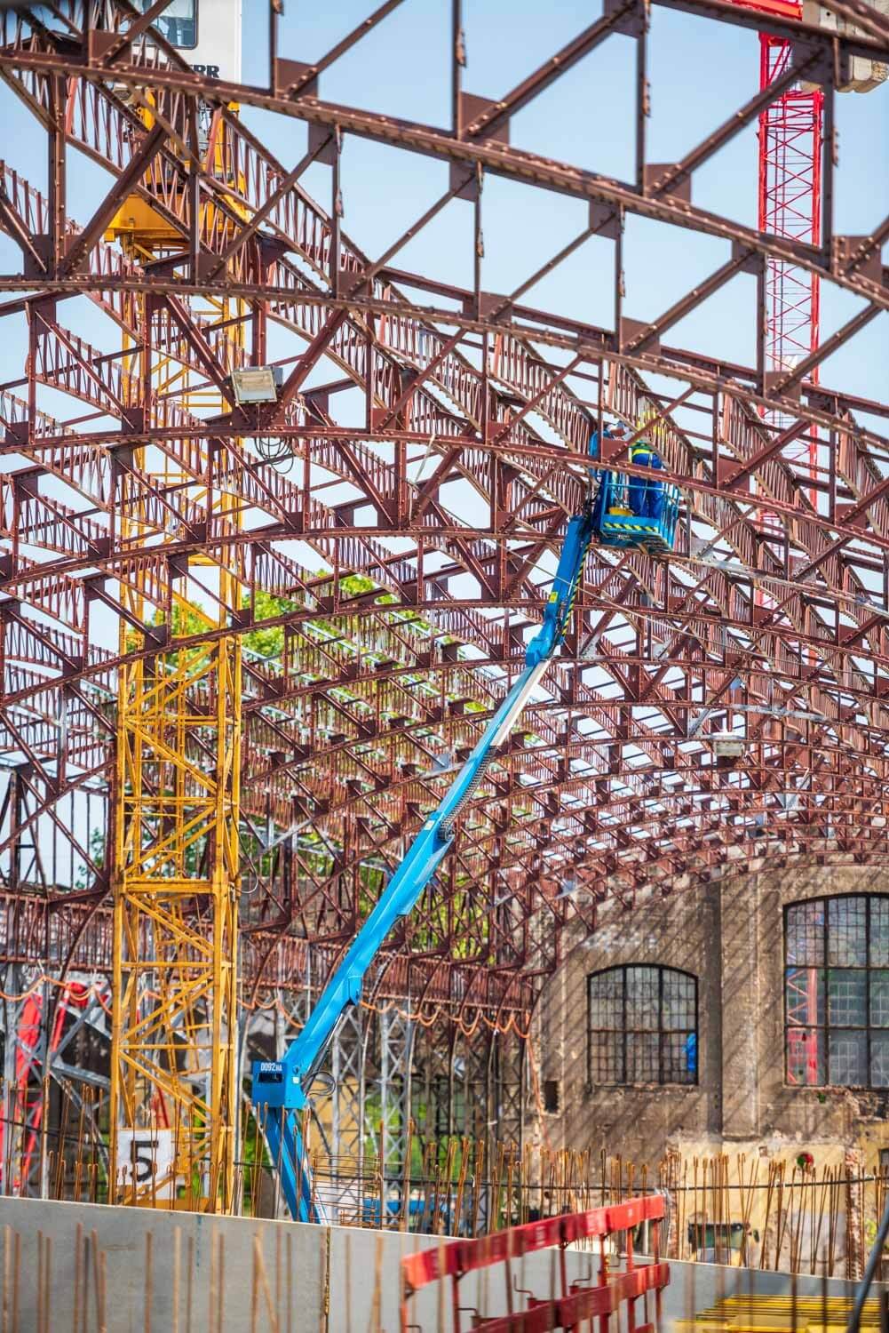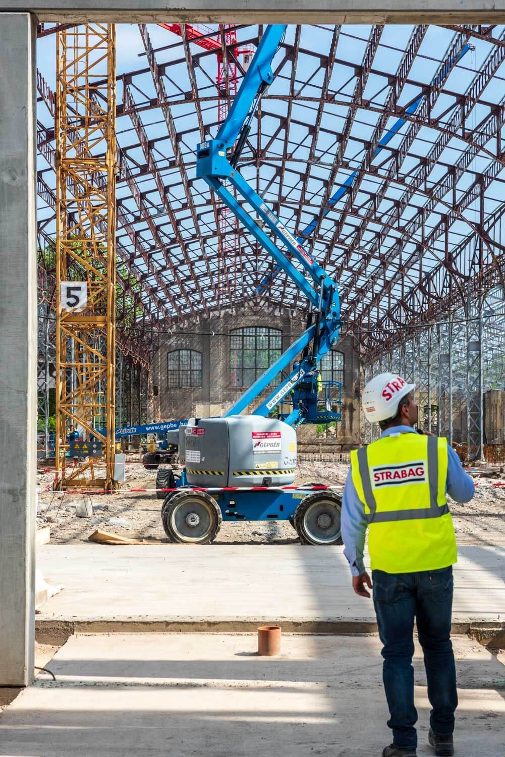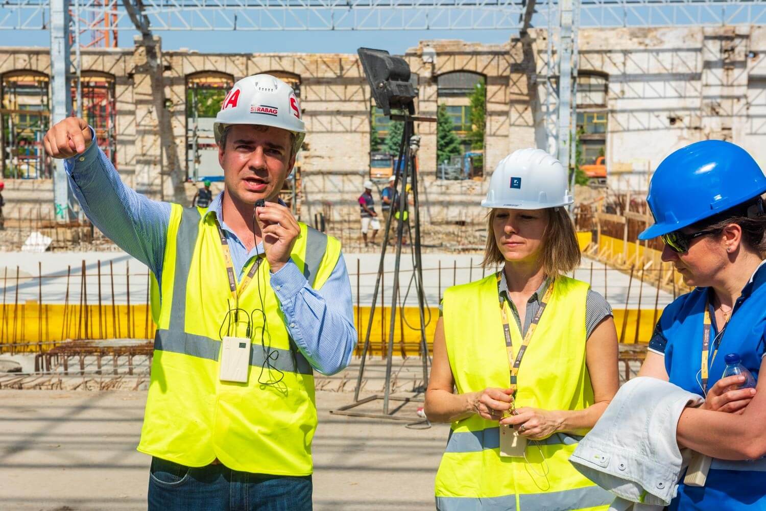 Kéri Dávid, a STRABAG projektvezetője és Szőnyei Tamás, a STRABAG tervezési koordinátora arra hívták fel a figyelmet, hogy az építkezés egyik kihívása a meglévő acélszerkezet: a kivitelezőknek gyakorlatilag ez alatt kell dolgozniuk, s egyedi megoldásokat kell alkalmazniuk az egyes építőelemek beemelése során.