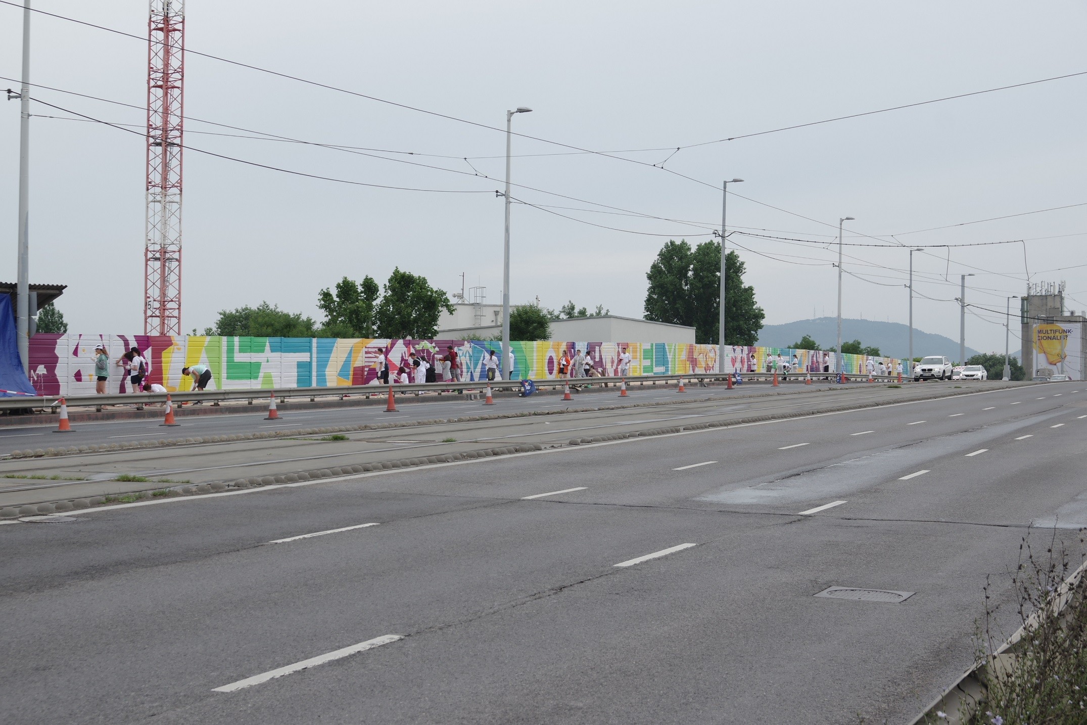 Közösségi összefogással, több mint száz önkéntes bevonásával festették ki a Hungária körúti felüljáró 140 méteres járdahatároló falát. A kezdeményező Let's Colour Településszépítő Egyesület közleményéből kiderül, a falszakasz a zaj- és porszennyezéssel szemben nyújt védelmet a gyalogosan közlekedőknek az Állatkerthez közeli híd térségében.