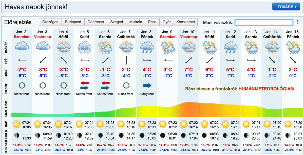 Szerdán eleinte országszerte erősen felhős, borult lesz az ég, többfelé várható havazás, hószállingózás. Később délen felszakadozhat a felhőzet, a nap is kisüt. Északon a borult időben havazás, havas eső, eső valószínű. Mérsékelt lesz a déli szél. A legmagasabb nappali hőmérséklet -2, 3 fok között alakul.