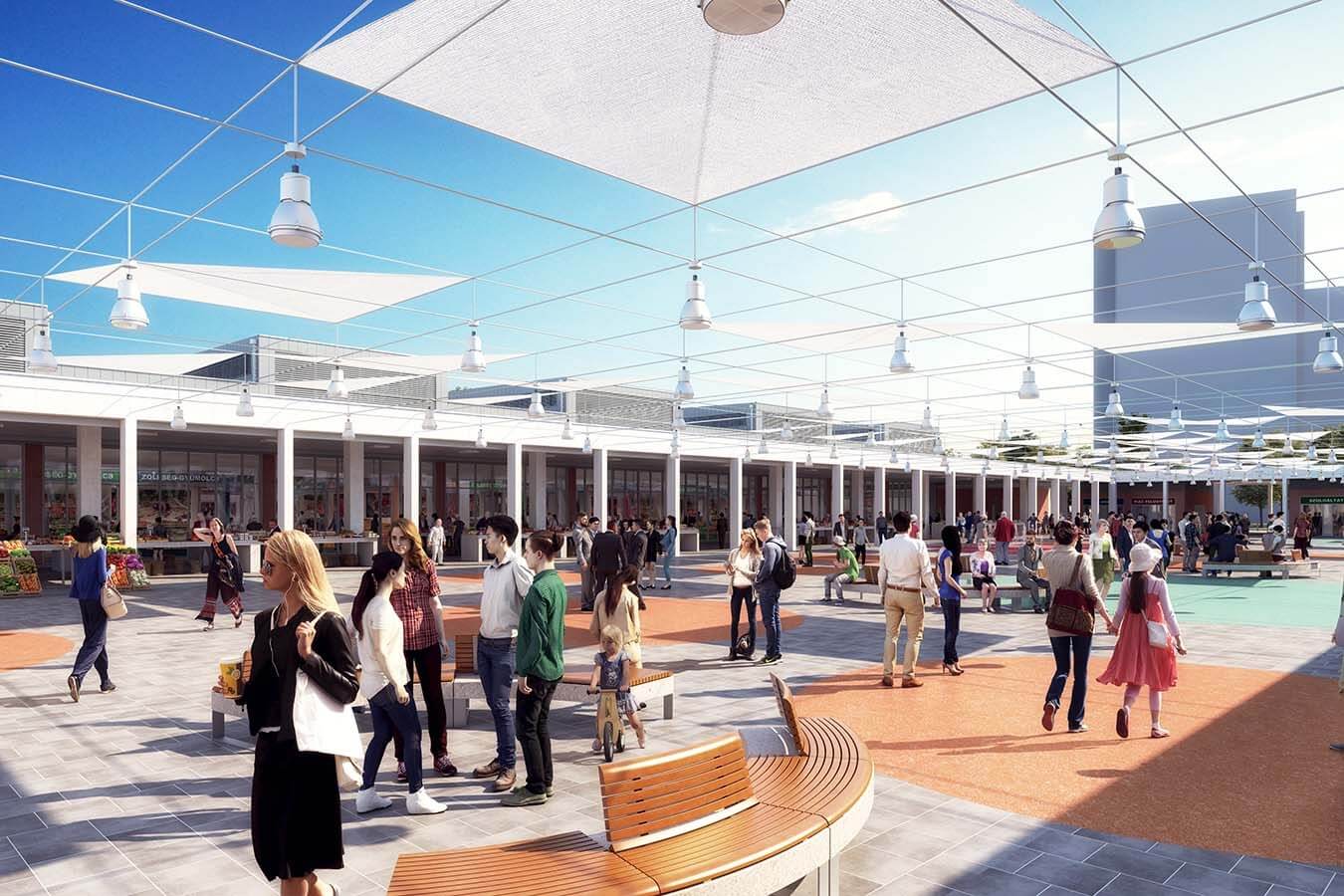 Az első ütem során – amely jelenleg zajlik – a csarnoképület építése valósul meg, a második ütemben pedig a pavilonos árusító és szolgáltató egységek, valamint a közösségi tér kerülnek kialakításra. A szakaszolt ütemezéssel lehetővé vált a jelenleg is működő, az 1970-es évek végén épült régi vásárcsarnok folyamatos üzemeltetése, hiszen az új csarnok a korábbi vállalkozói piac területén létesül. A régi csarnokban üzemelő árusok az új csarnok elkészültével és átadásával átköltözhetnek, és folytathatják az árusítást. A régi csarnok kiürítése után elbontásra kerül az épület, és megkezdik a második ütem építését, ahová kereskedelmi, vendéglátó és egyéb szolgáltató egységek költöznek. A második ütemben az árkádos közösségi tér is elkészül. Az optimális műszaki feltételeknek köszönhetően a téren színpad vagy jégpálya elhelyezésére is lehetőség lesz a jövőben.