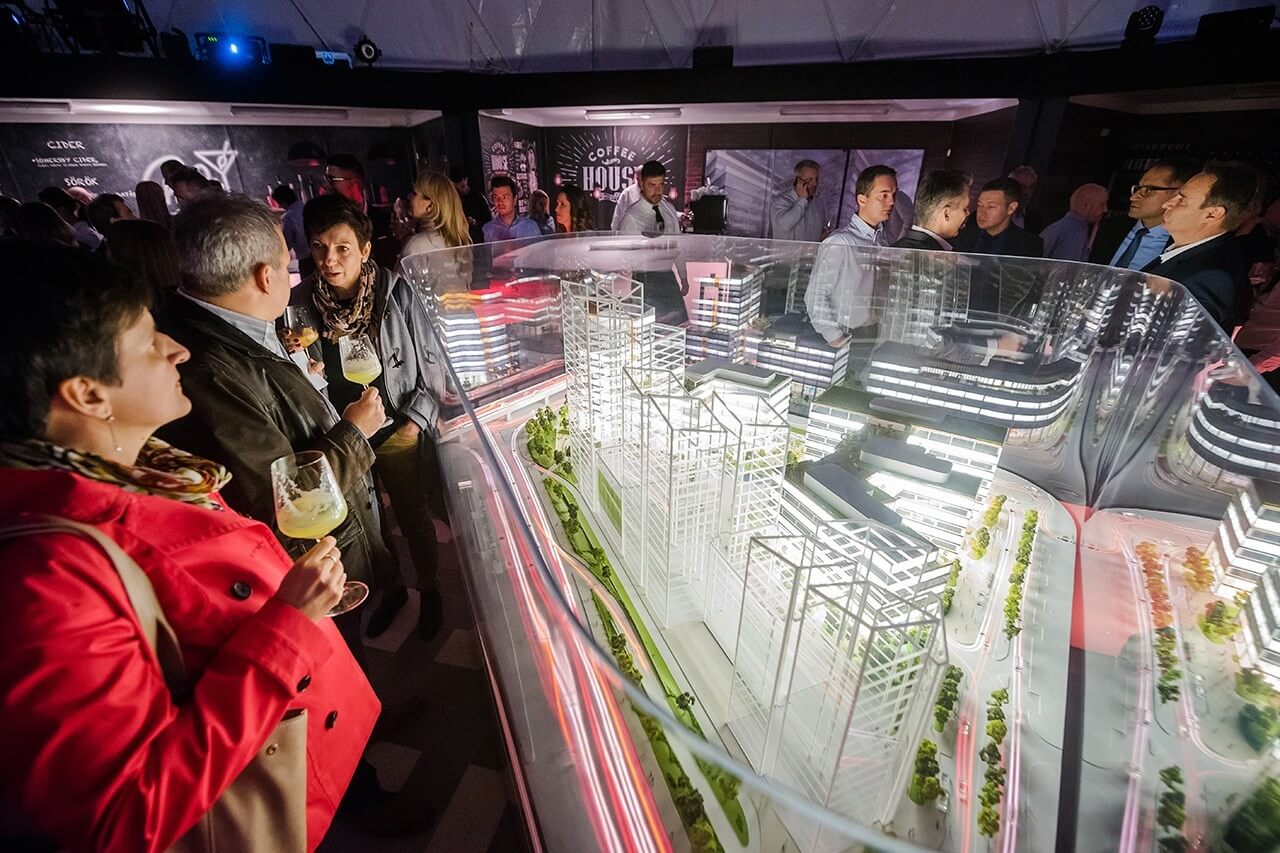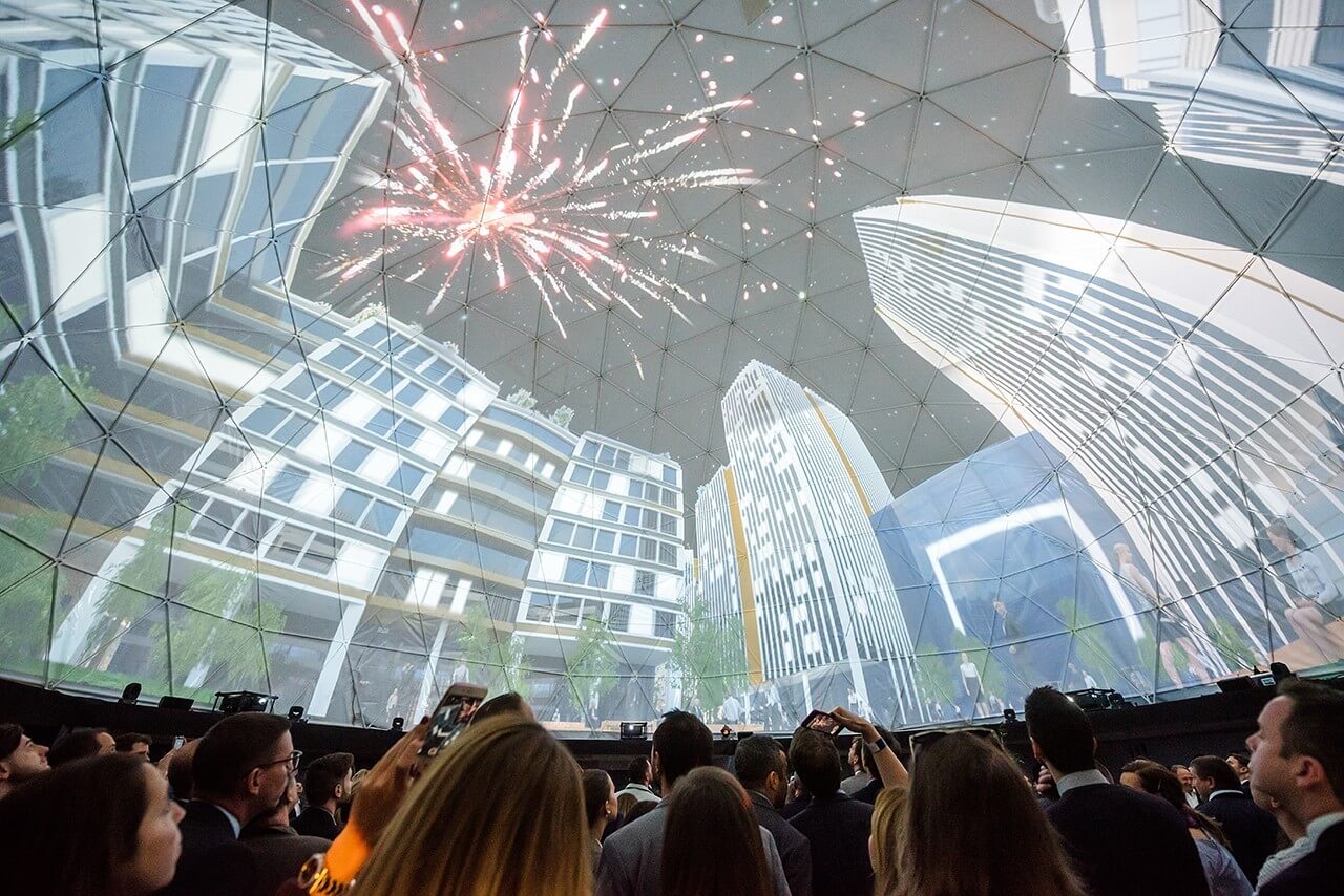 A látványos sajtóeseményen a zöld tereket előnyben létesítő Agora központi terének videóbemutatóját láthatták egy 360 fokos kivetítőn az rendezvény résztvevői, melynek felállítása 22 óráig tartott és egy 60 tonnás daru segítségével valósult meg - derül ki a beruházó közleményéből.