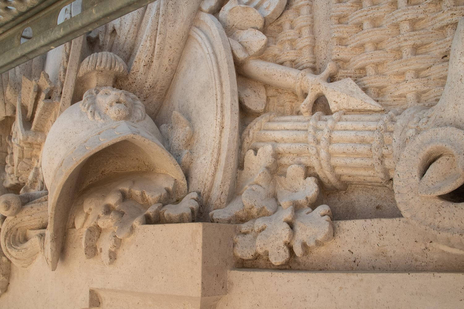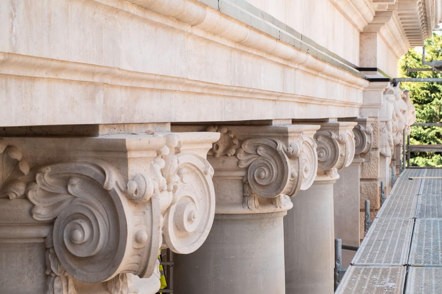 A szobrok stabilitásához nem tudták alkalmazni a hajdani épületnél felhasznált műszaki megoldásokat. A mostani épület bár kívülről ugyanúgy néz ki, mint az előde, épületszerkezetileg teljesen különböző. A ma érvényes szabályozások miatt nem kőhöz kapcsolódnak az alkotások, hanem egy stabil vasbeton szerkezethez.