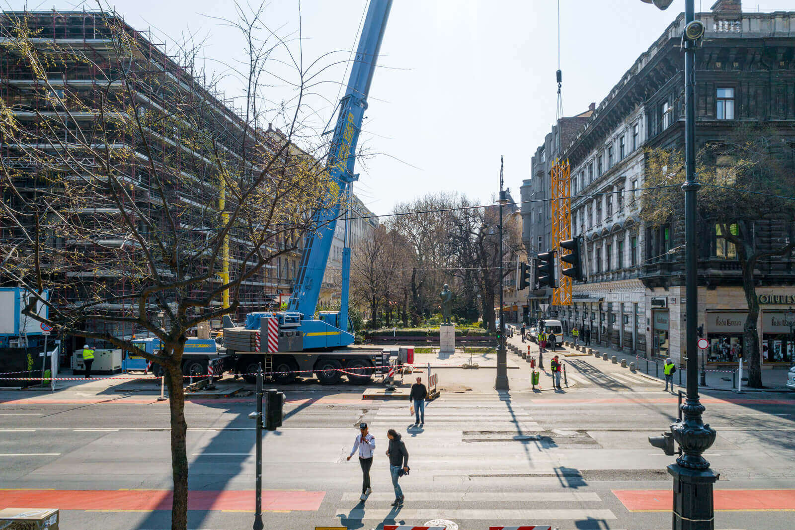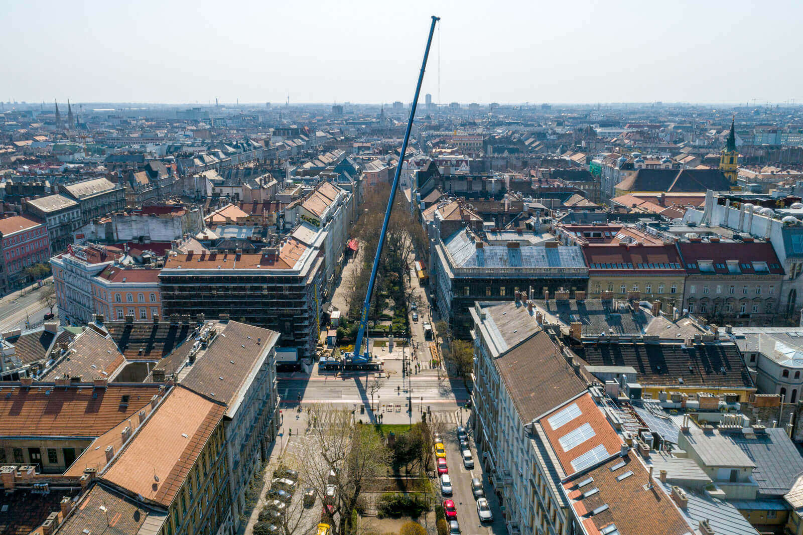 Ez a lépés komoly kihívást jelentett az Oktogon közelében fekvő terület szűkössége miatt. A toronydaru elemeit beemelő gépeket ugyanis egy szűk helyre kellett bejuttatni, és ott csak úgy lehetett ezekett pozícionálni, hogy a gépkezelők semmit nem láttak a munkafolyamatból.
