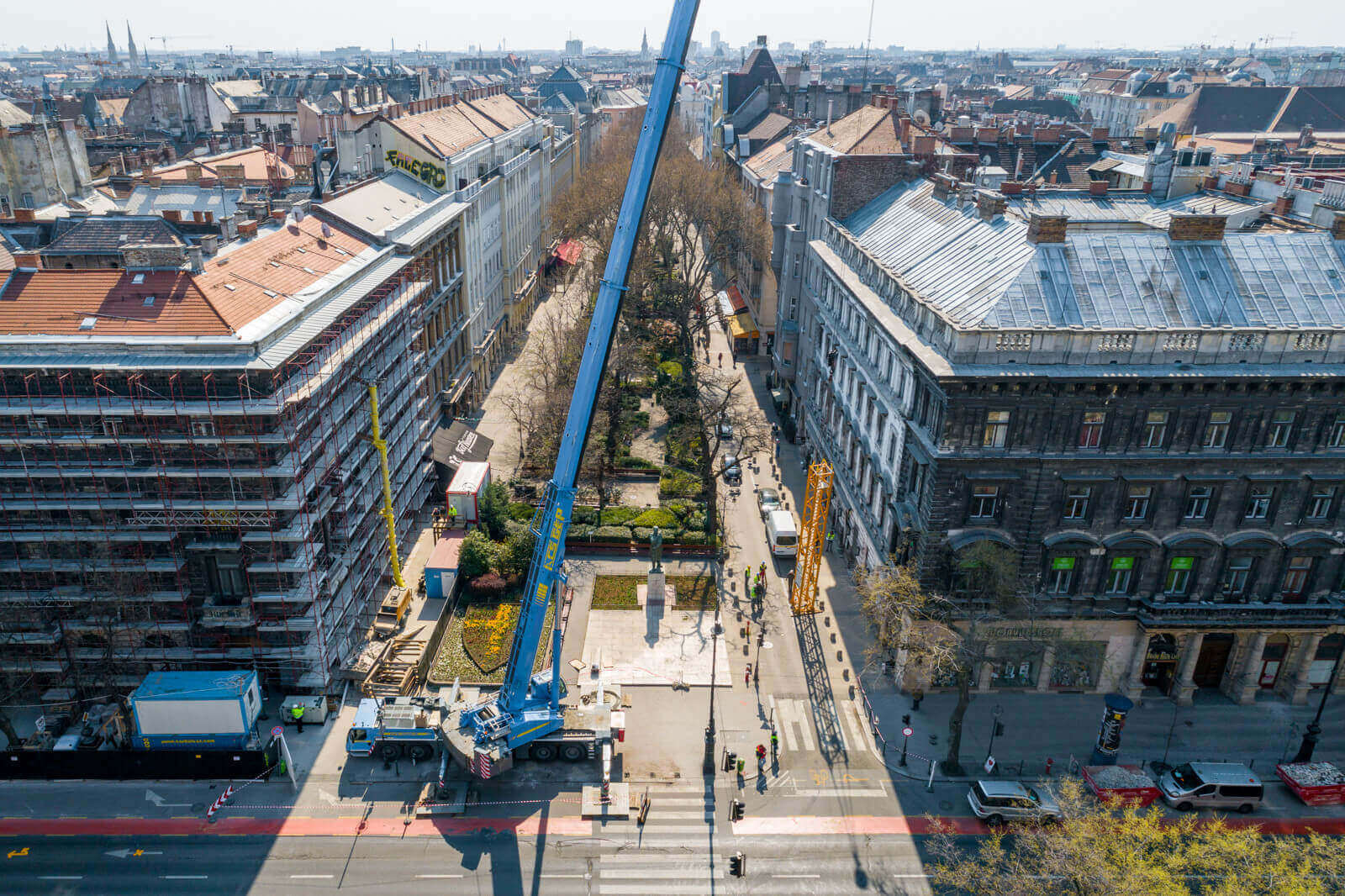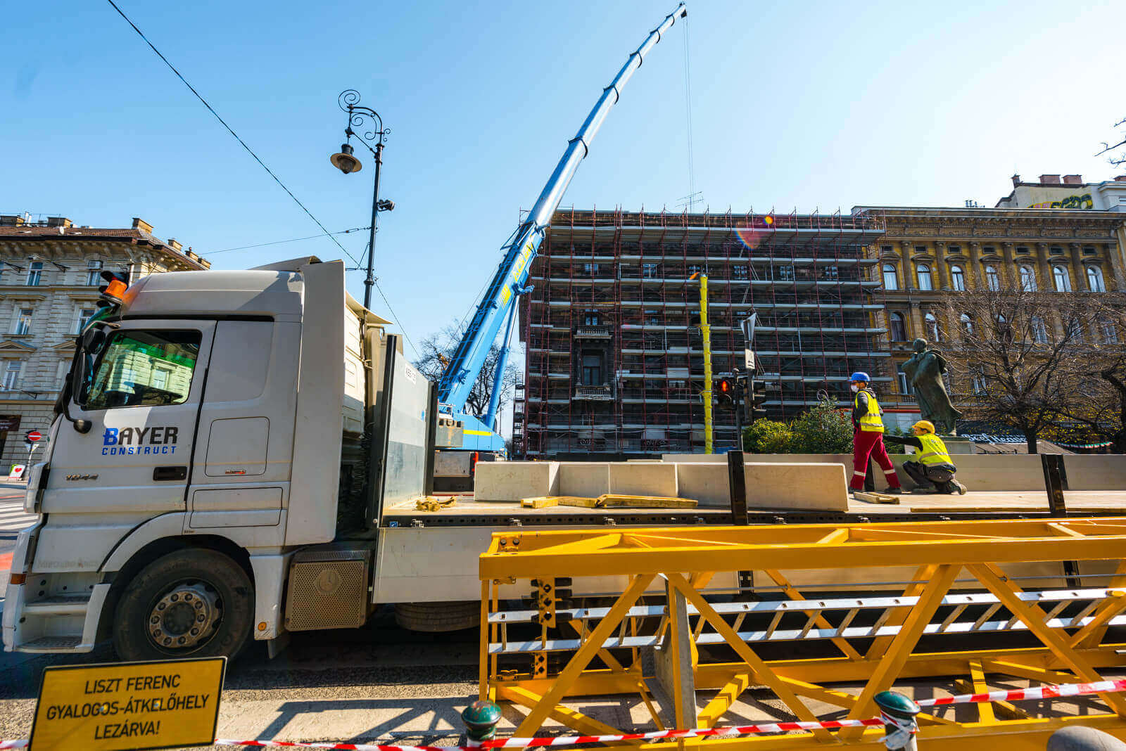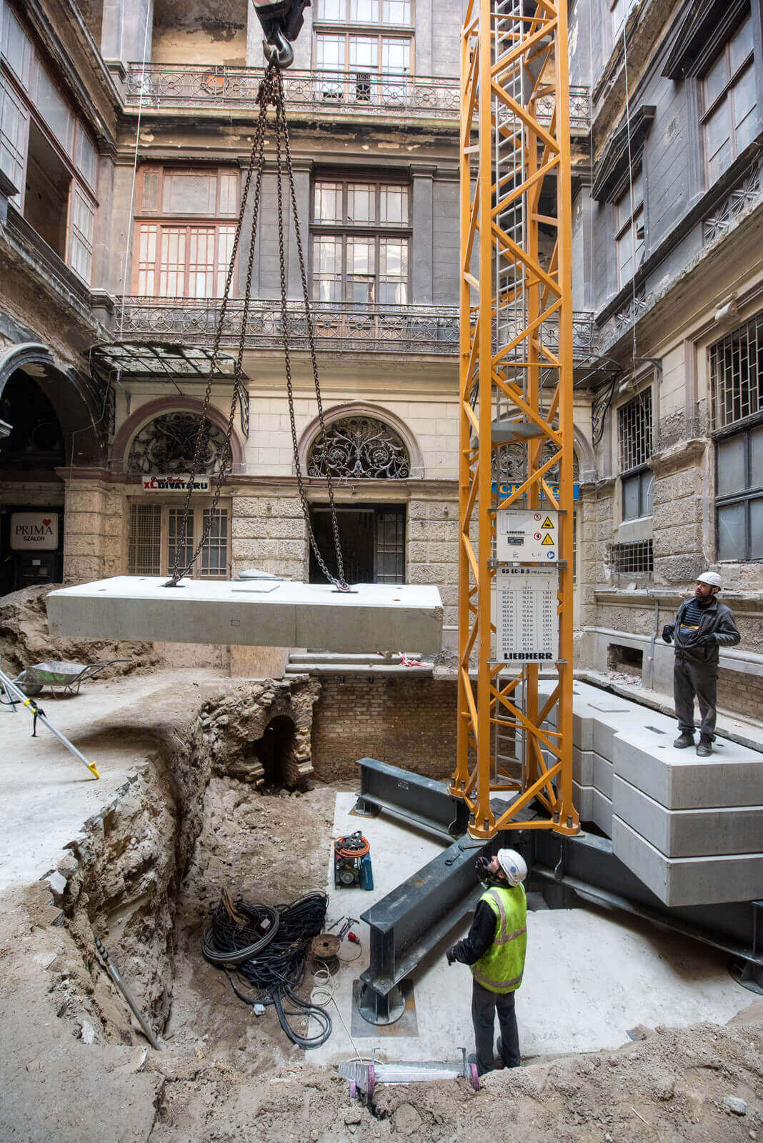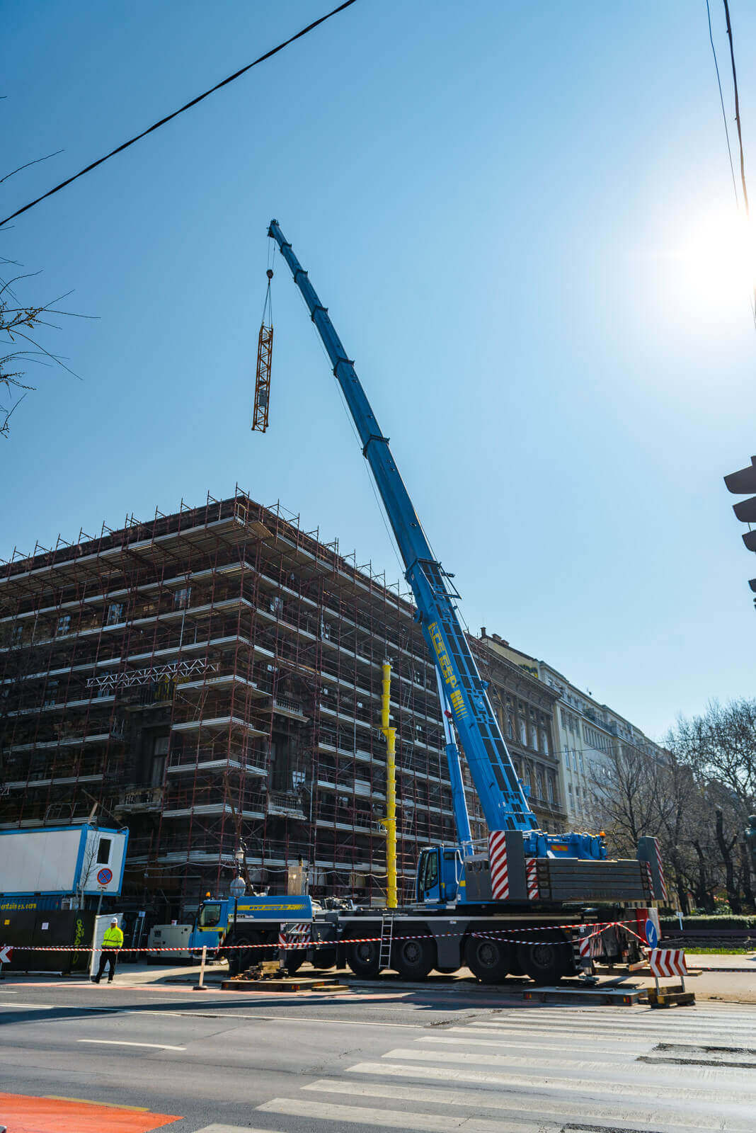 A februárban indult kivitelezés szombaton fontos fázishoz érkezett, megérkeztek az építkezéshez szükséges toronydaru elemei – értesült lapunk a kivitelező Bayer Construct szakembereitől. A műveletben a Liszt Ferenc tér felől egy Liebherr 85 EC-B5 Fr.Tronic toronydarut telepítettek a munkaterületre, 75 tonna talpsúllyal, a munkát egy 300 tonnás kategóriájú Liebherr 1300 autódaru támogatta.