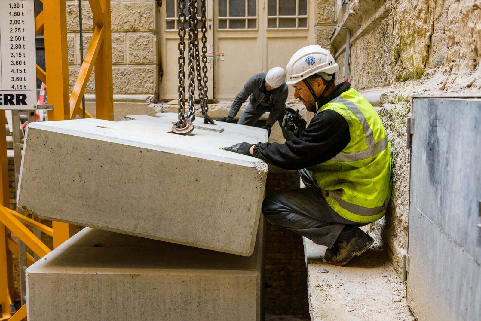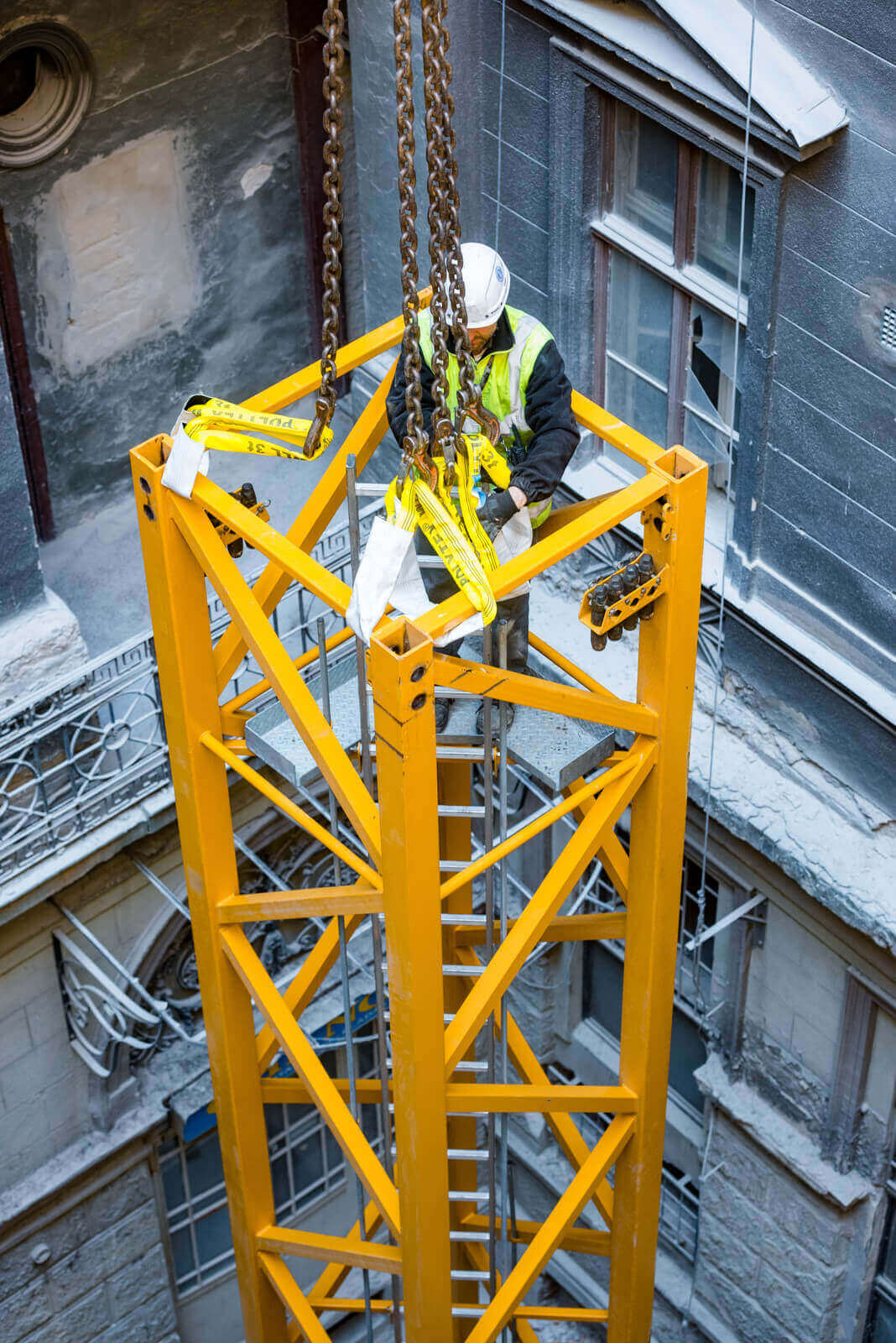Így kizárólag rádión keresztül tudták irányítani a toronydaru elemek beemelését. További kihívás, hogy a daru összeszereléséhez is rendkívül szűk munkaterület áll rendelkezésre.