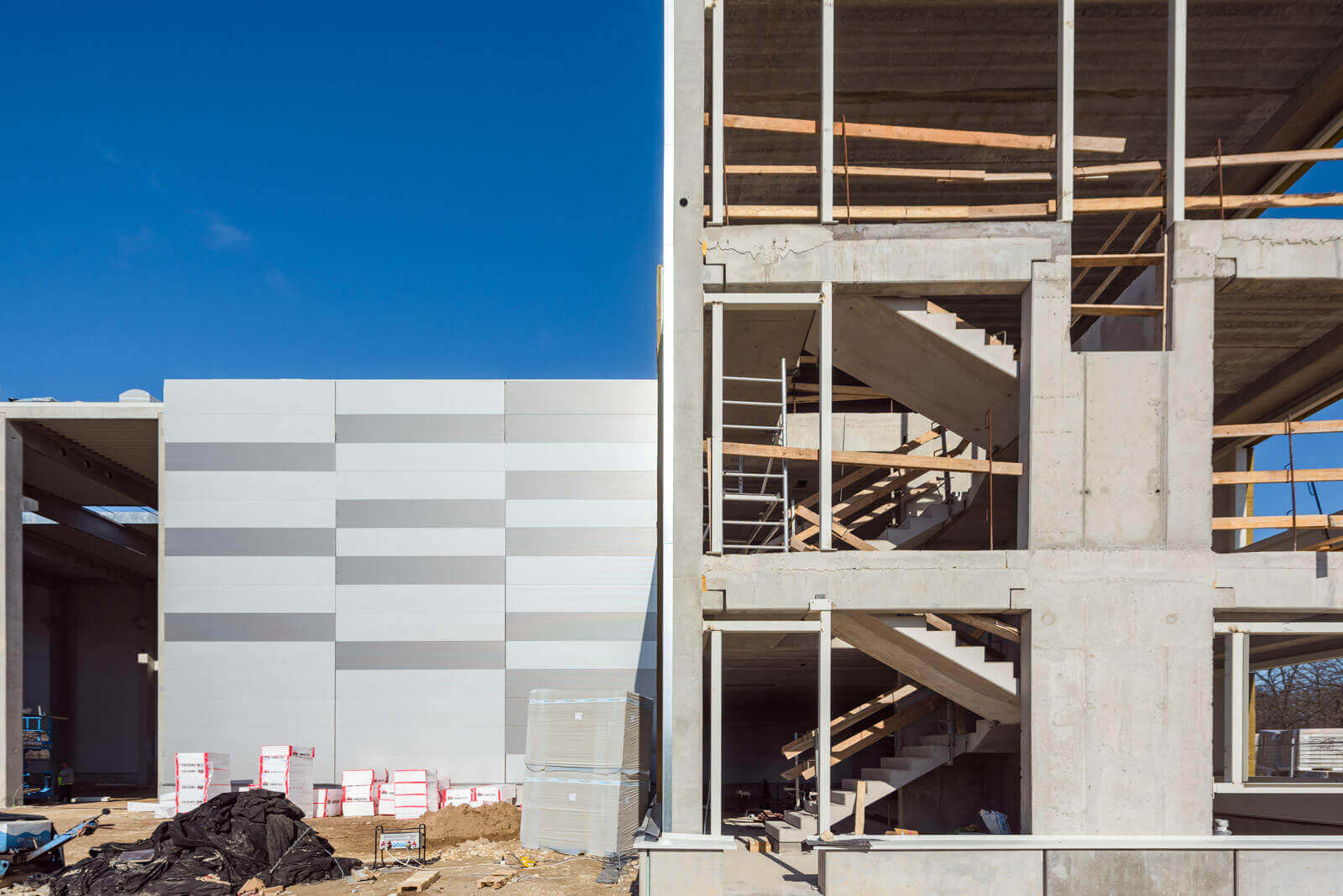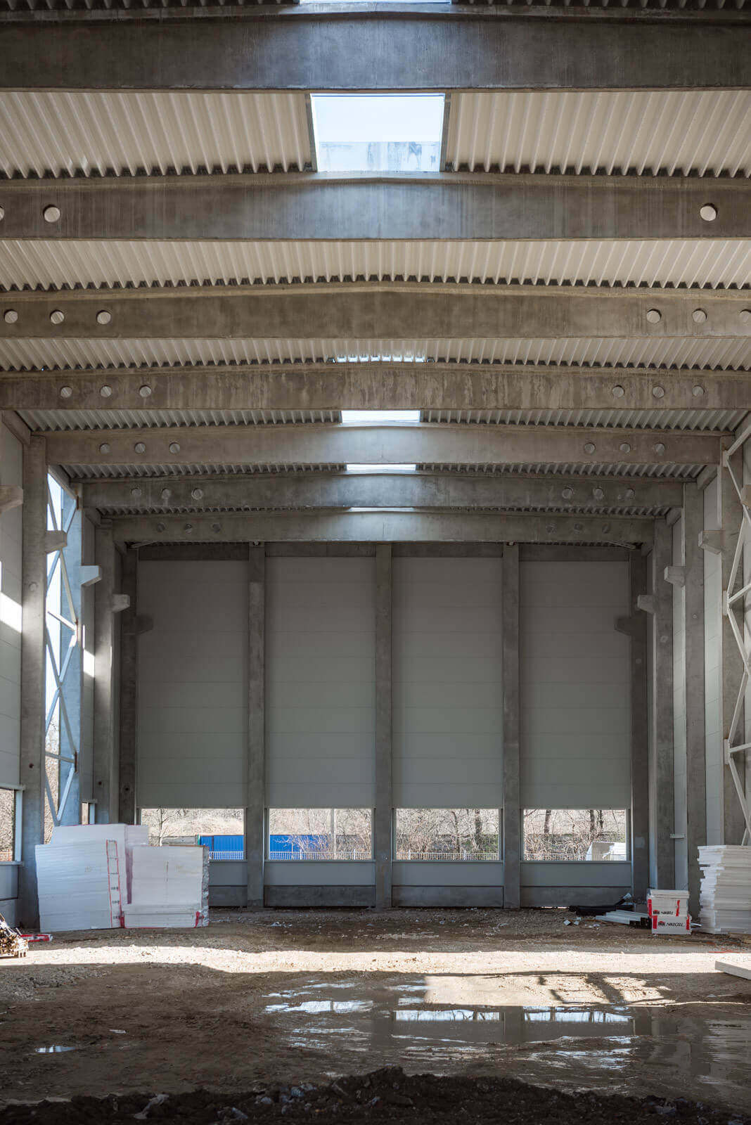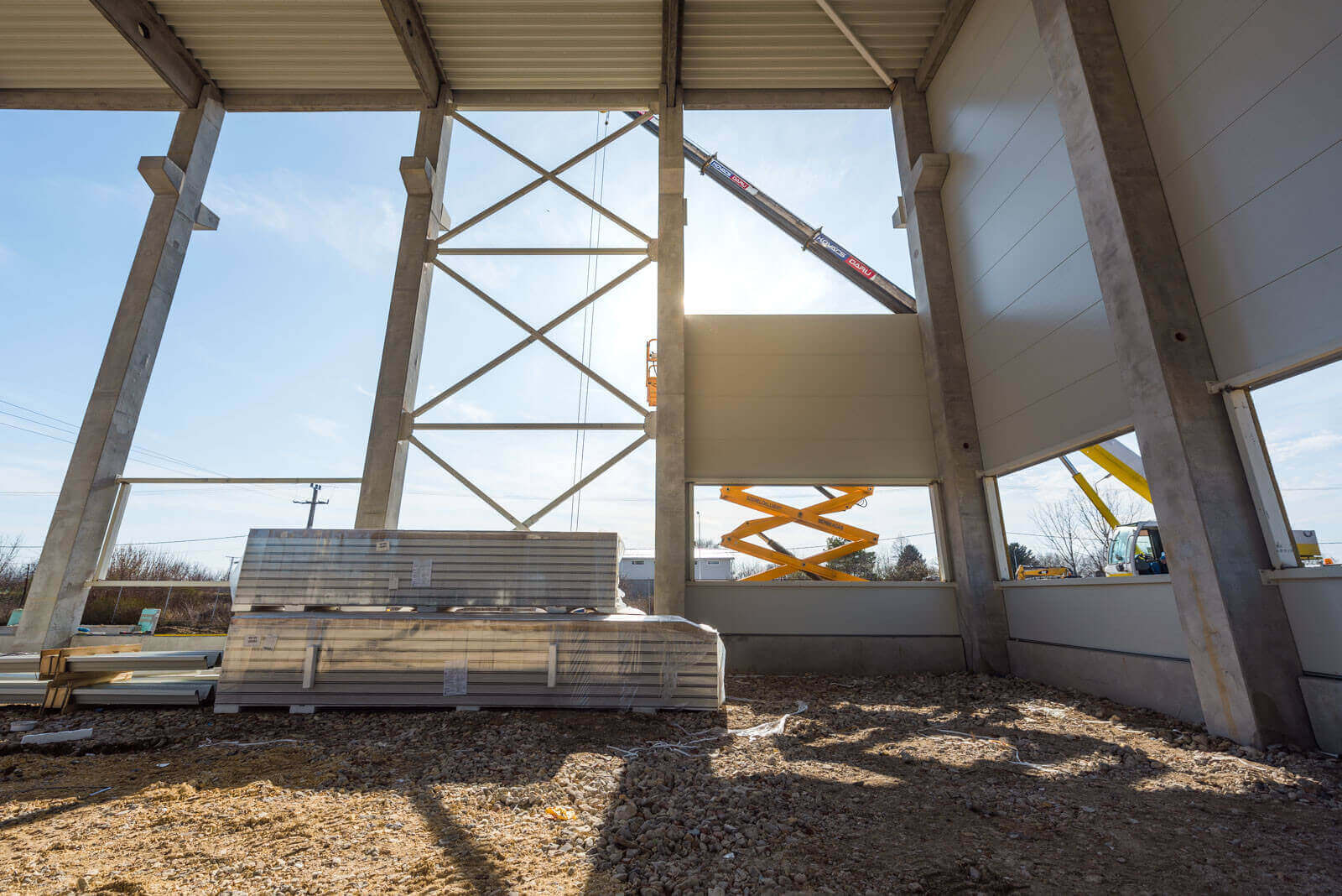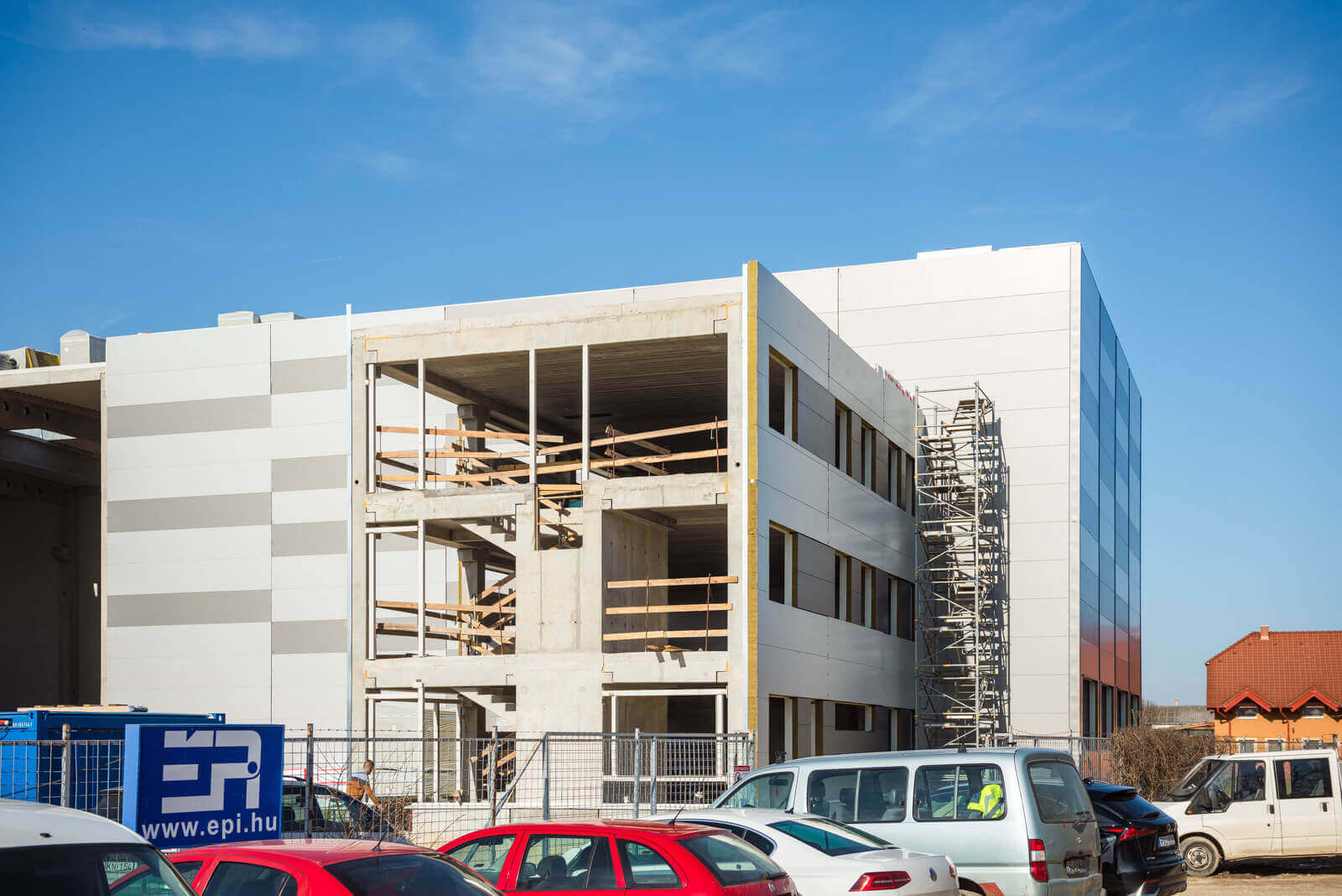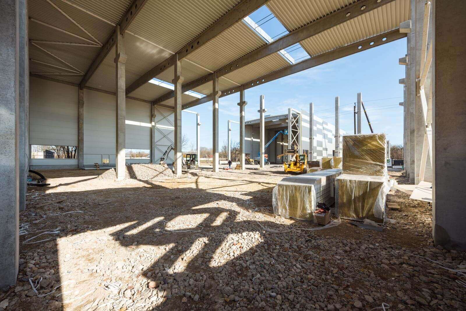 Az épület homlokzati zárását követően a belső szakipari munkák, a technológiai berendezések alapozásai és a csarnok ipari padlójának elkészítése kezdődik meg.