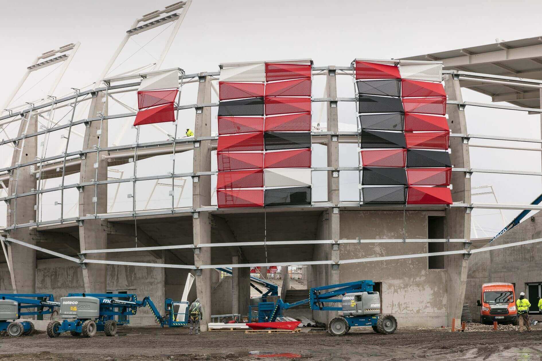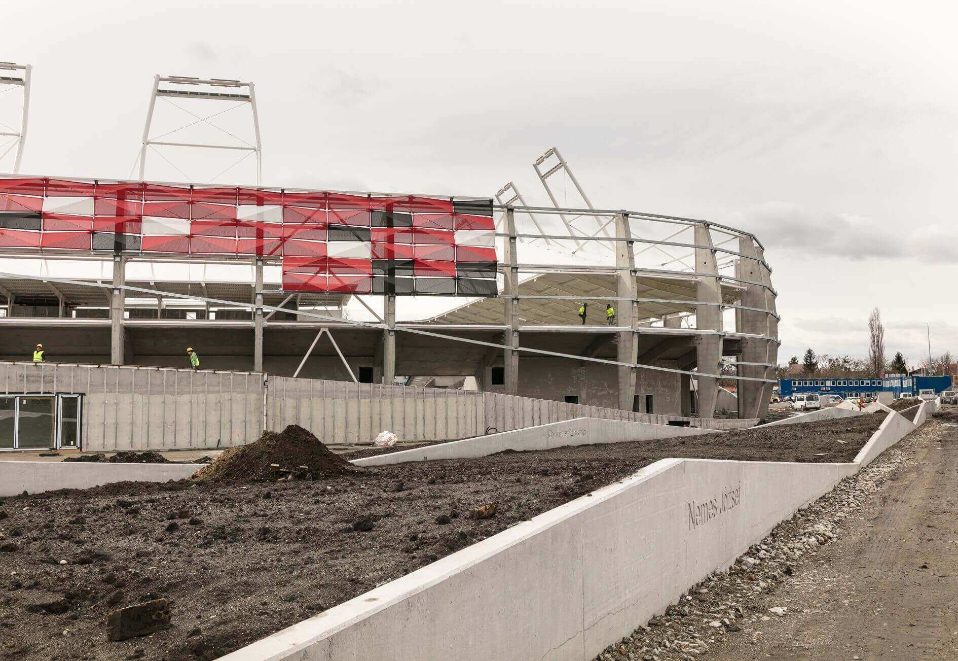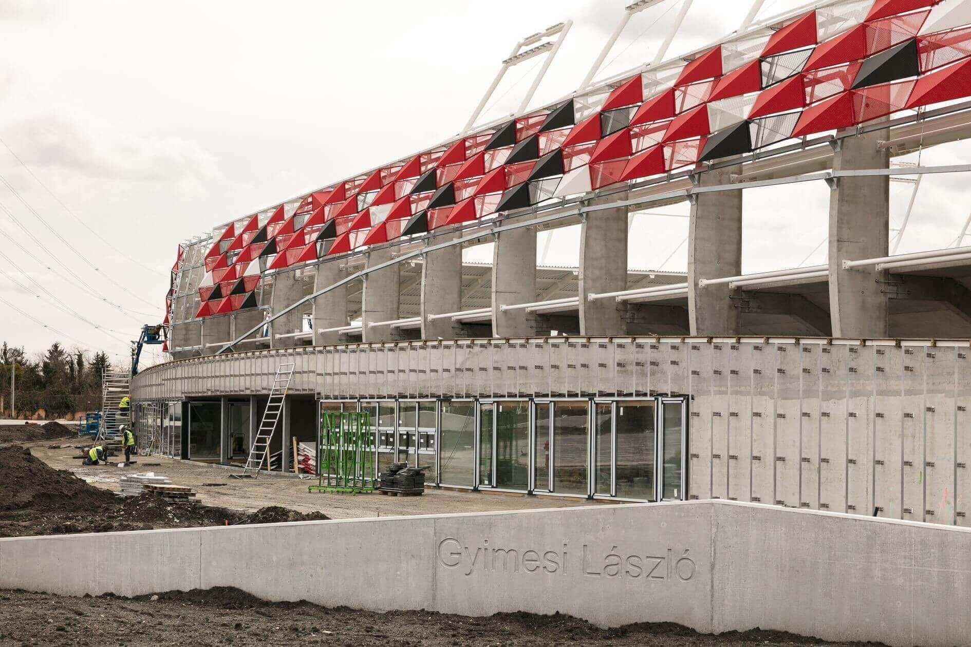 Ahogy azt korábban már megírtuk, december közepén a létesítmény elérte legmagasabb pontját és felkerült rá a bokréta, most azonban már a külső színes borítólemezeket erősítik fel a szakemberek. A stadion alapozásához, valamint a felszerkezet falainak, pilléreinek és födémeinek zsaluzásához is a PERI termékeit használták a kivitelezők. A stadion alapkövét 2019 márciusában rakták le.