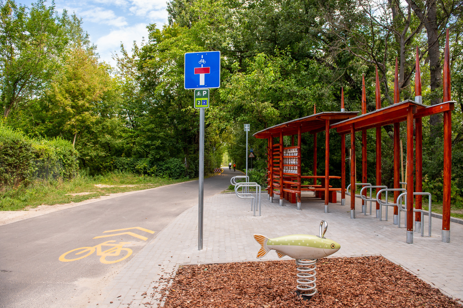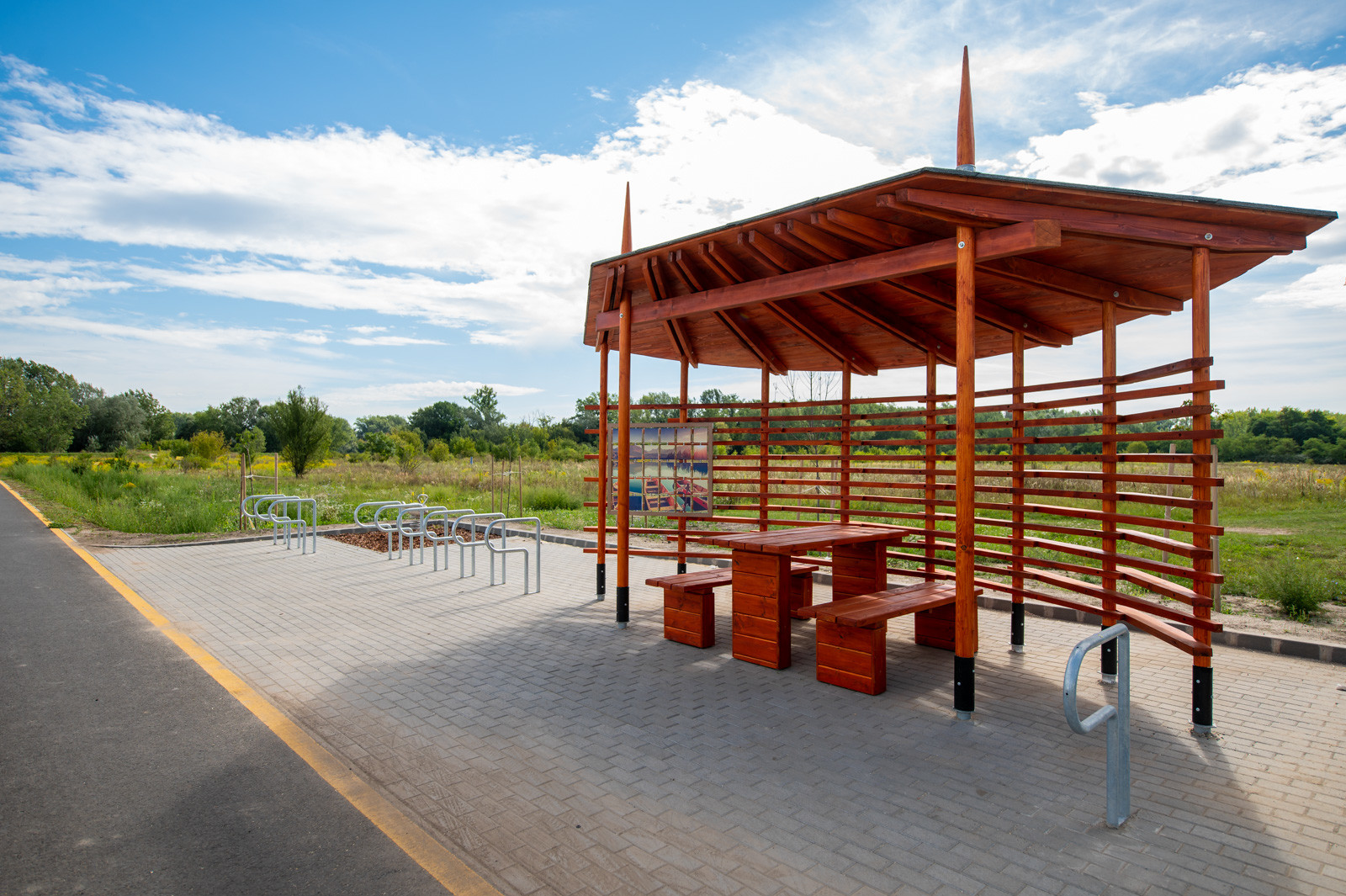 Az elsősorban turisztikai célokat szolgáló, kényelmes, 3,30 m széles kerékpárúton 22 db forgalomcsillapító sorompó segíti a biztonságos közlekedést. Az ivókutakkal is felszerelt egyedi kialakítású pihenőhelyeken igényes játékok is biztosítják a felhőtlen kikapcsolódást, a kétnyelvű információs táblák pedig a környékbeli látnivalók felfedezését segítik.