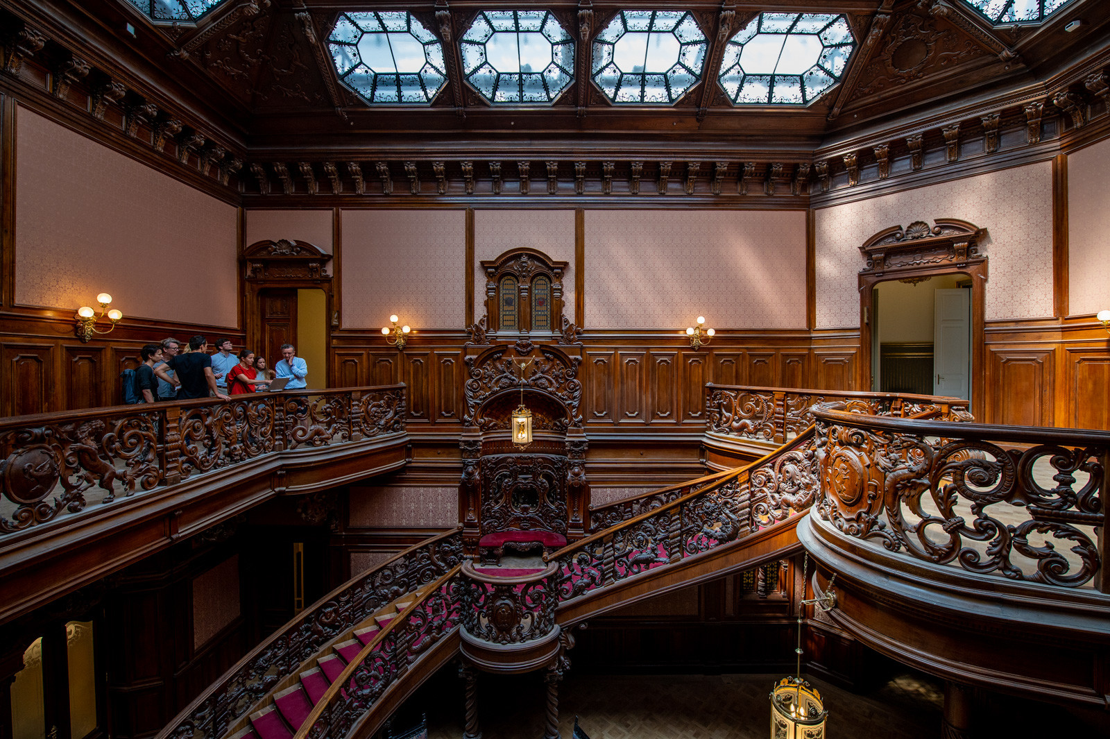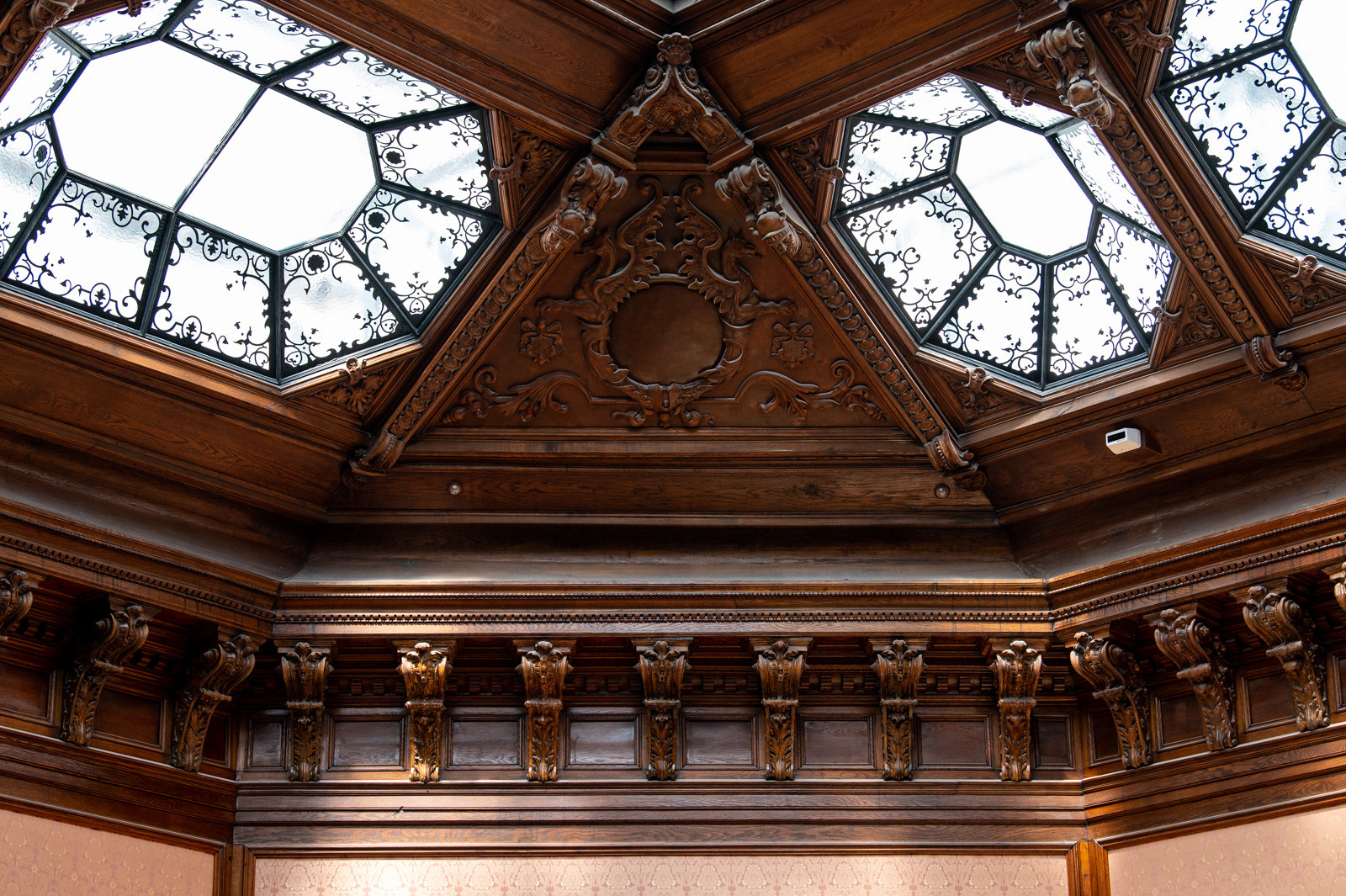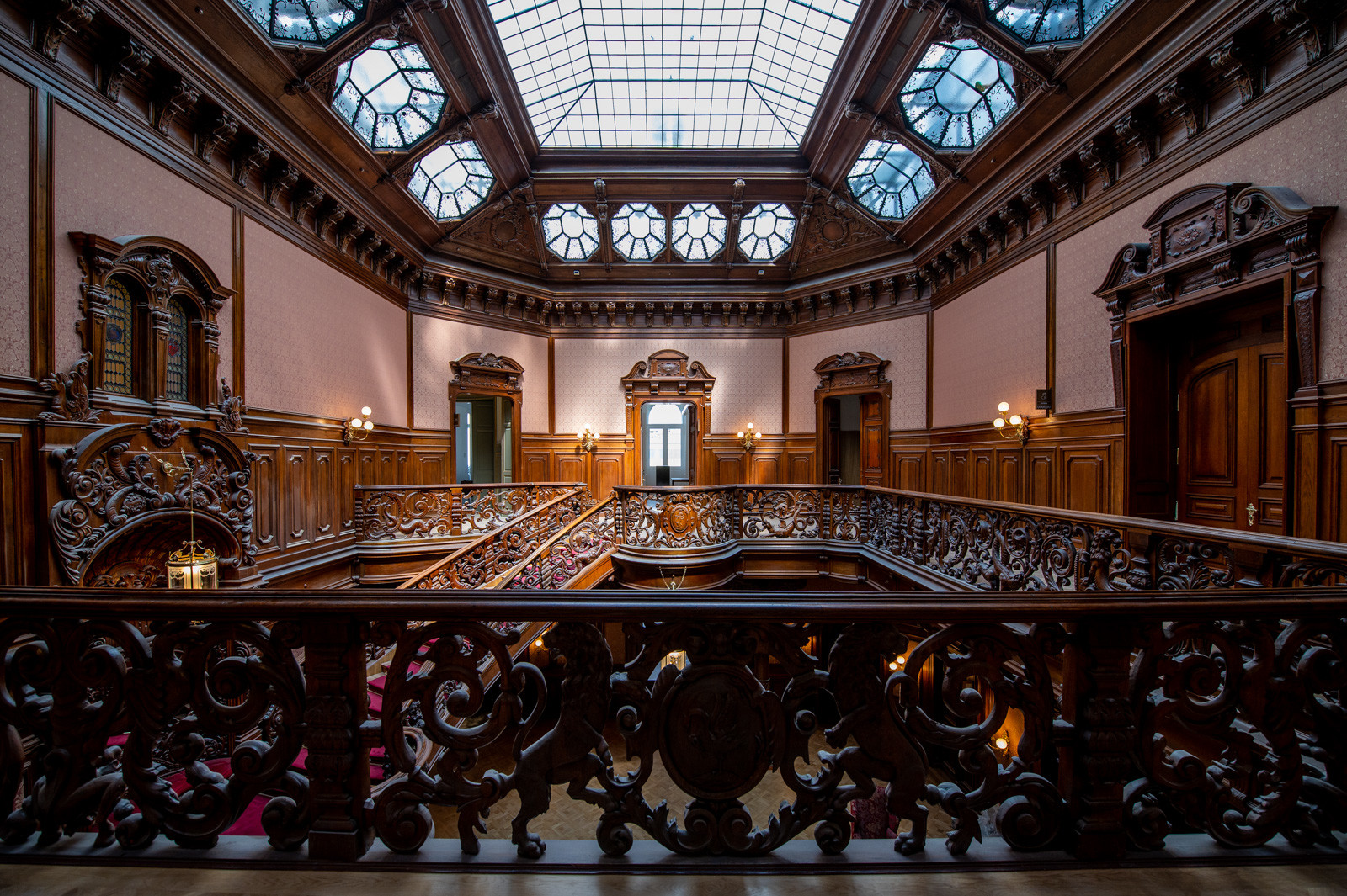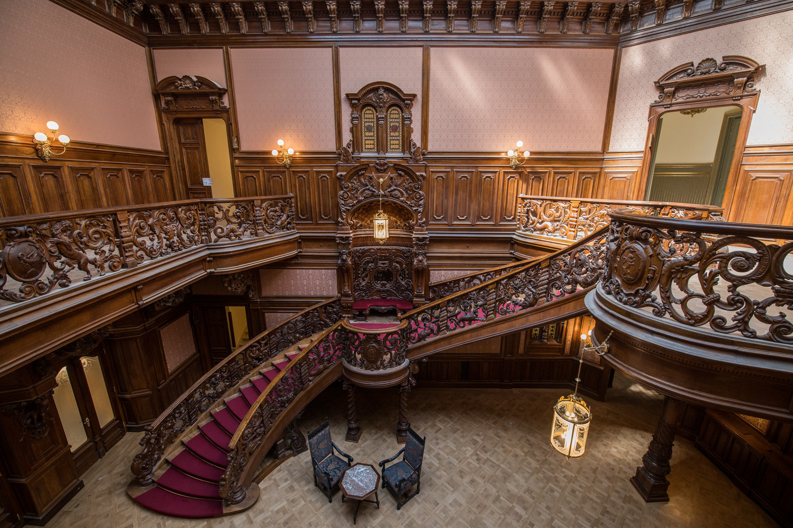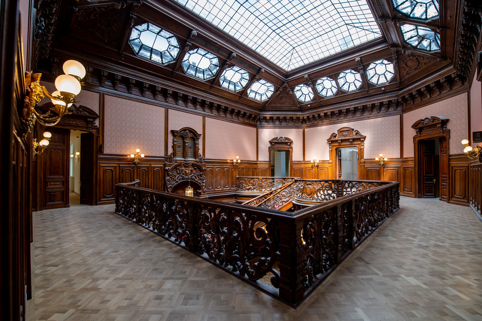 A földszinti hall díszes faragványai Thék Endre asztalosmester keze nyomát viselik.