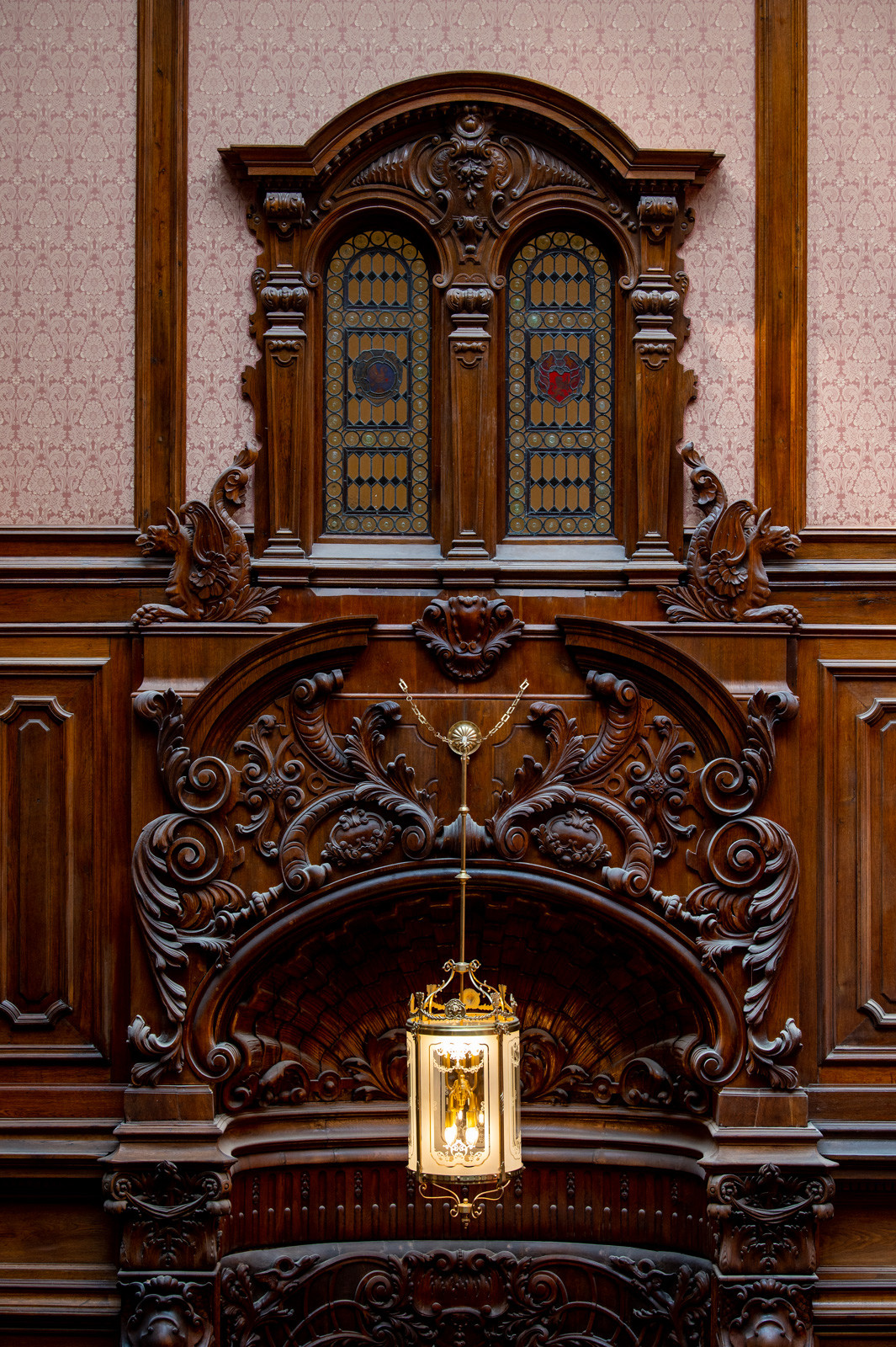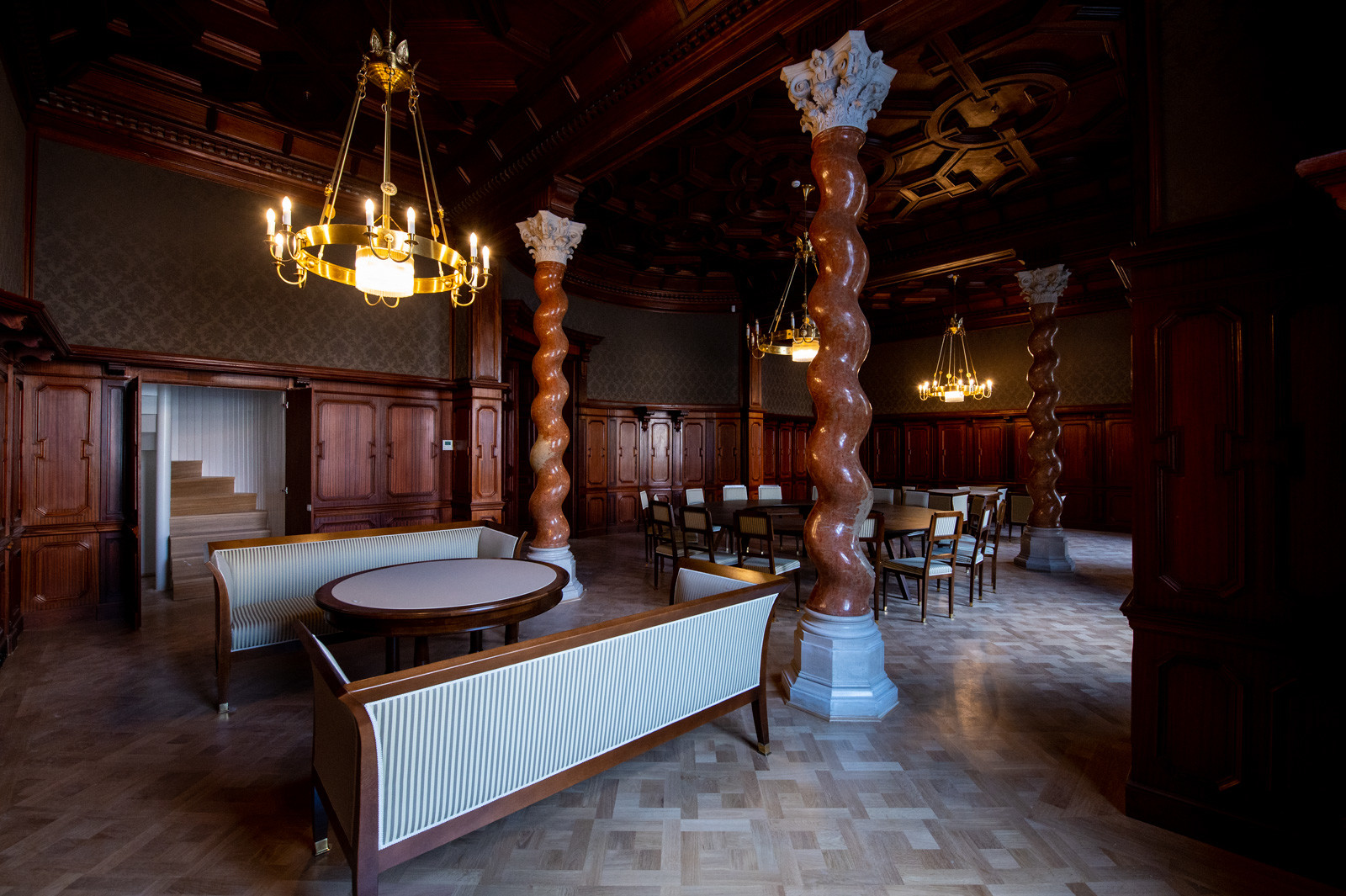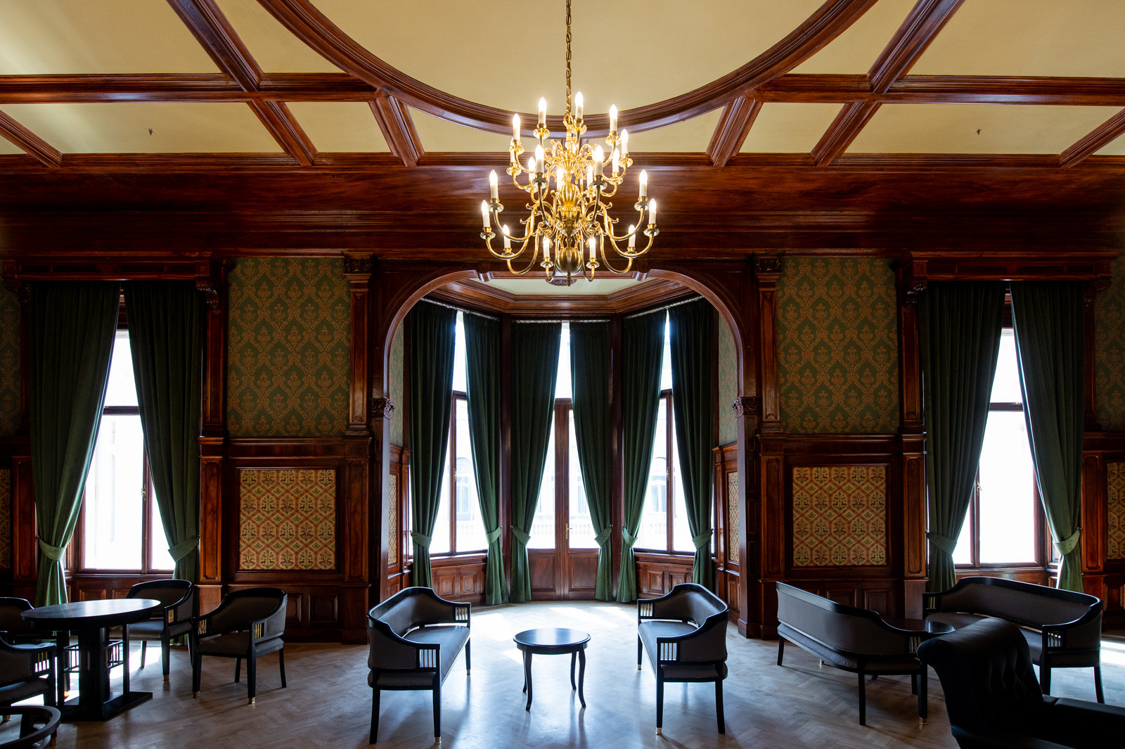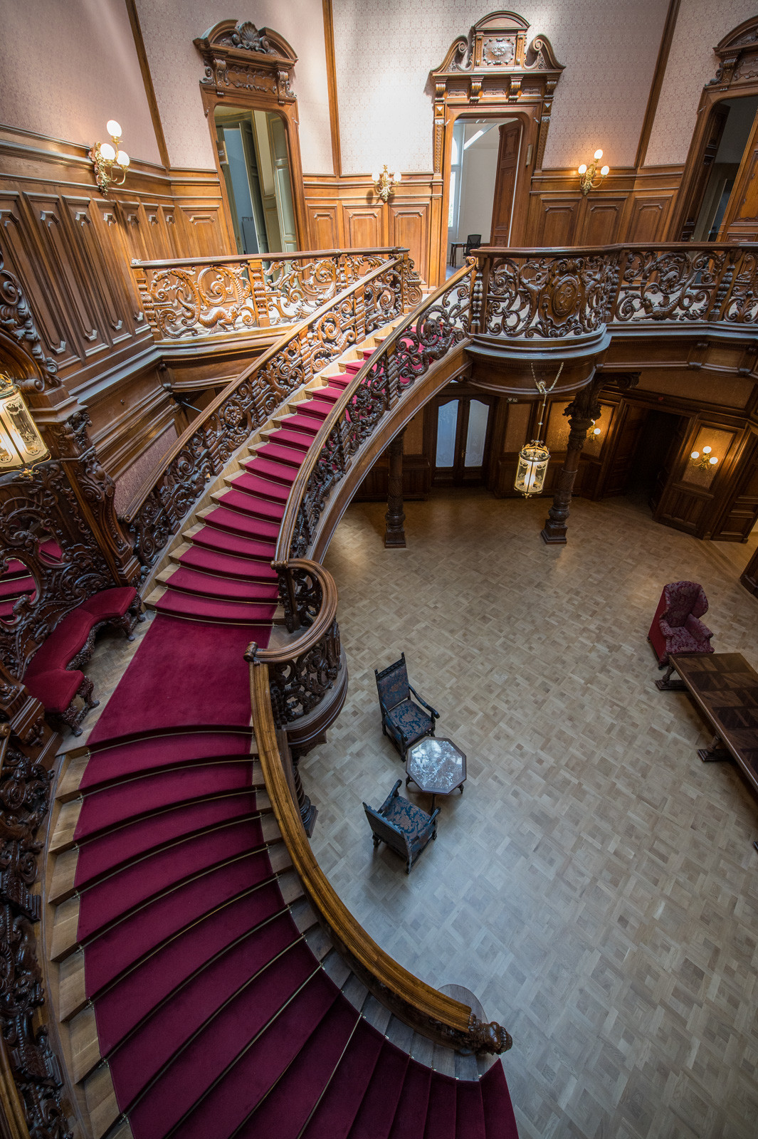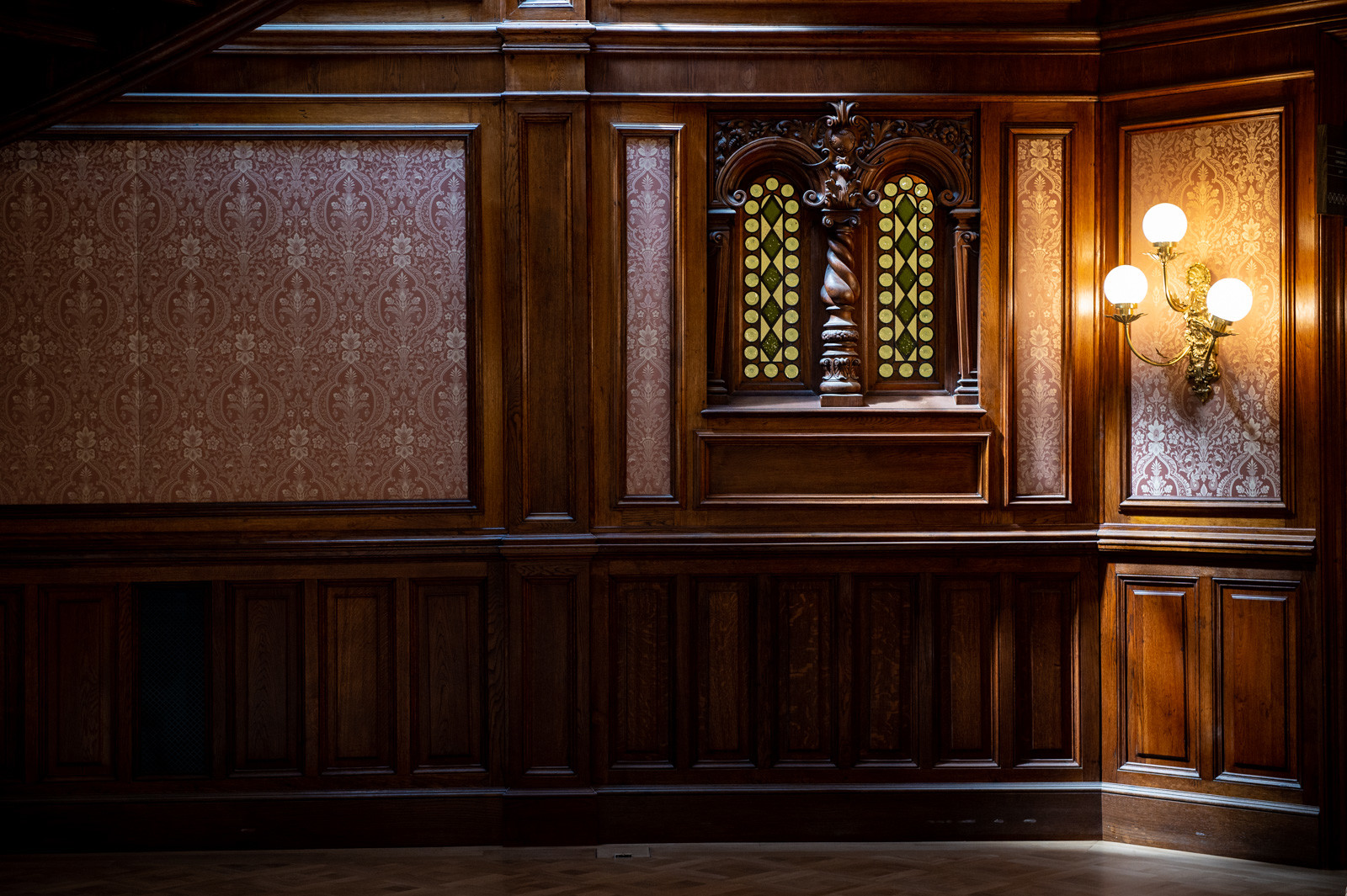 A földszinti hall díszes faragványai Thék Endre asztalosmester keze nyomát viselik.