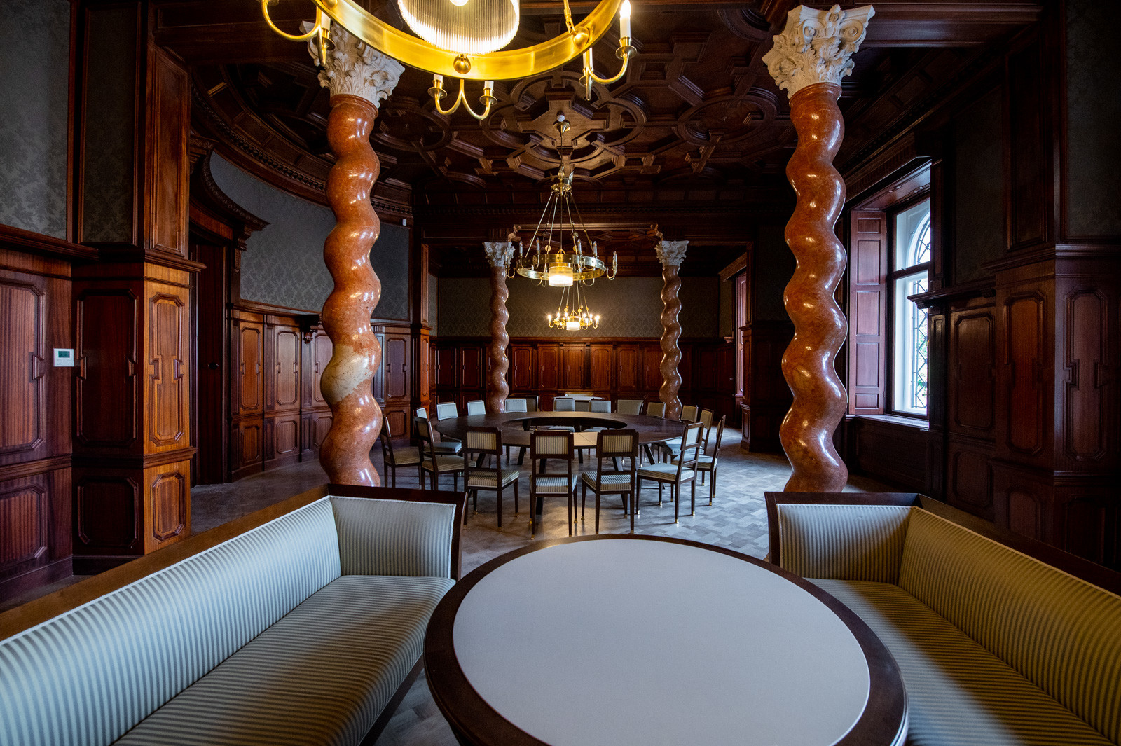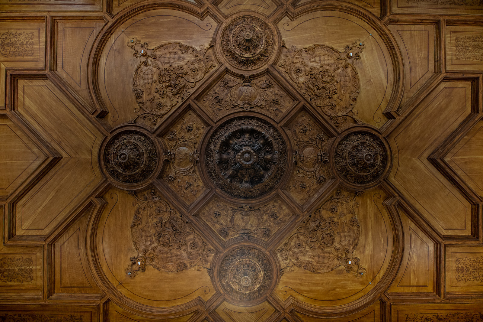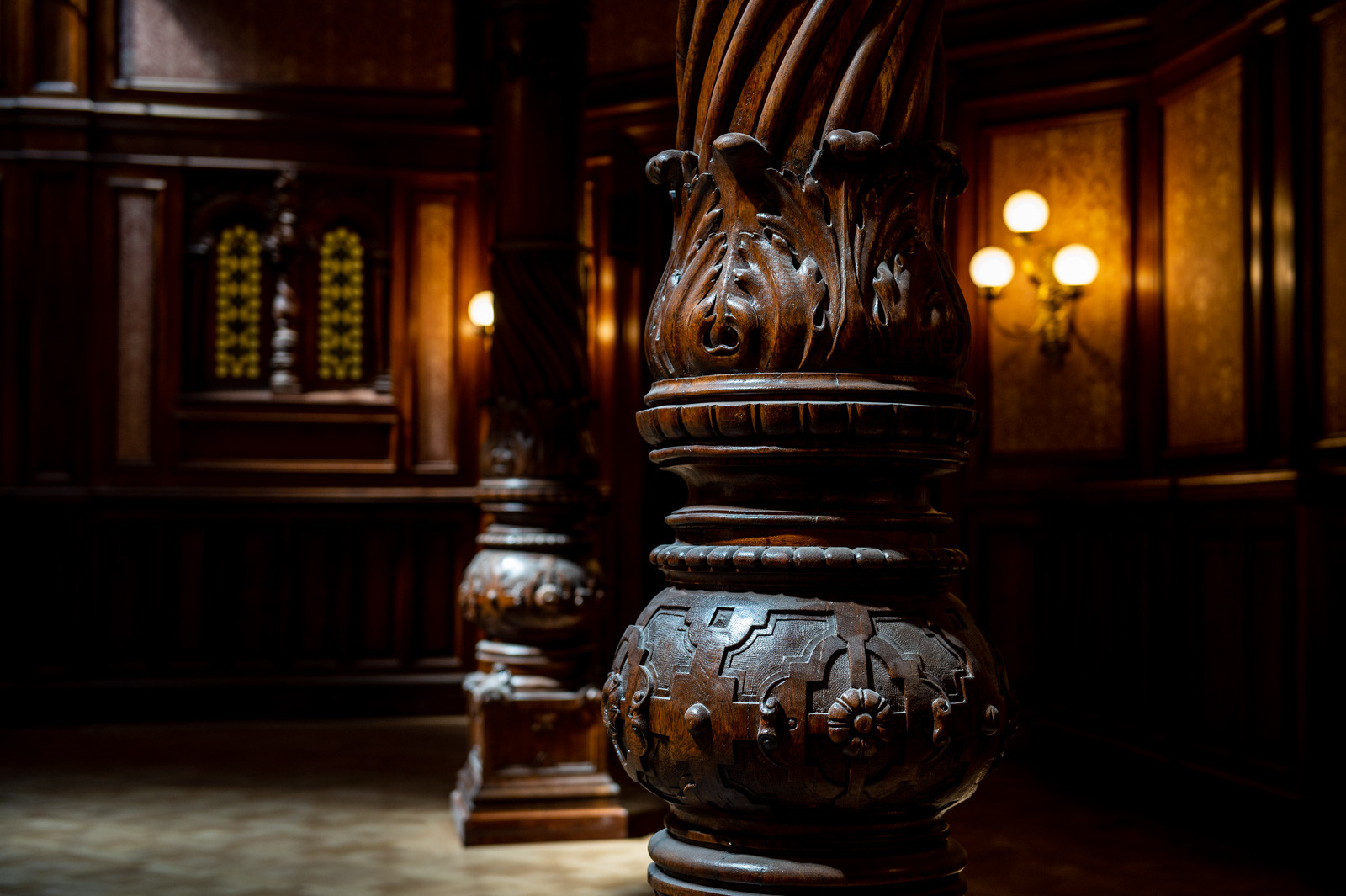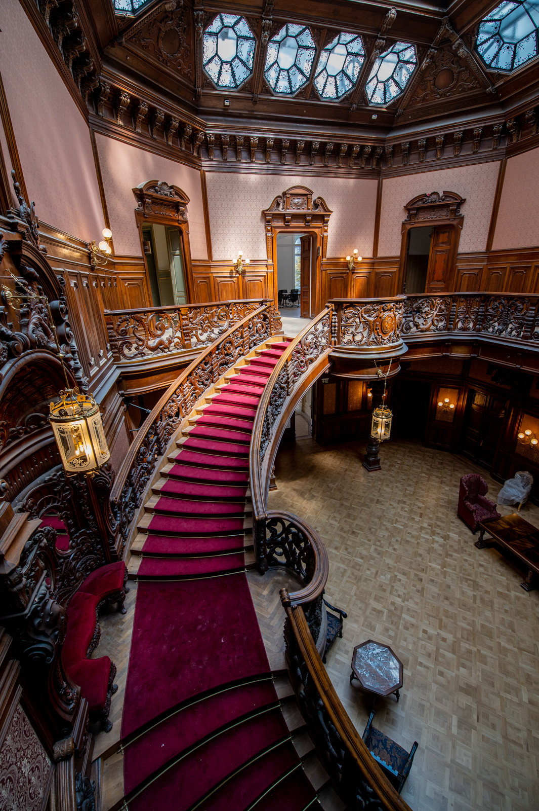 A földszinti hall díszes faragványai Thék Endre asztalosmester keze nyomát viselik.