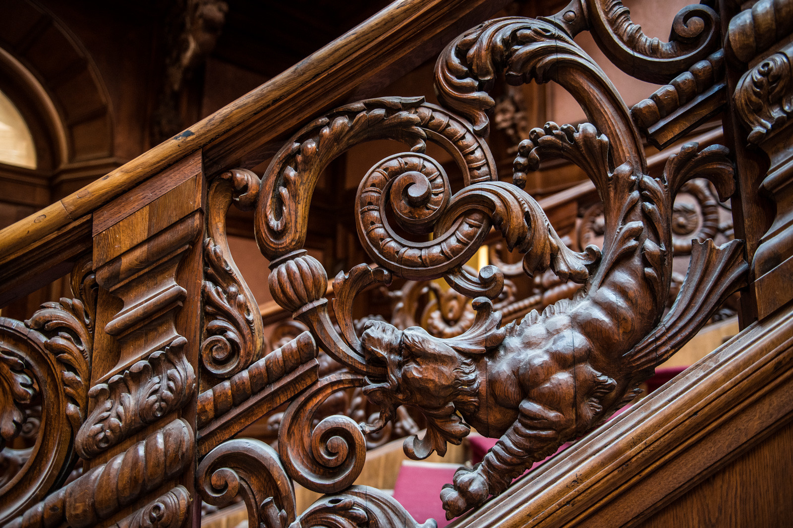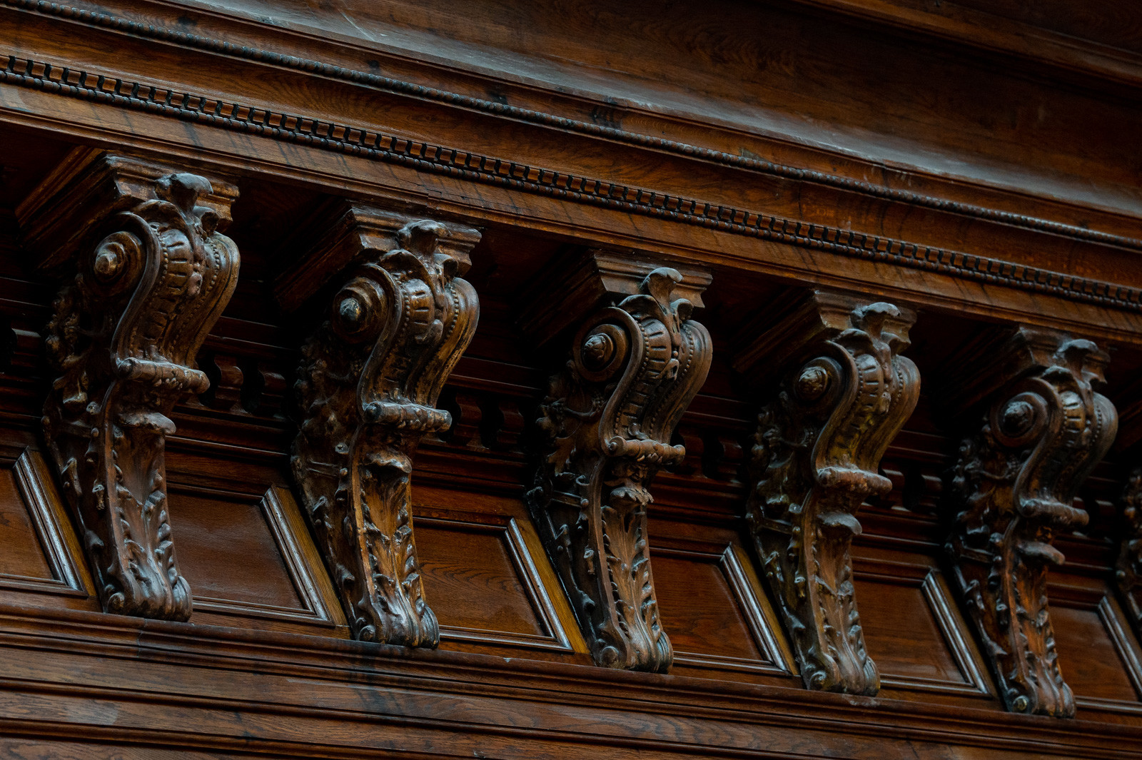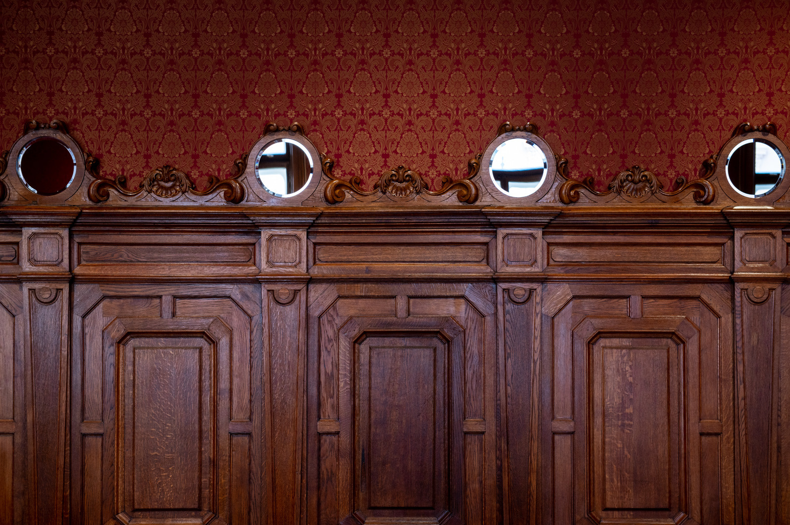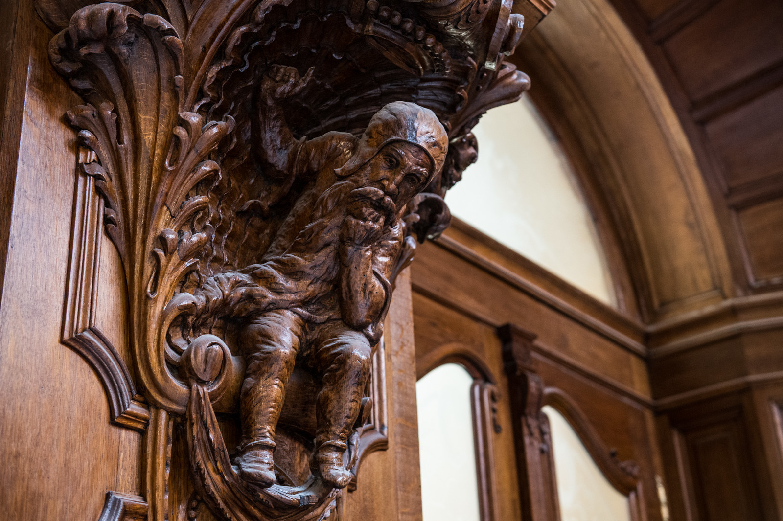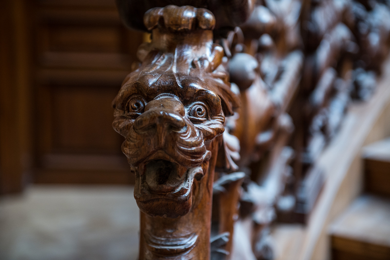 A földszinti hall díszes faragványai Thék Endre asztalosmester keze nyomát viselik.