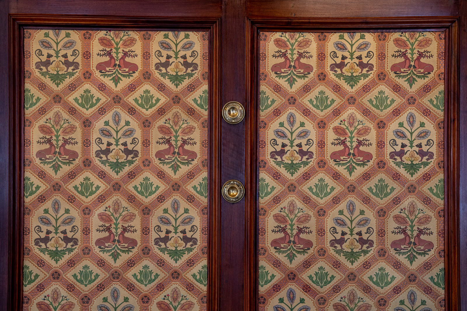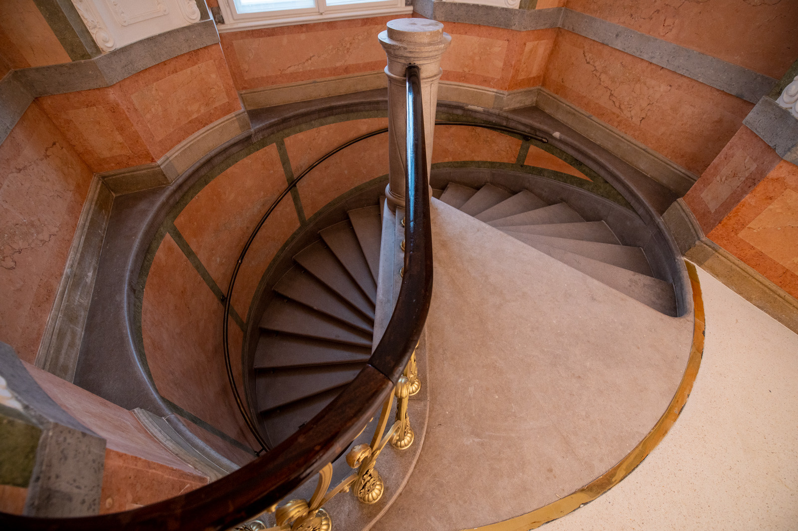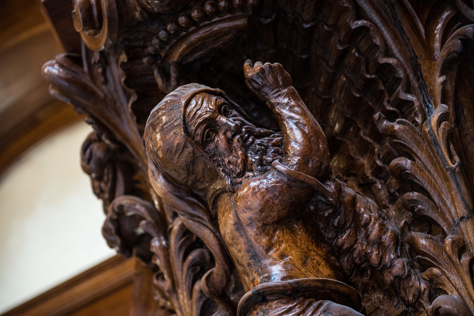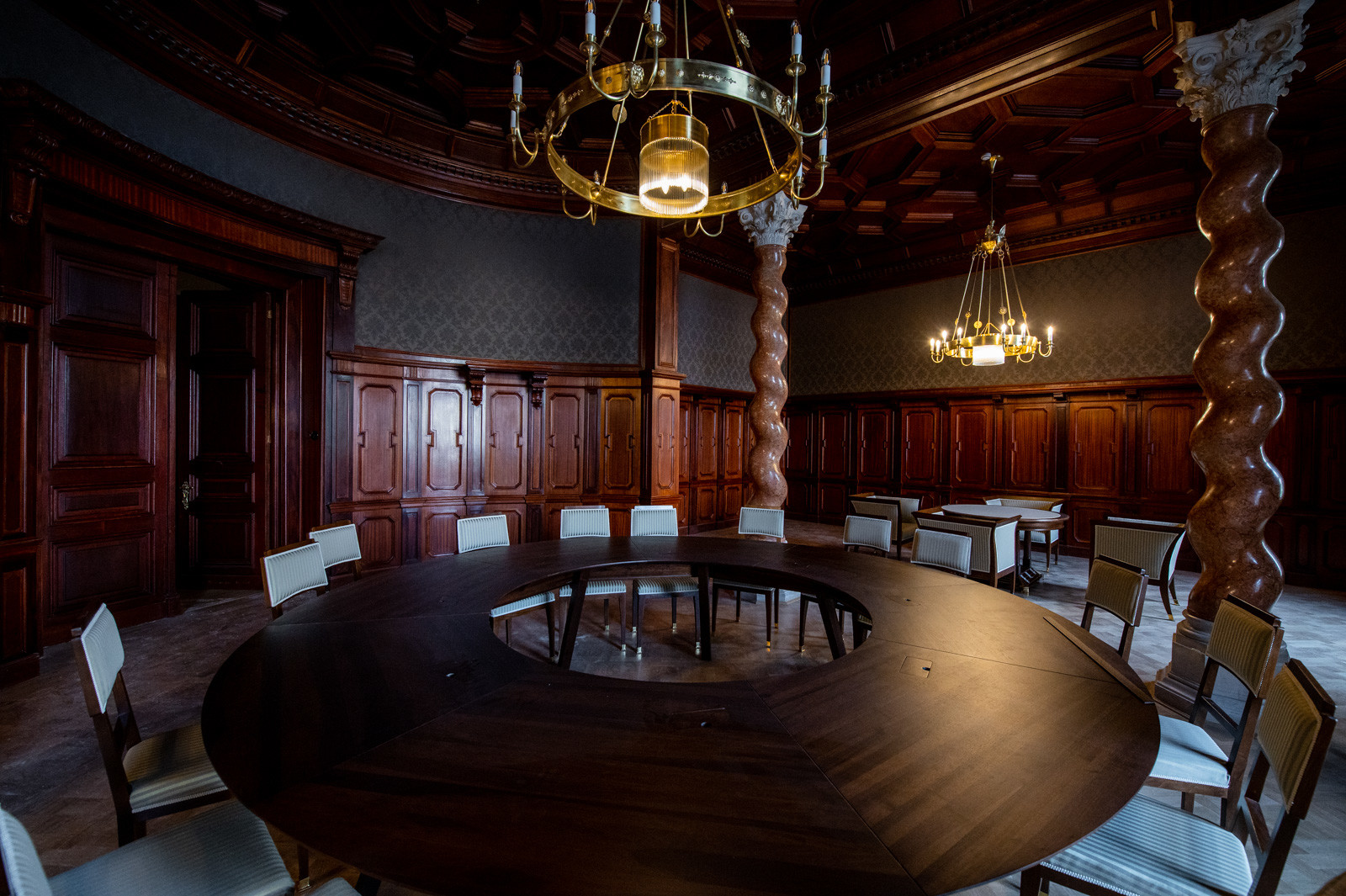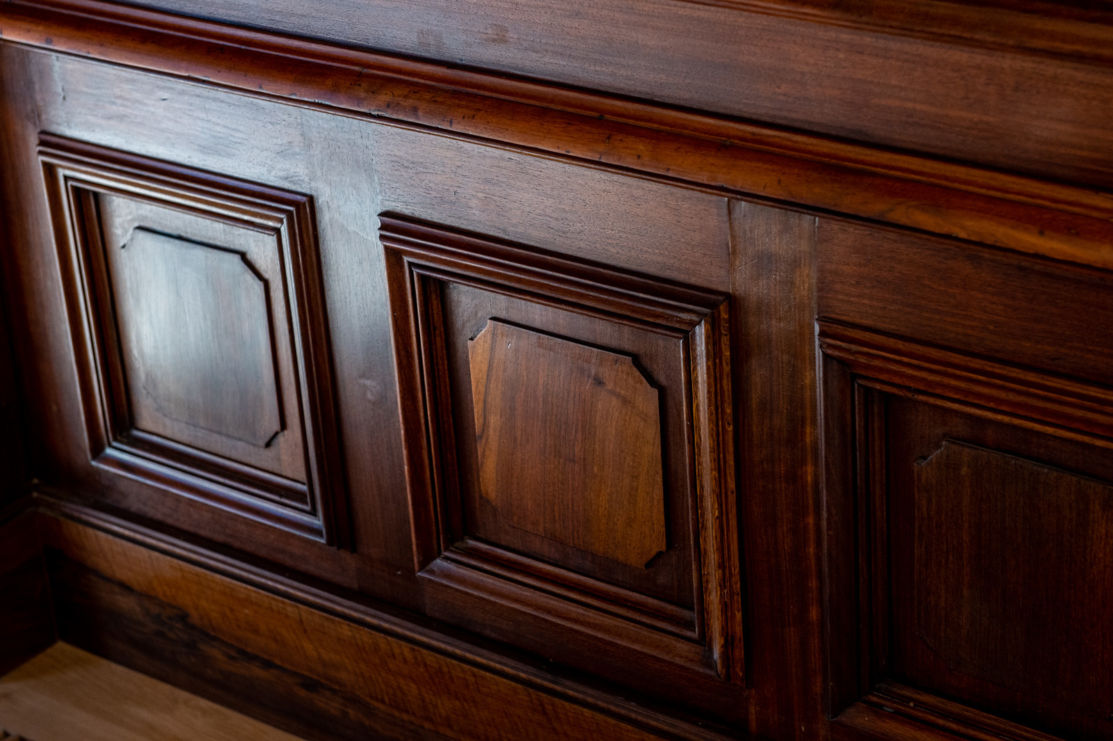 A földszinti hall díszes faragványai Thék Endre asztalosmester keze nyomát viselik.