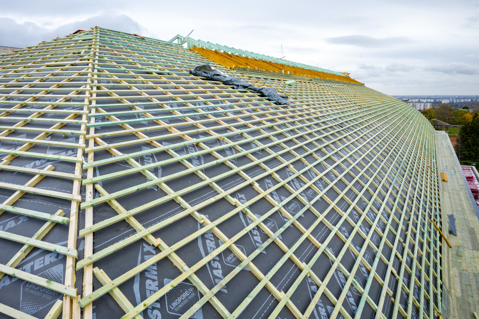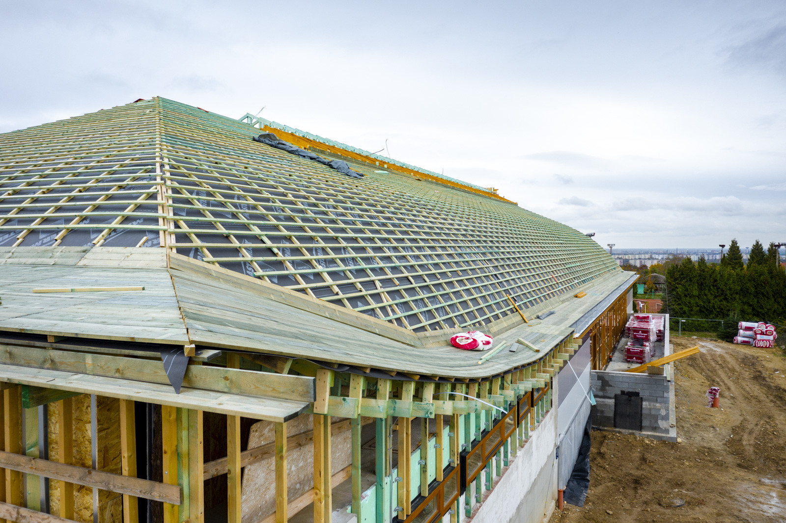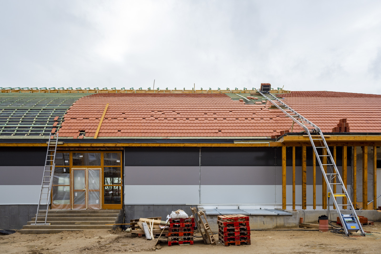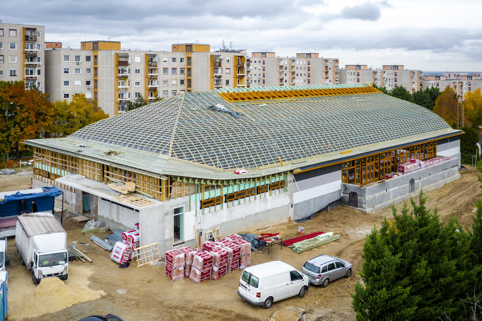 A szakemberek jelenleg a tető cserepezését és bádogozását, valamint az oldalfalak szendvicspanellel történő zárását végzik.