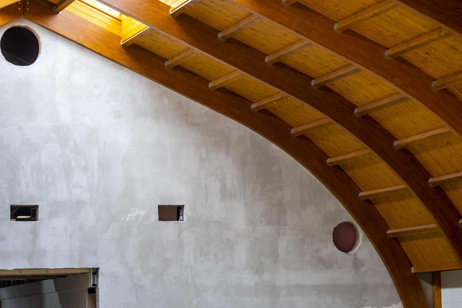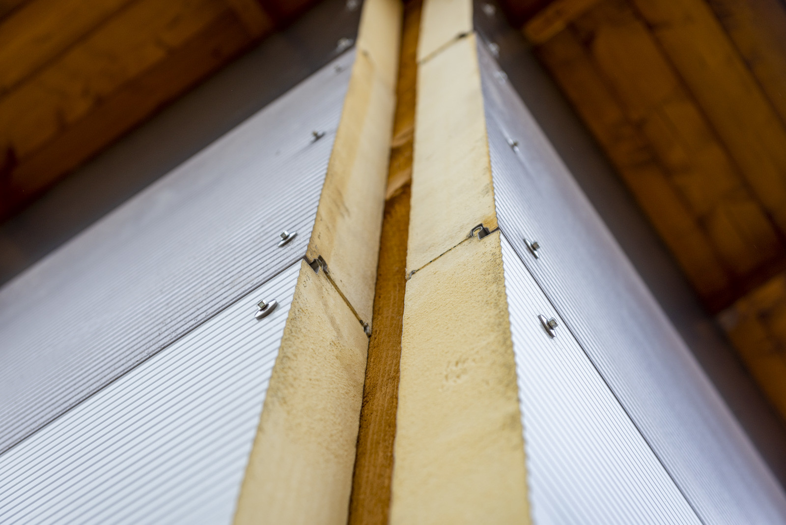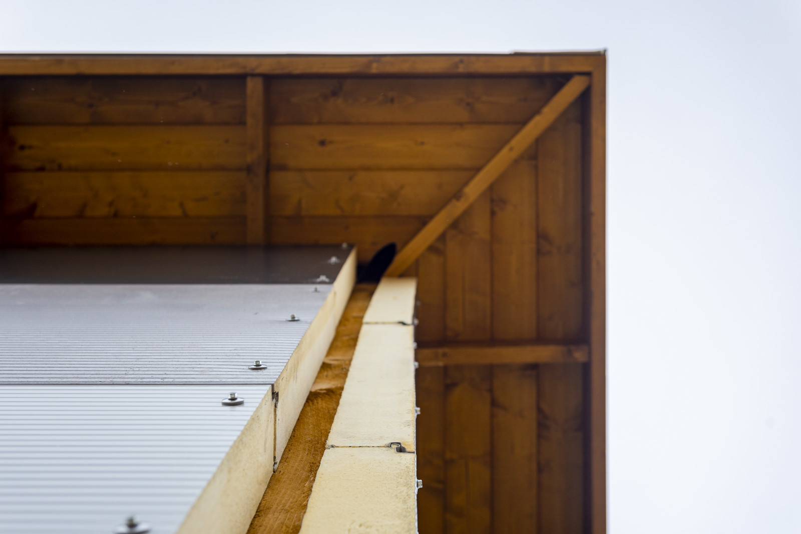 A padlástérben a tető belső oldali hőszigetelése már elkészült, azonban a gipszkarton szereléshez egy térállványt szükséges még kiépíteni. A homlokzat faburkolatának felszerelése majd a finombeton lábazat burkolatának elkészülését követően valósulhat meg.