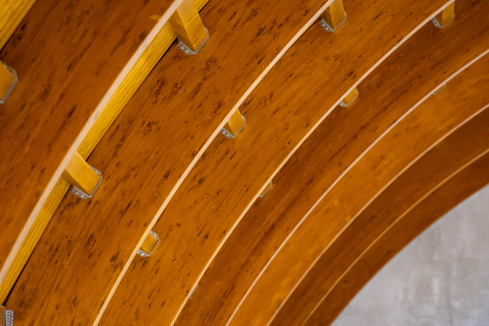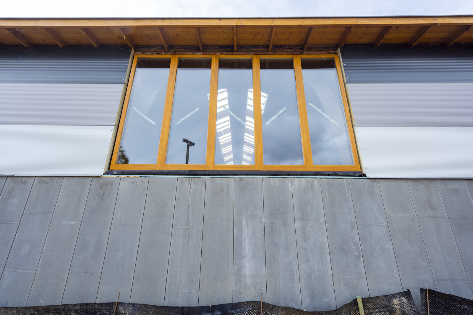 A medencetér körüli homlokzat középszürke finombeton lábazata fut tovább a sávosan sötétedő, szürke szendvicspanelekbe, amelyek komorságát a bejárati homlokzat hullámokat idéző faburkolata töri meg.