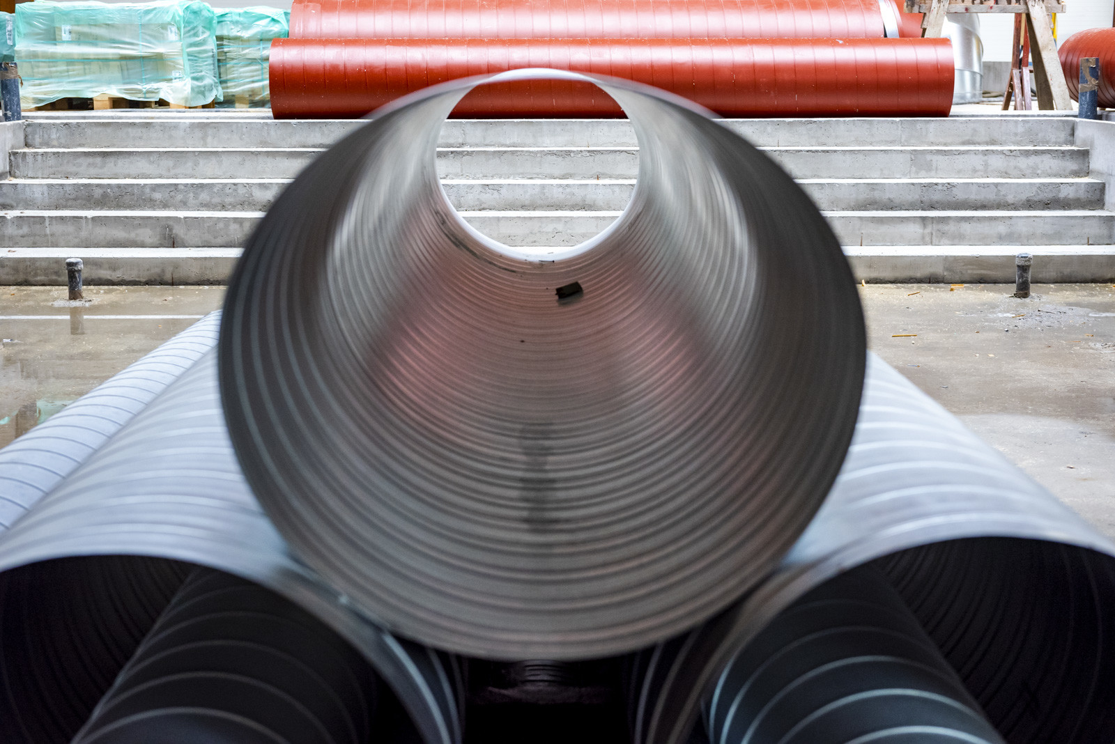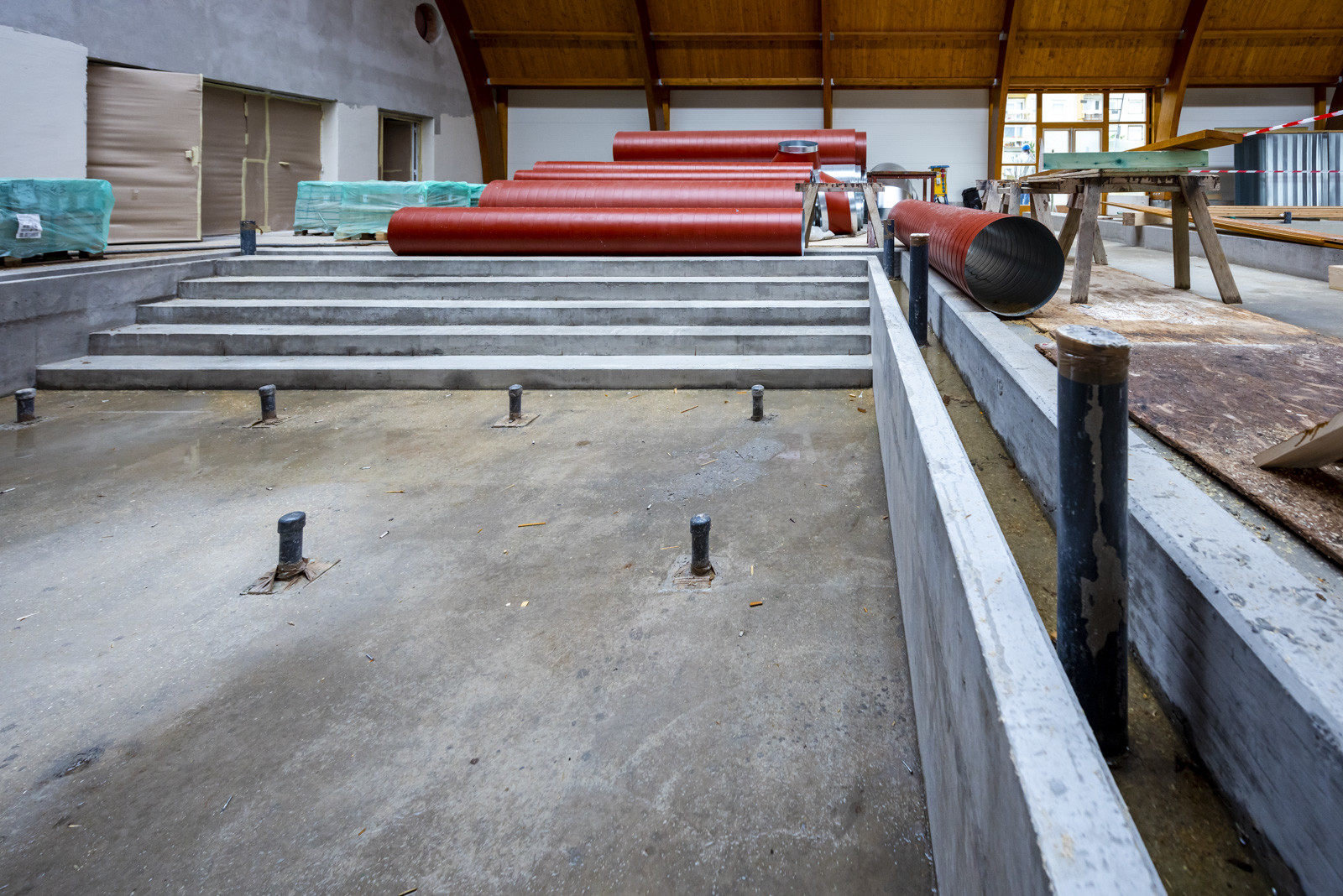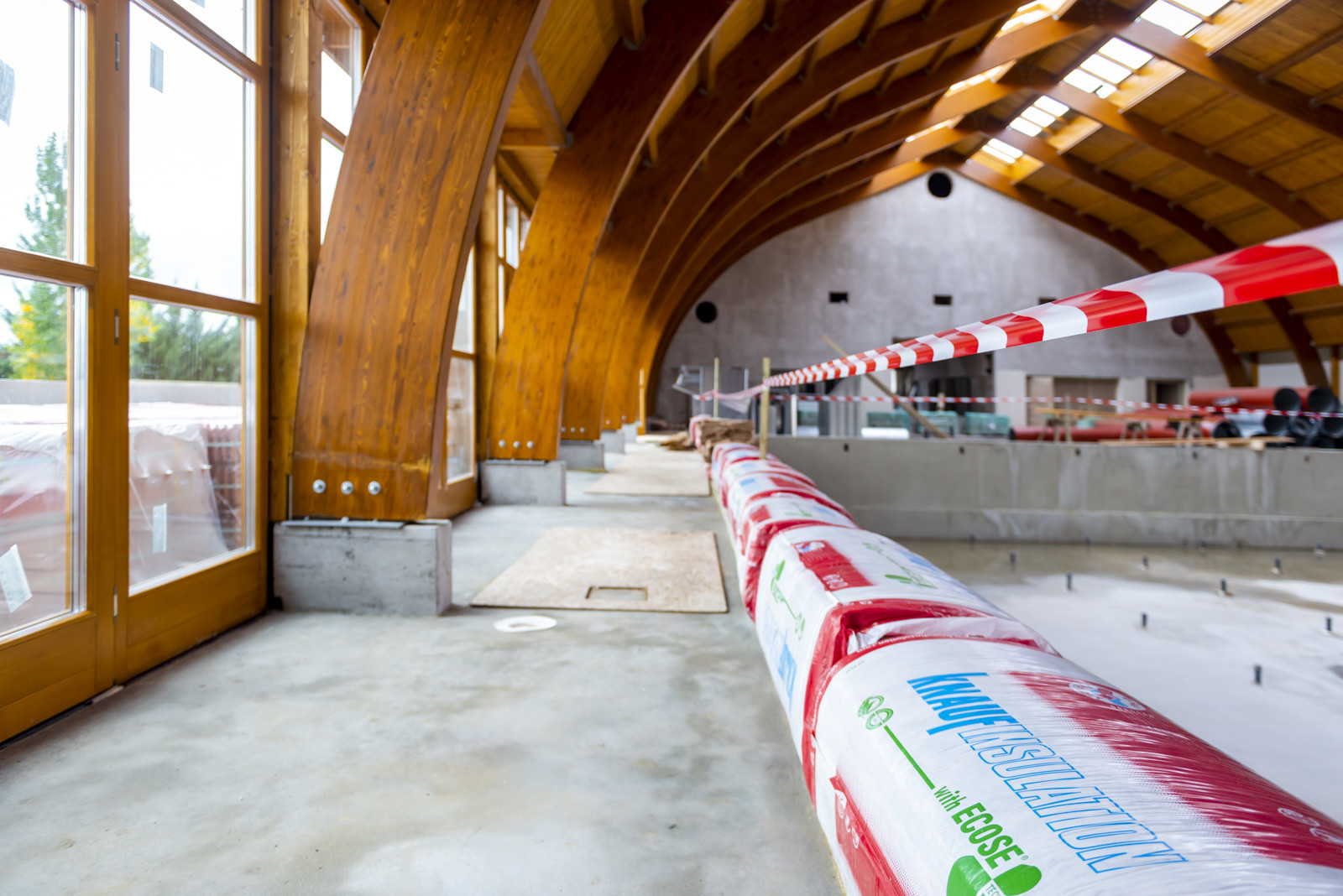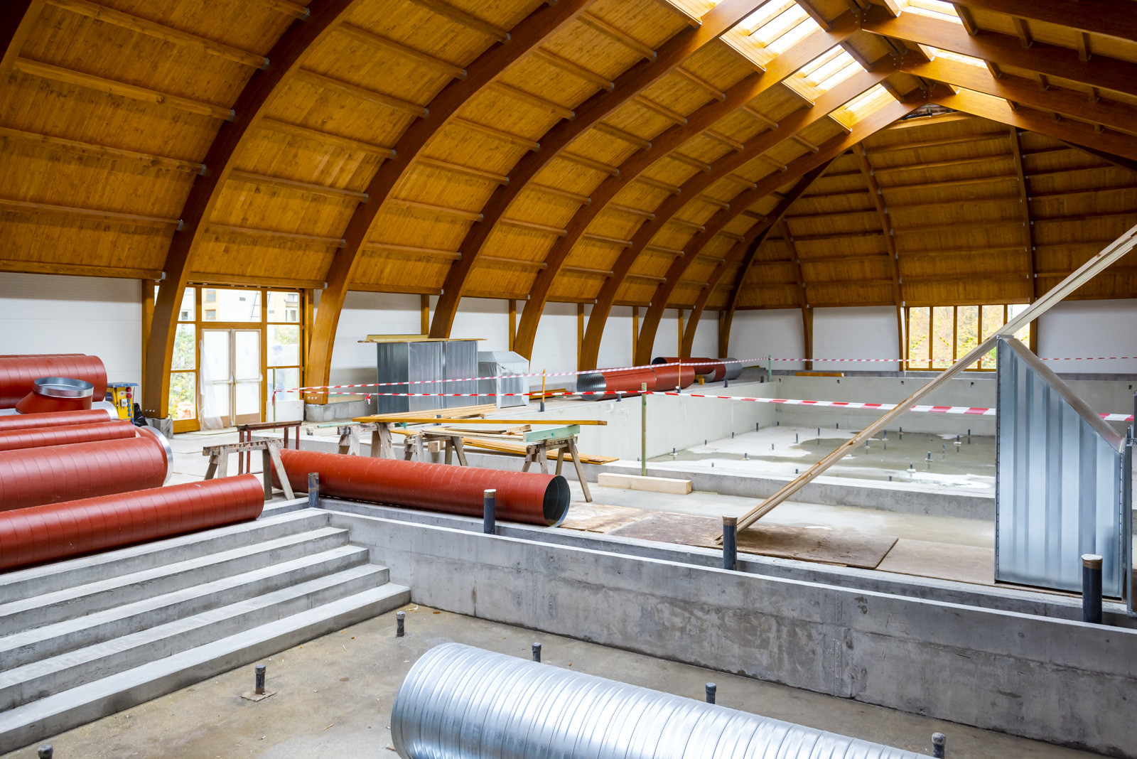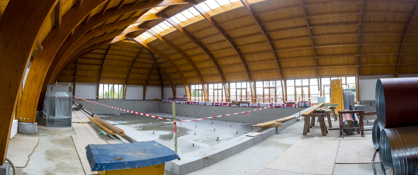 A medencetérben légtechnikai és elektromos szerelési munkálatok folynak. Ezt követően a medence folyókák és a medenceperem kiegyenlítésével foglalkoznak. Ezután beépítik a medencetér hidegburkolását és a medencék uszodagépészeti elemeit, végül a medencék fóliázása készül el.