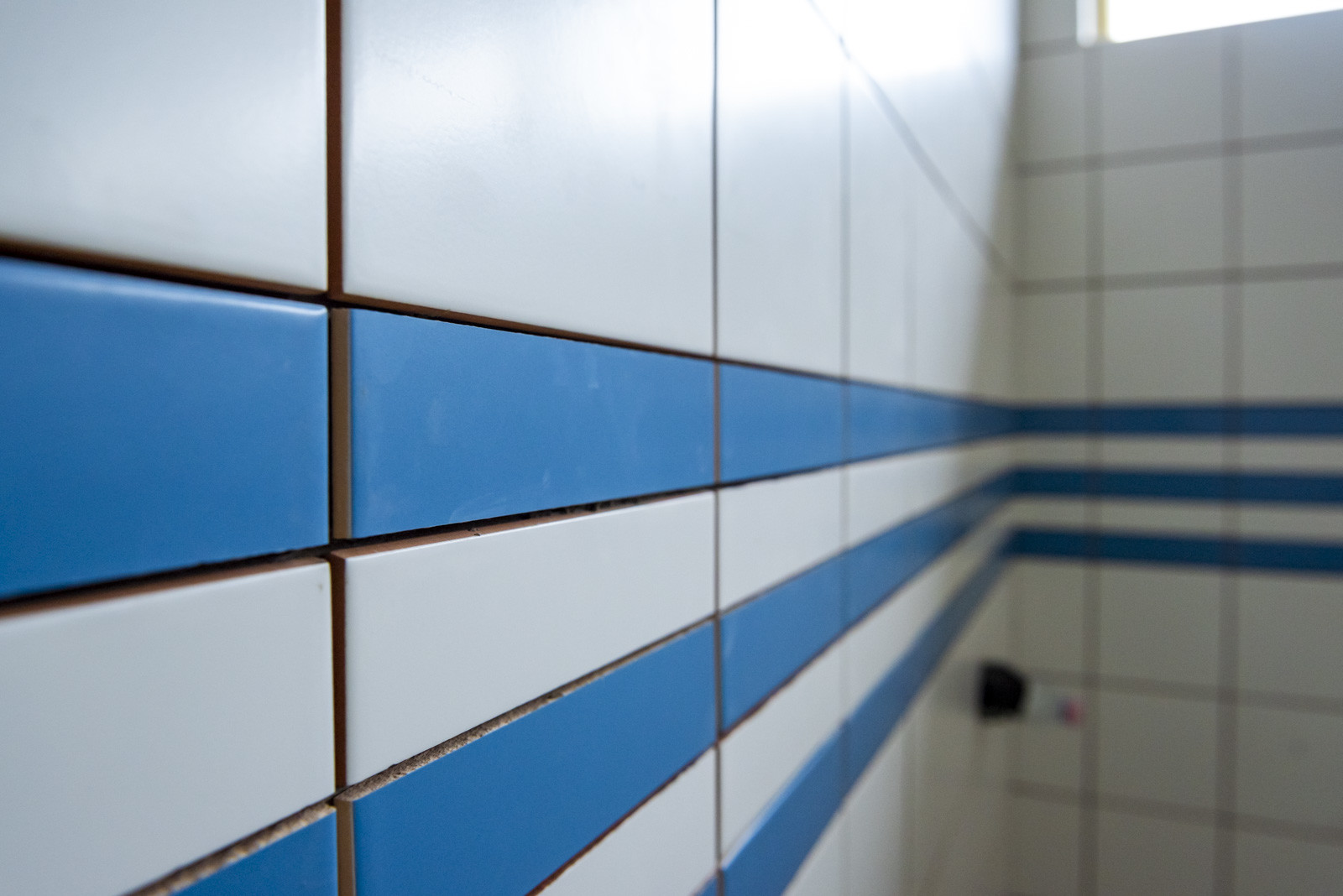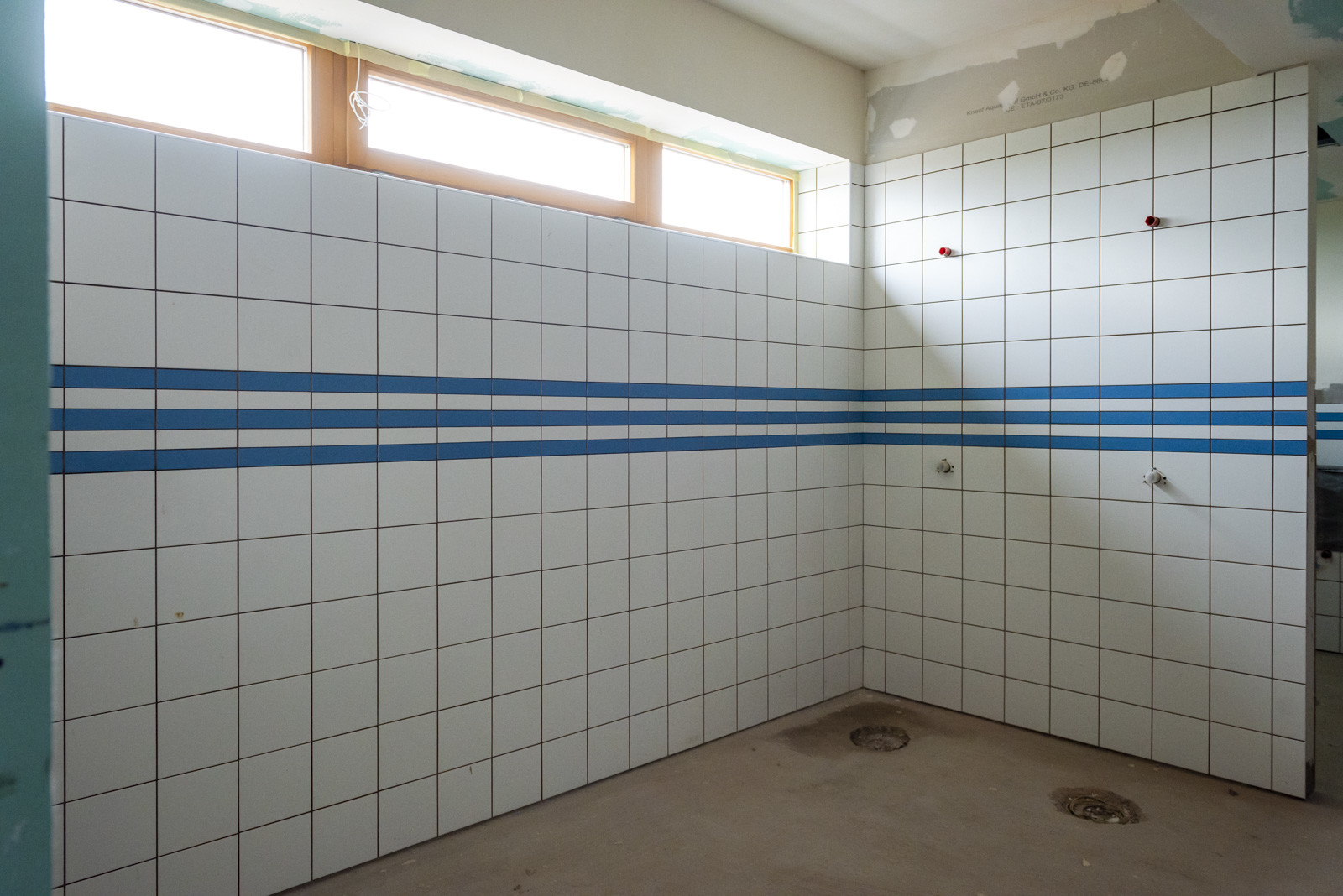A fejépületben a falak csempézését is elvégzik, majd a padló burkolását kezdik el, illetve a festési munkák előkészítése is folyamatosan halad.