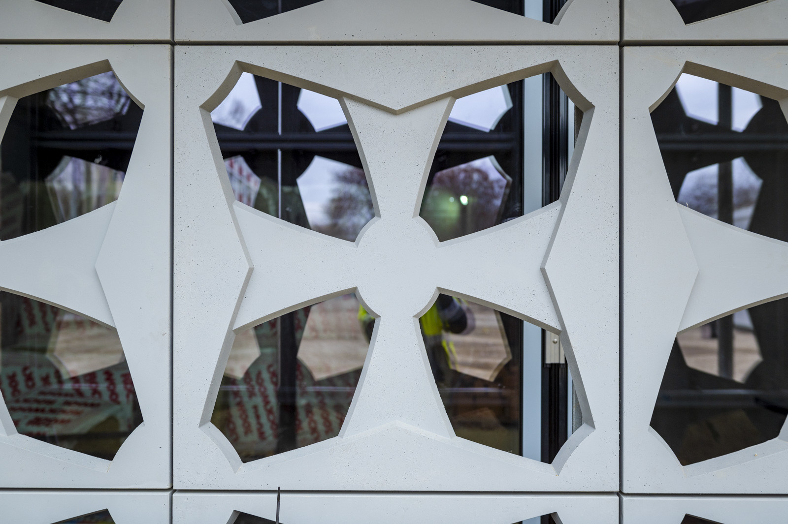Ezek az elemek jó választásnak bizonyultak, segítségükkel az új sportcsarnok robosztus beton épülete jobban harmonizál a neobarokk főépülettel.