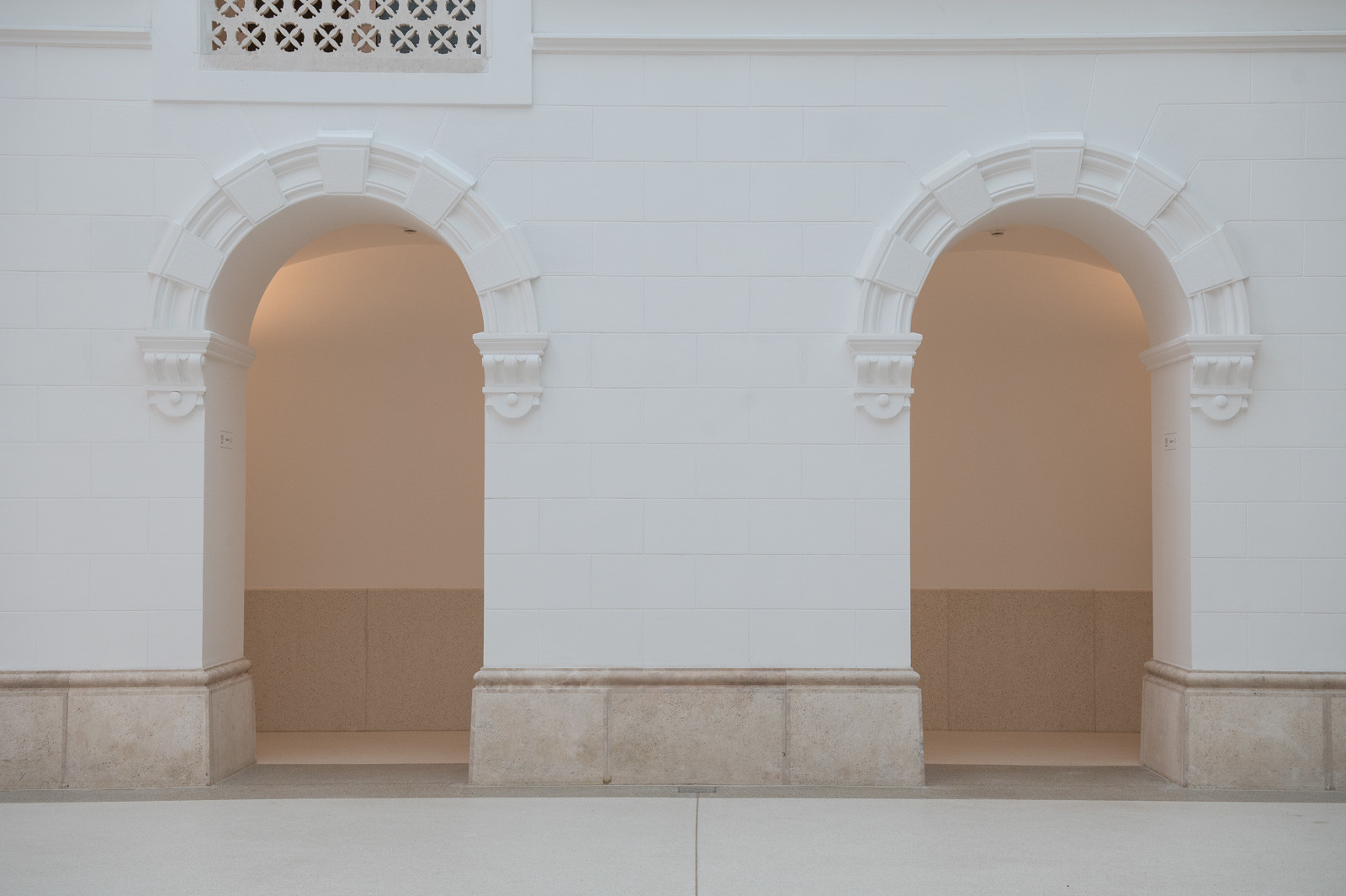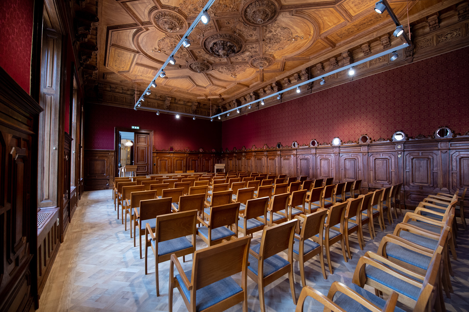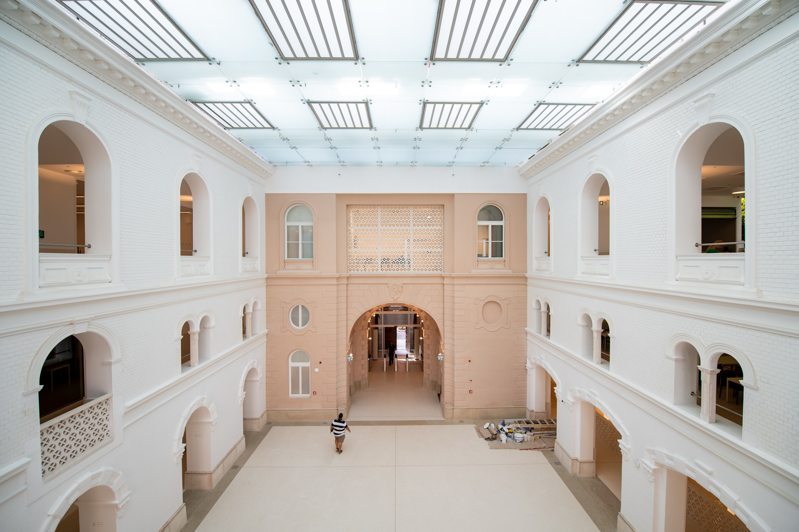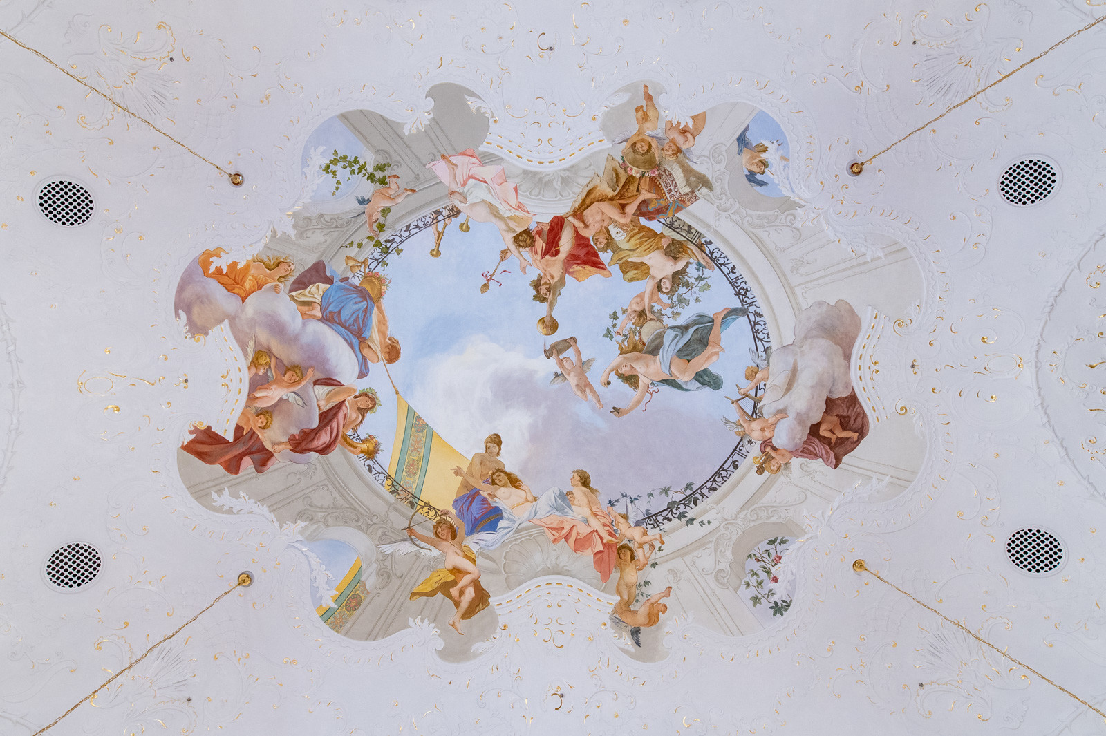 Emellett a báltermet, a mennyezetén lévő Lotz-képpel együtt modern, letisztult formában kívánták helyreállítani: később folyamatosan változtak a tervek, és egyre impozánsabbá alakult a helyiség arculata, így Lotz-képet is korhű módon, színesre restaurálták.