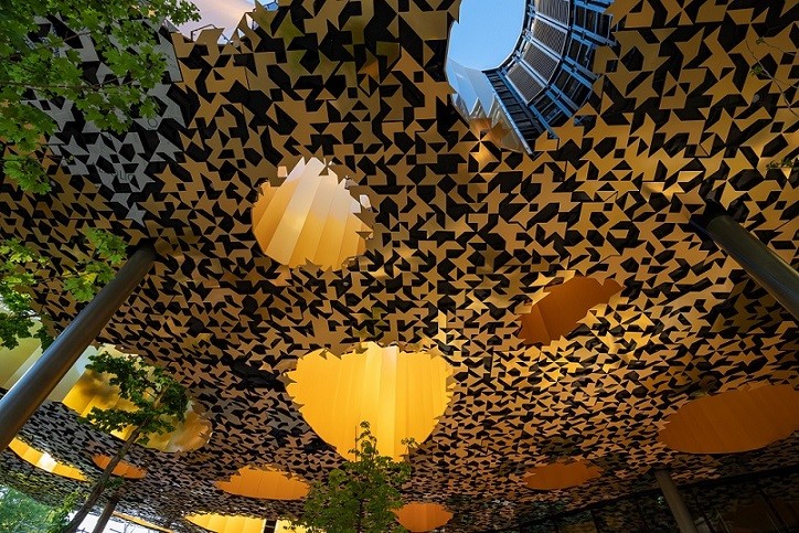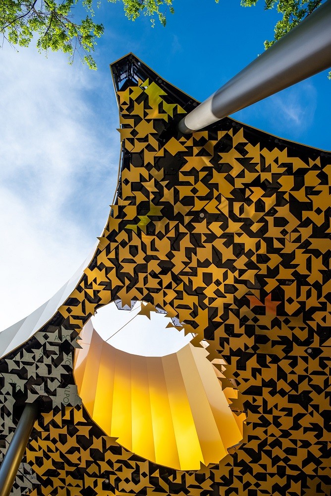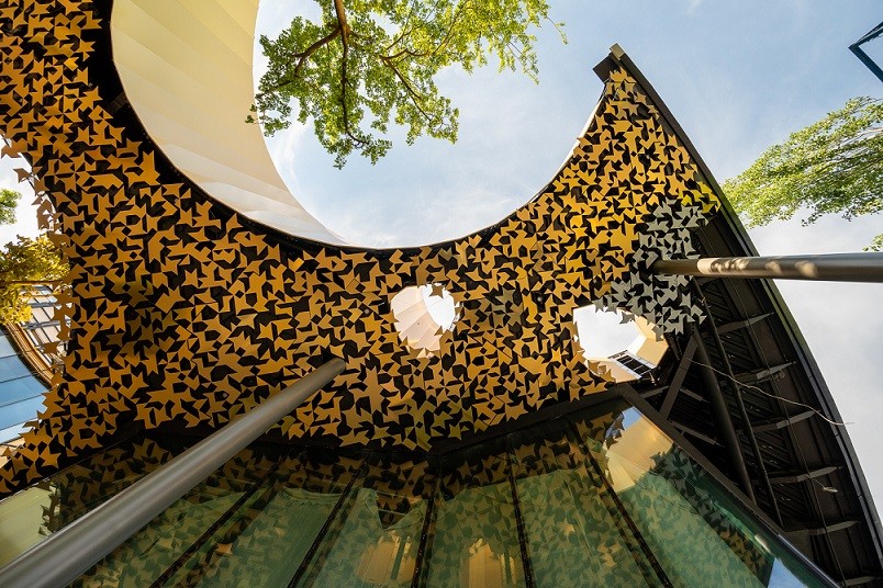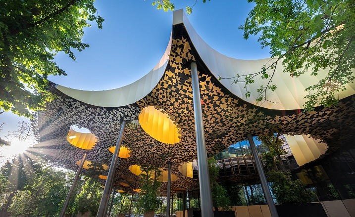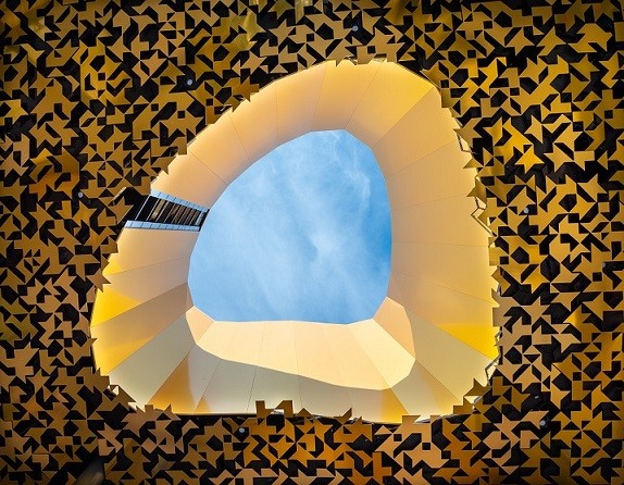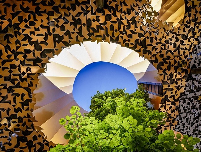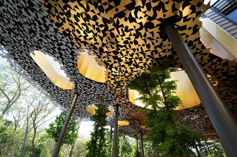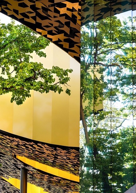A felületét közel 100 egyedi tervezésű nyílás töri át, melyek egy részén átbújnak a ligeti fák, más részük pedig arra szolgál, hogy bevezessék a fényt az épület belsejébe. Ez a zöld megoldás segíti a belső terek megvilágítását és a különleges atmoszféra megteremtését.