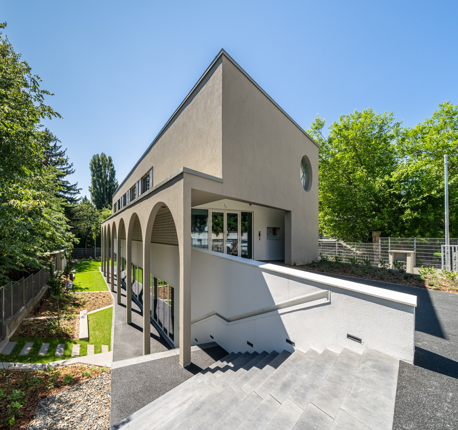 Külső megjelenésében harmonizál a rendház és templom épületekkel, valamint homlokzatának színe is azonos az épületegyüttes többi részével. Az utcafronti homlokzatán pedig a nyílászáró sáv előtt finombeton rácsozat ad árnyékot.