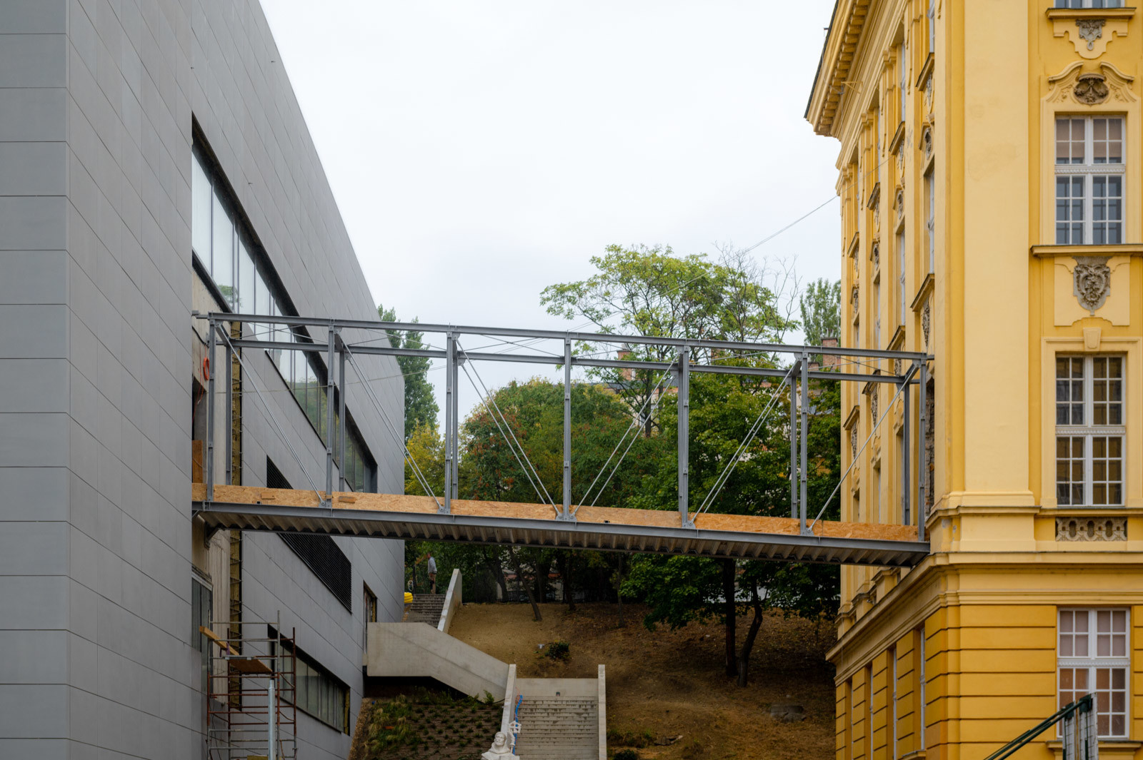 A szerkezetépítési szakaszról beszélve az igazgató kiemeli: a két épületet egy híddal fogják összekötni, aminek már elhelyezték a szerkezetét és ezen a héten kezdték el a terhelését.