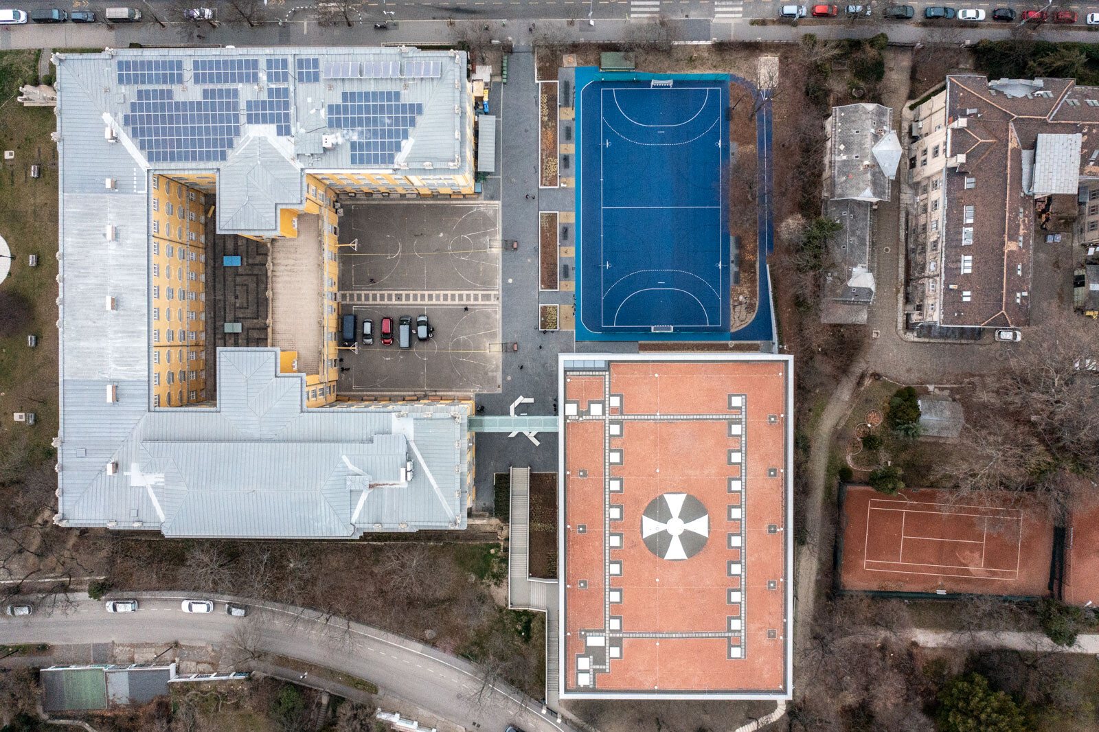 A 3700 négyzetméteres sportcsarnokot Peschka Alfréd tervezte. A neobarokk iskolaépületet és - a Villányi út felől nézve - a bal oldalán elhelyezkedő, modern, látszóbeton homlokzatú sportcsarnokot egy üveghíd köti össze.
