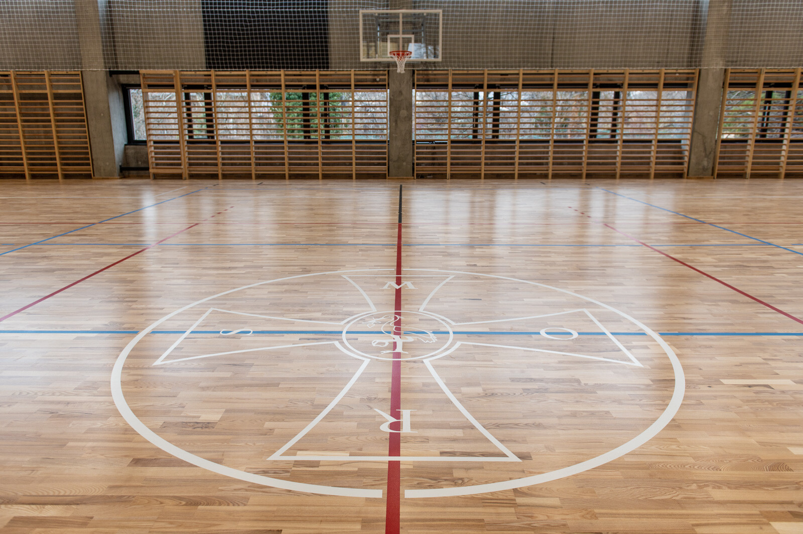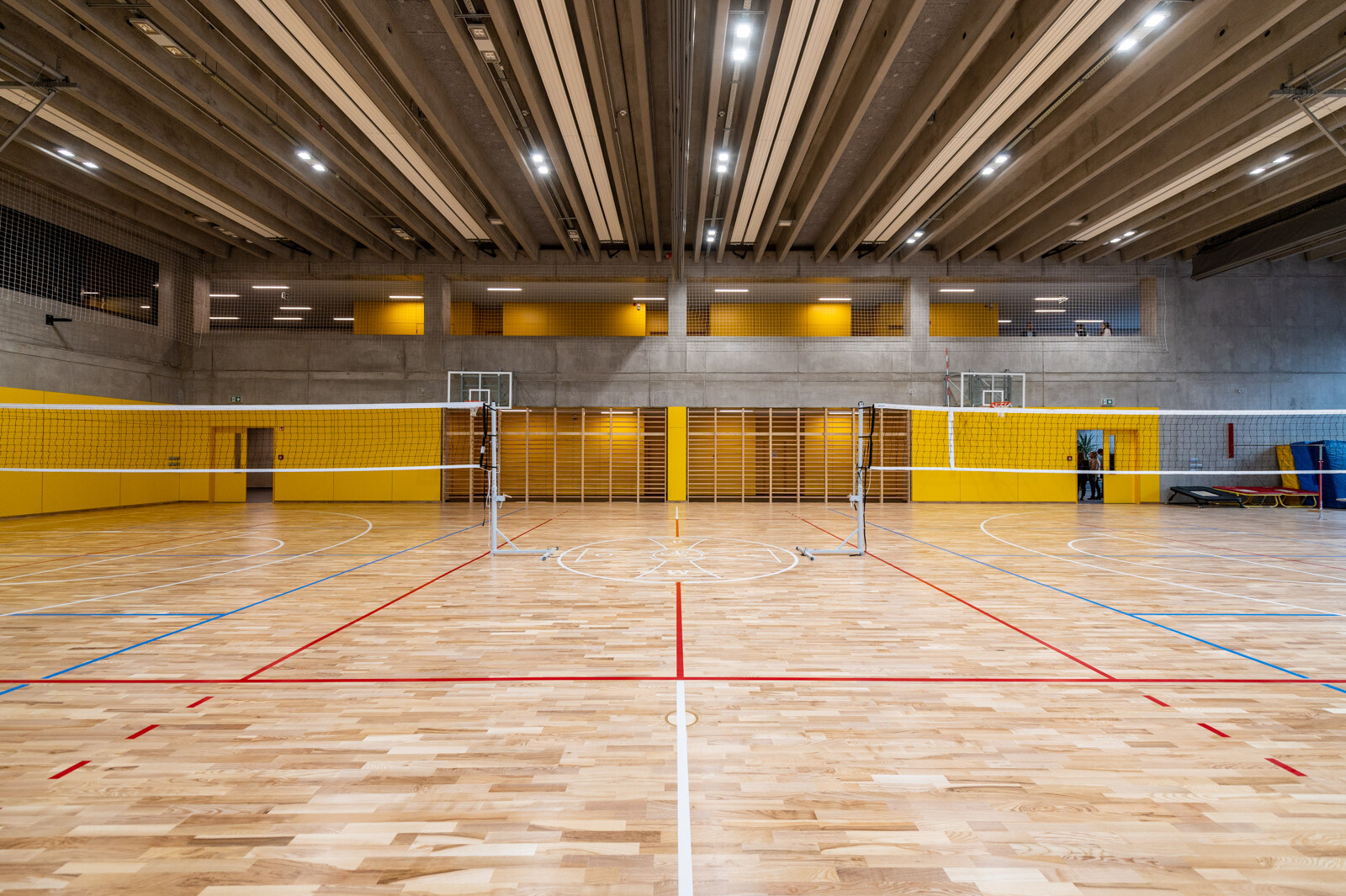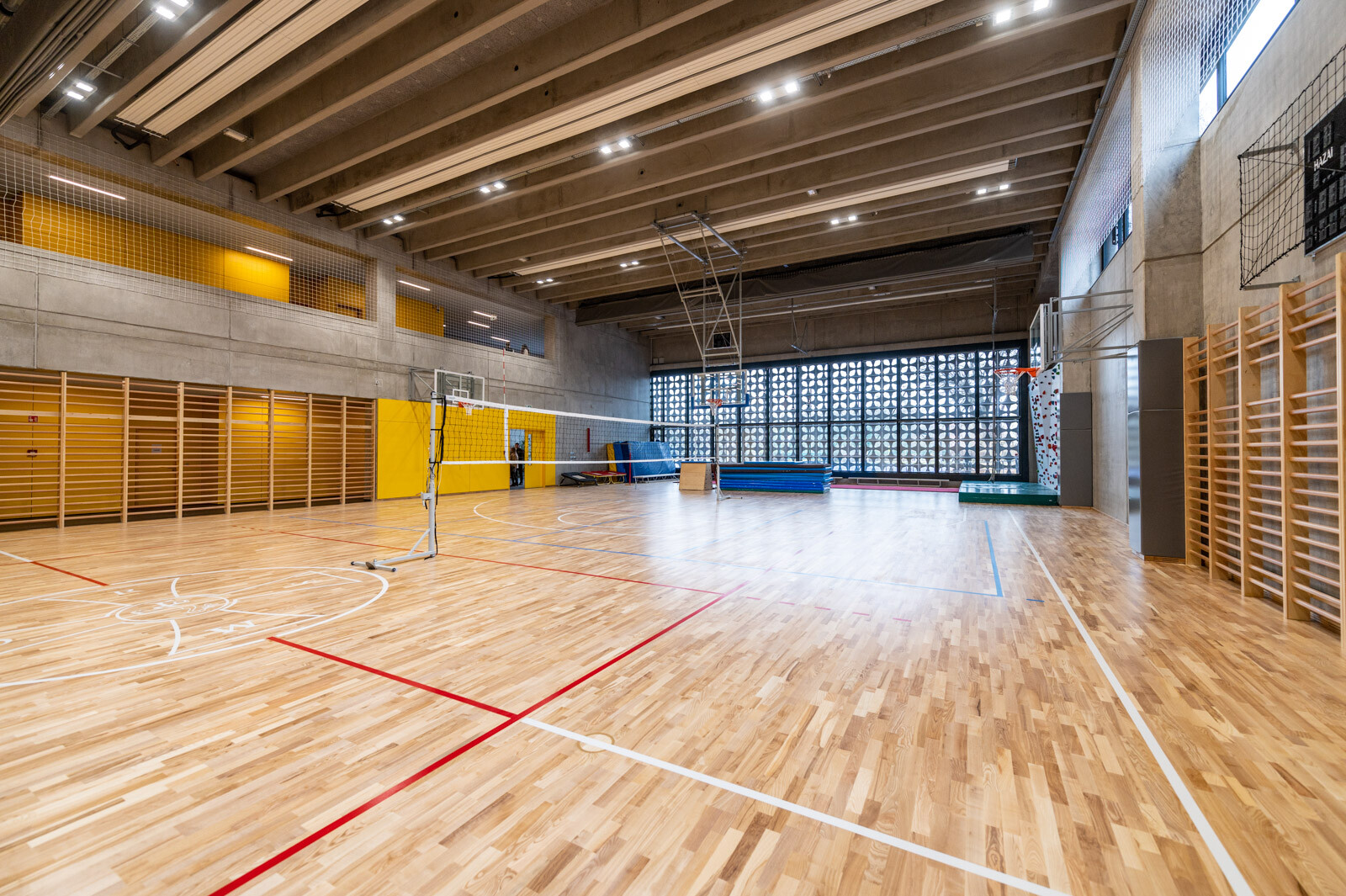 A sportcsarnok földszintjén egy két szint belmagasságú kézilabdapálya, valamint - egymás fölött elhelyezve - két normál belmagasságú edzőterem található. A felső szinten szintén egy - az alsónál nagyobb - sportpálya van, százötven fős lelátóval. A mosdókat, öltözőket, tanári szobákat a földszinten és az első emeleten alakították ki.