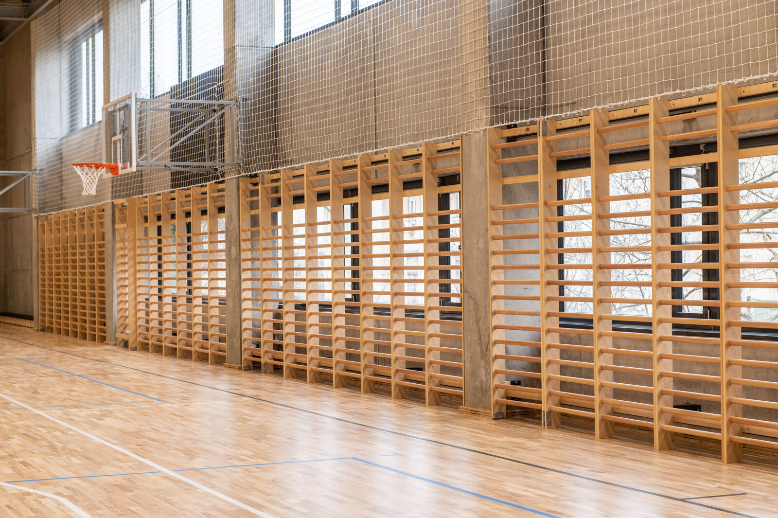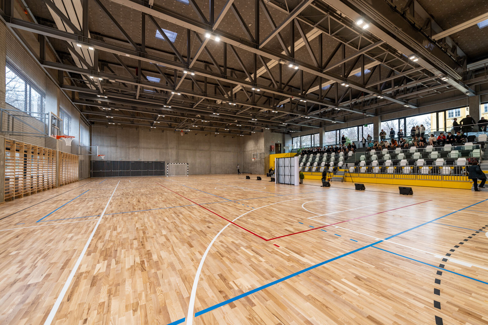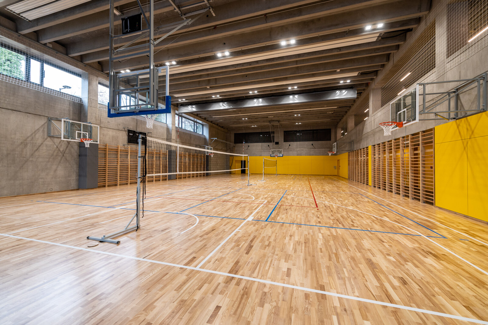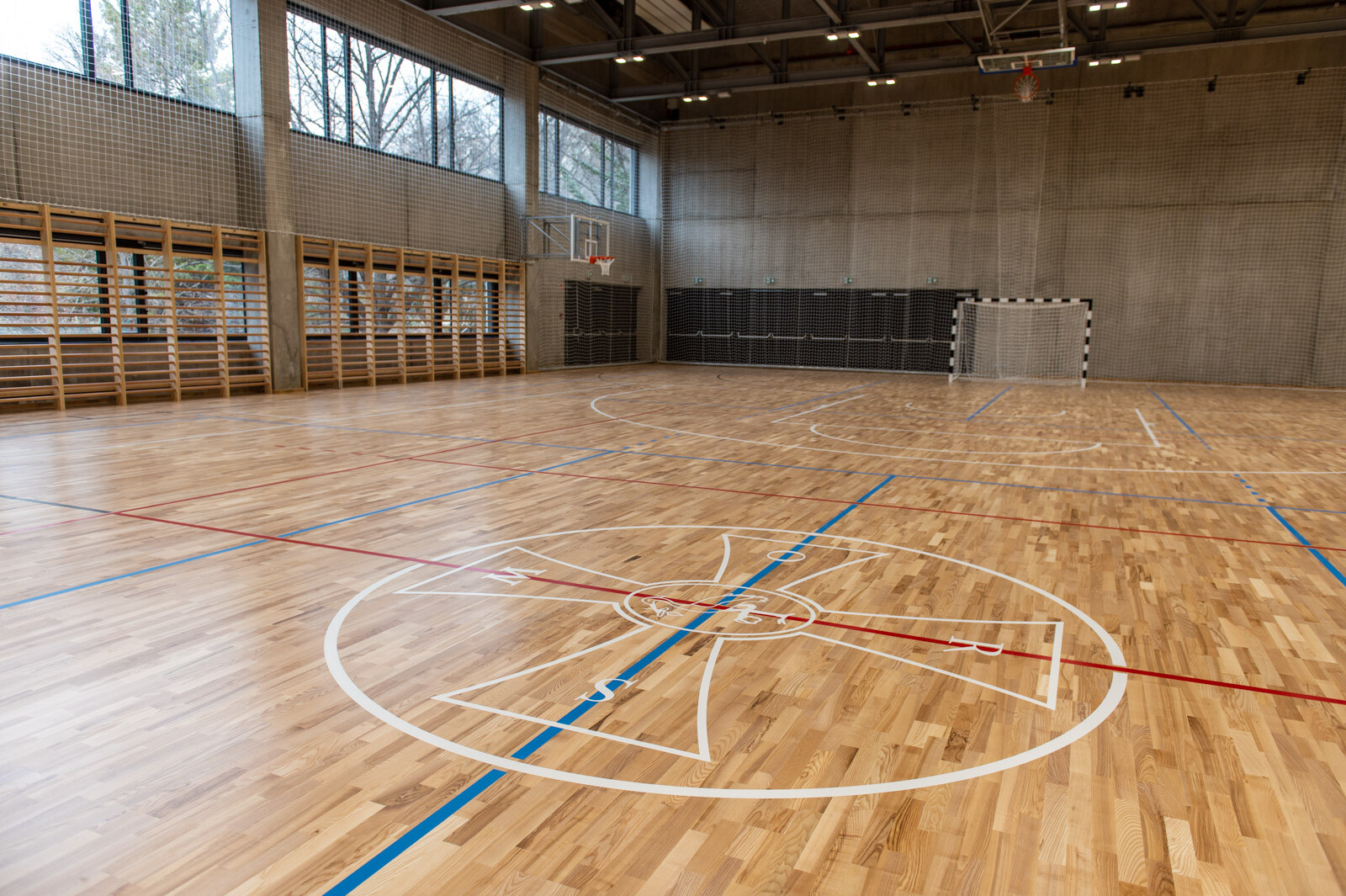 A sportcsarnok földszintjén egy két szint belmagasságú kézilabdapálya, valamint - egymás fölött elhelyezve - két normál belmagasságú edzőterem található. A felső szinten szintén egy - az alsónál nagyobb - sportpálya van, százötven fős lelátóval. A mosdókat, öltözőket, tanári szobákat a földszinten és az első emeleten alakították ki.