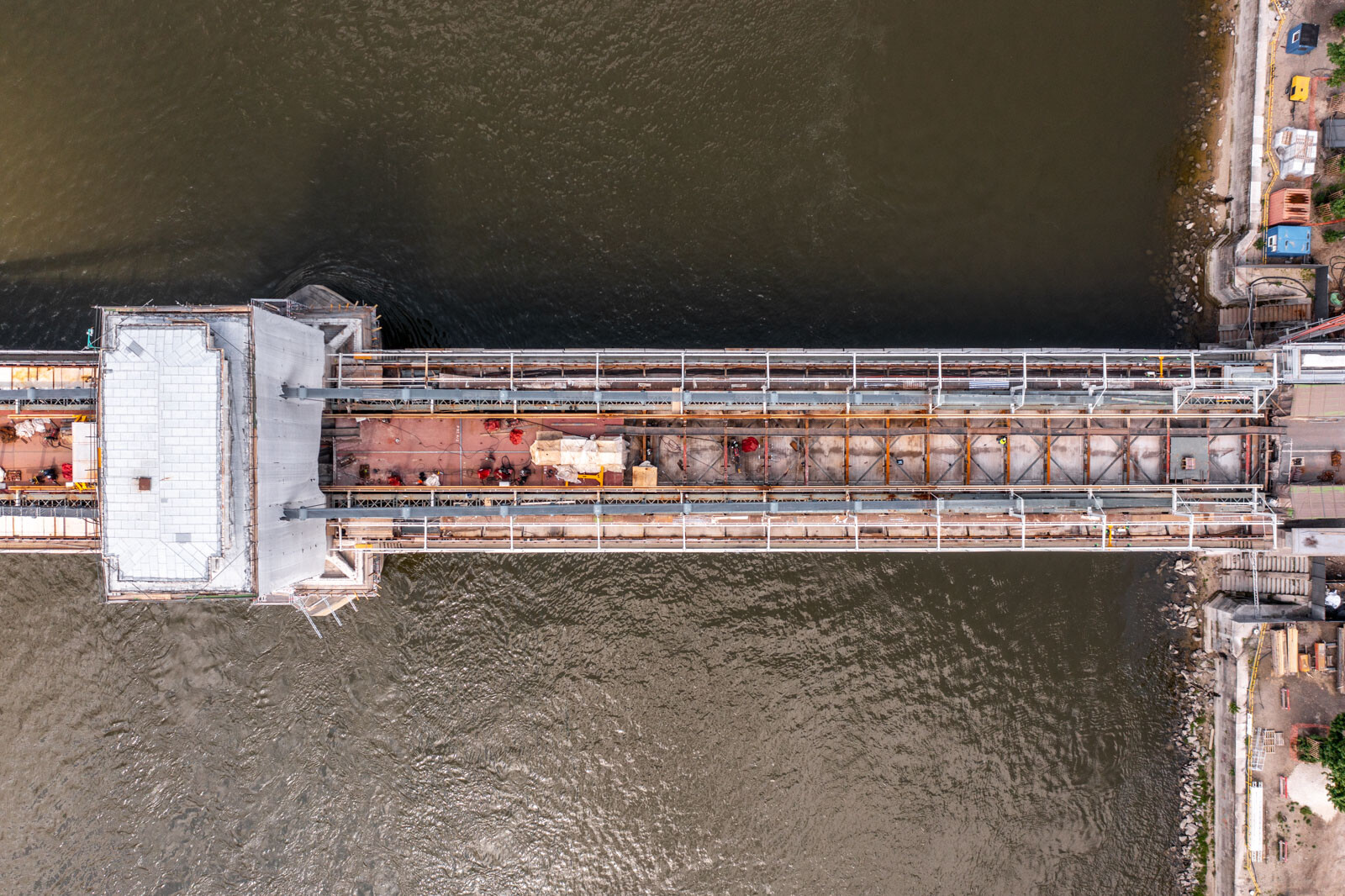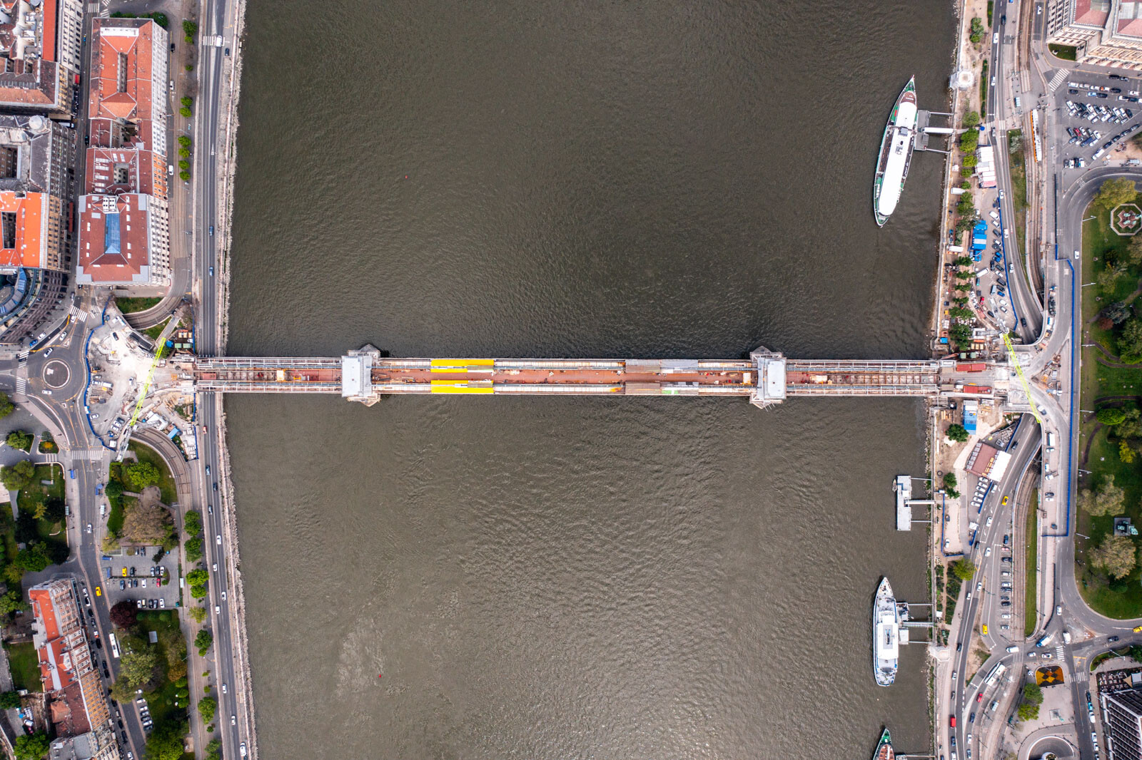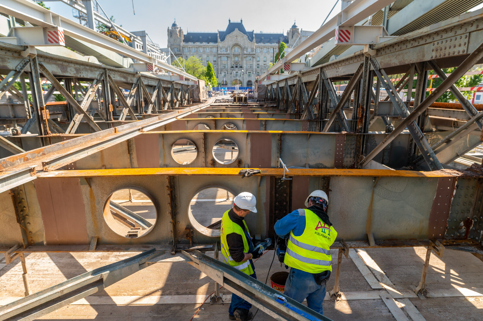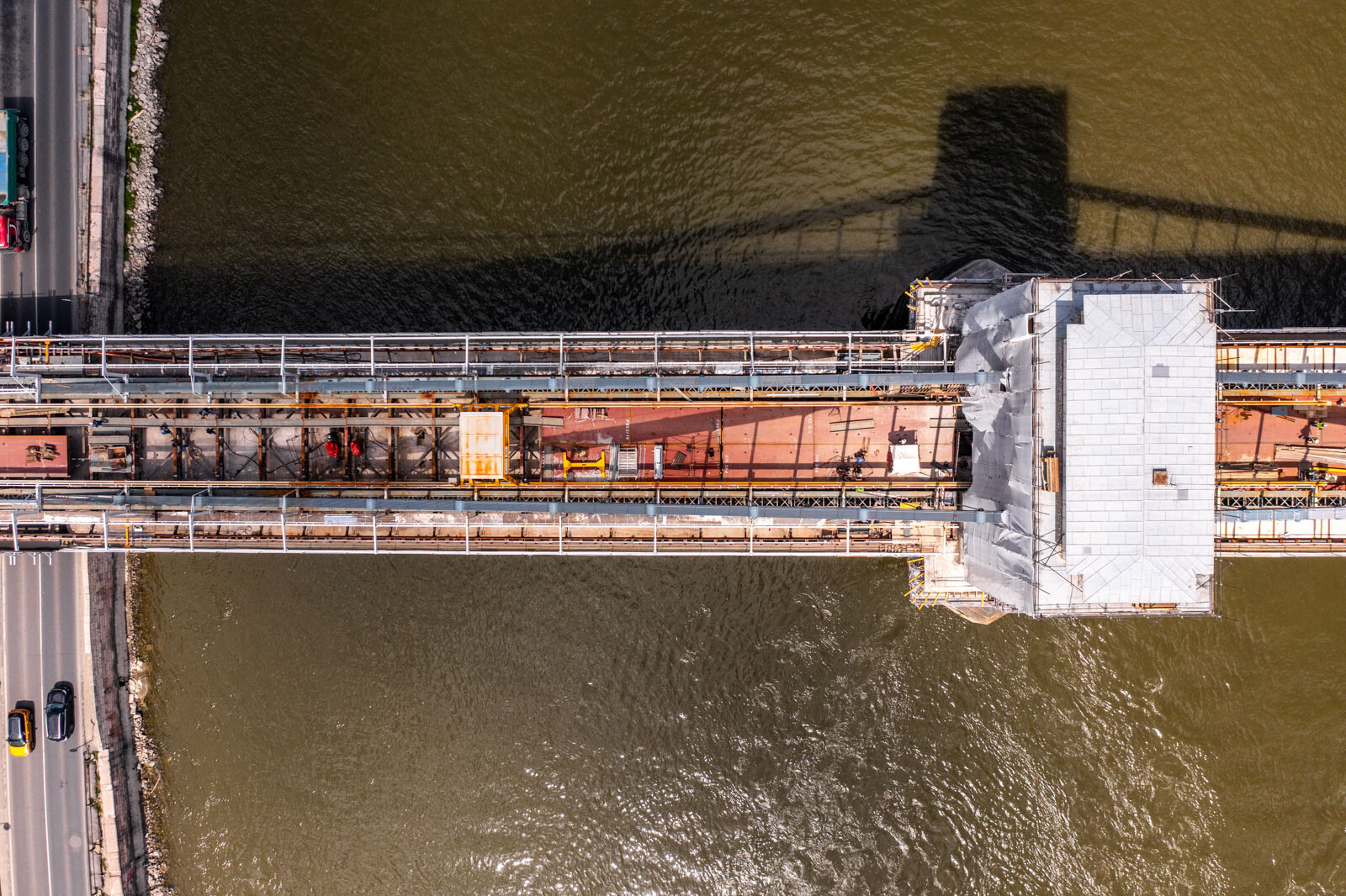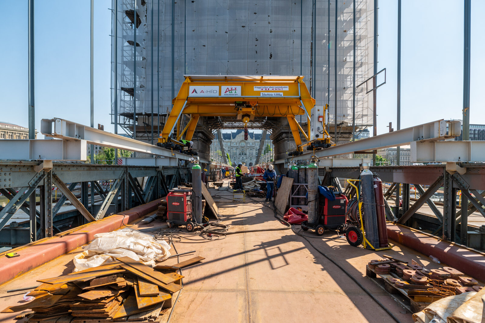 Közben már a parti nyílásokban is ütemezetten zajlik az új ortotróp acél pályatáblák elhelyezése. A 380 méter hosszú hídon a két pilon közötti – csaknem 200 méteres szakasz – tavaly december közepére egybefüggően járhatóvá vált, az alatta lévő régi acélszerkezeteken ugyanakkor még ezernyi hibát kellett kijavítani az elmúlt hónapokban. Elkészült időközben a pillérek közötti szakasz mindkét oldalán az új gyalogosjárda, és a szakemberek folyamatosan helyezik be a pályaszint alatti új vizsgálójárda szerkezetét is.