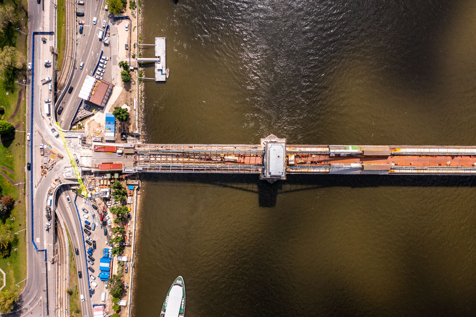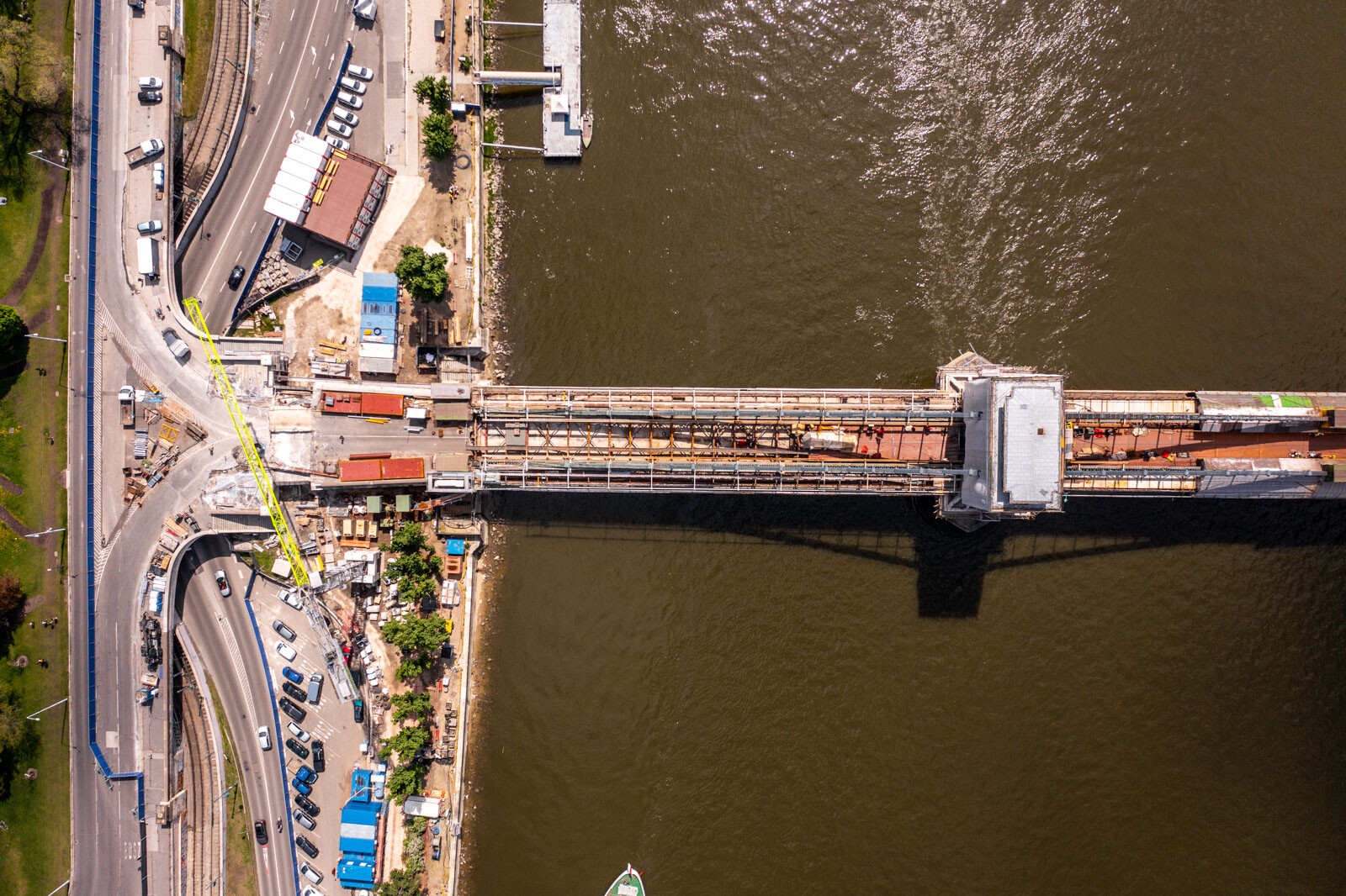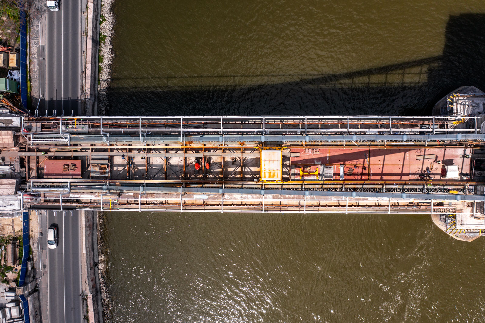Most már a pillérek és a partok közötti részen haladnak „kifelé” az új útpályát alkotó, 6-8 tonnás acélelemek elhelyezésével. Az eddigieknek megfelelően szimmetrikusan, két irányba haladva dolgoznak, néhány héten belül pedig a járdát is elkezdik építeni ezen a szakaszon.