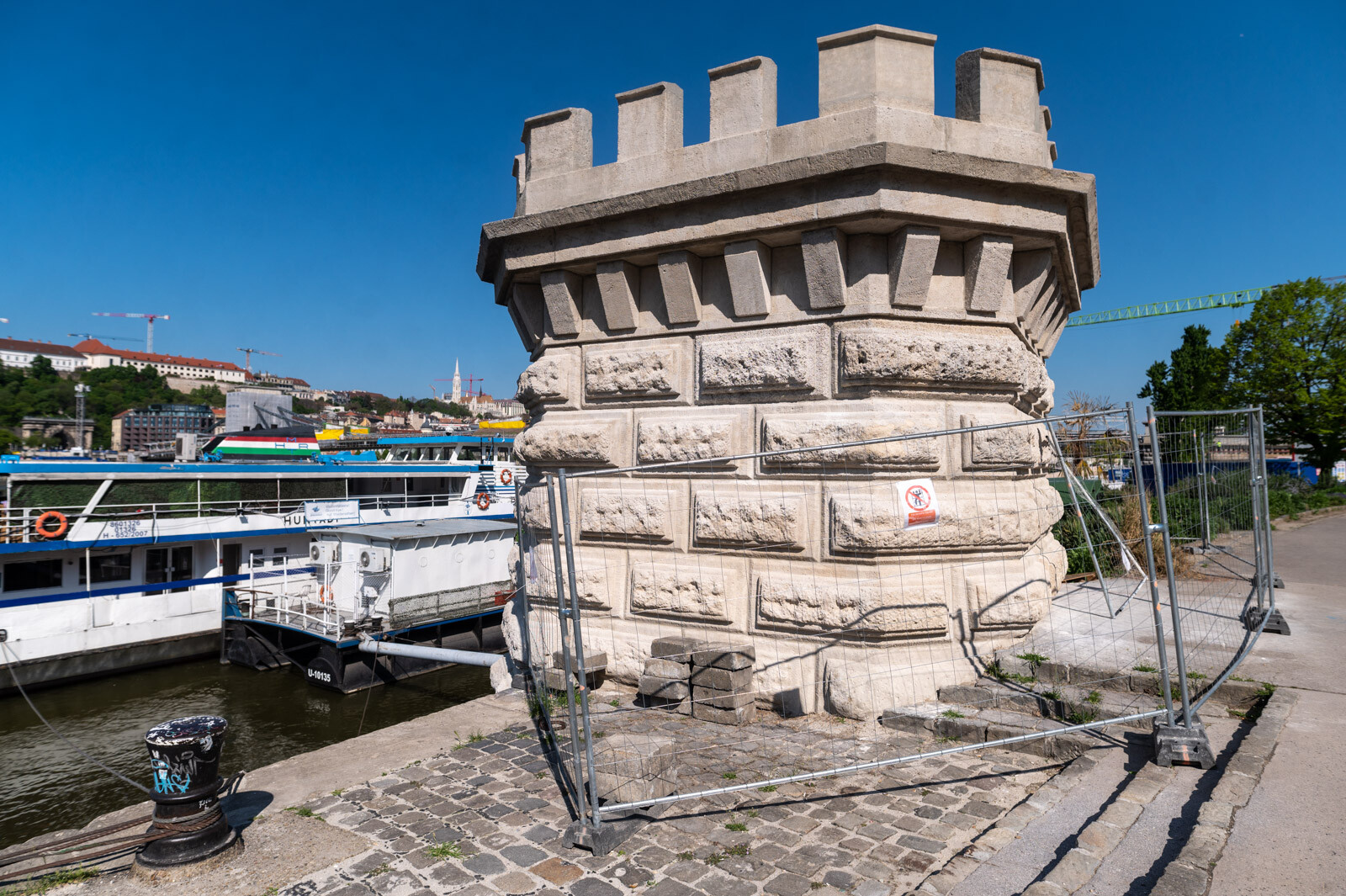 A tervek szerint végzik a műhelymunkákat és a helyszíni kőmunkákat is. A pesti oldal déli zászlótartó bástyájának kövei már teljesen megújultak, és az északi bástyán is hamarosan befejeződnek a munkák. A kőfelületeket letisztították, a sérüléseket javították, és a szükséges kőcseréket is elvégezték, majd a pótlásokat az oroszlánszobrokhoz hasonlóan patinázták, vagyis a színüket a bástyák többi részéhez igazították. Ezekre az építményekre a felújítás során díszvilágítást szerelnek, amely megvilágítja a bástyákat és az új zászlótartókat, illetve zászlókat.
