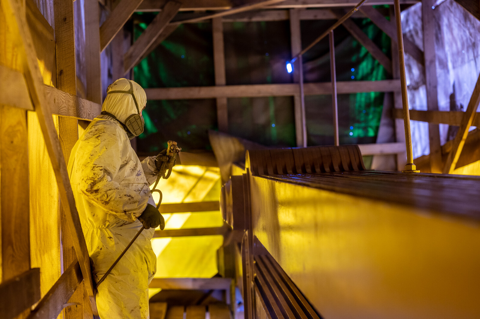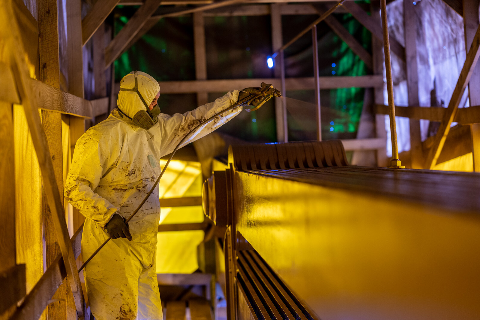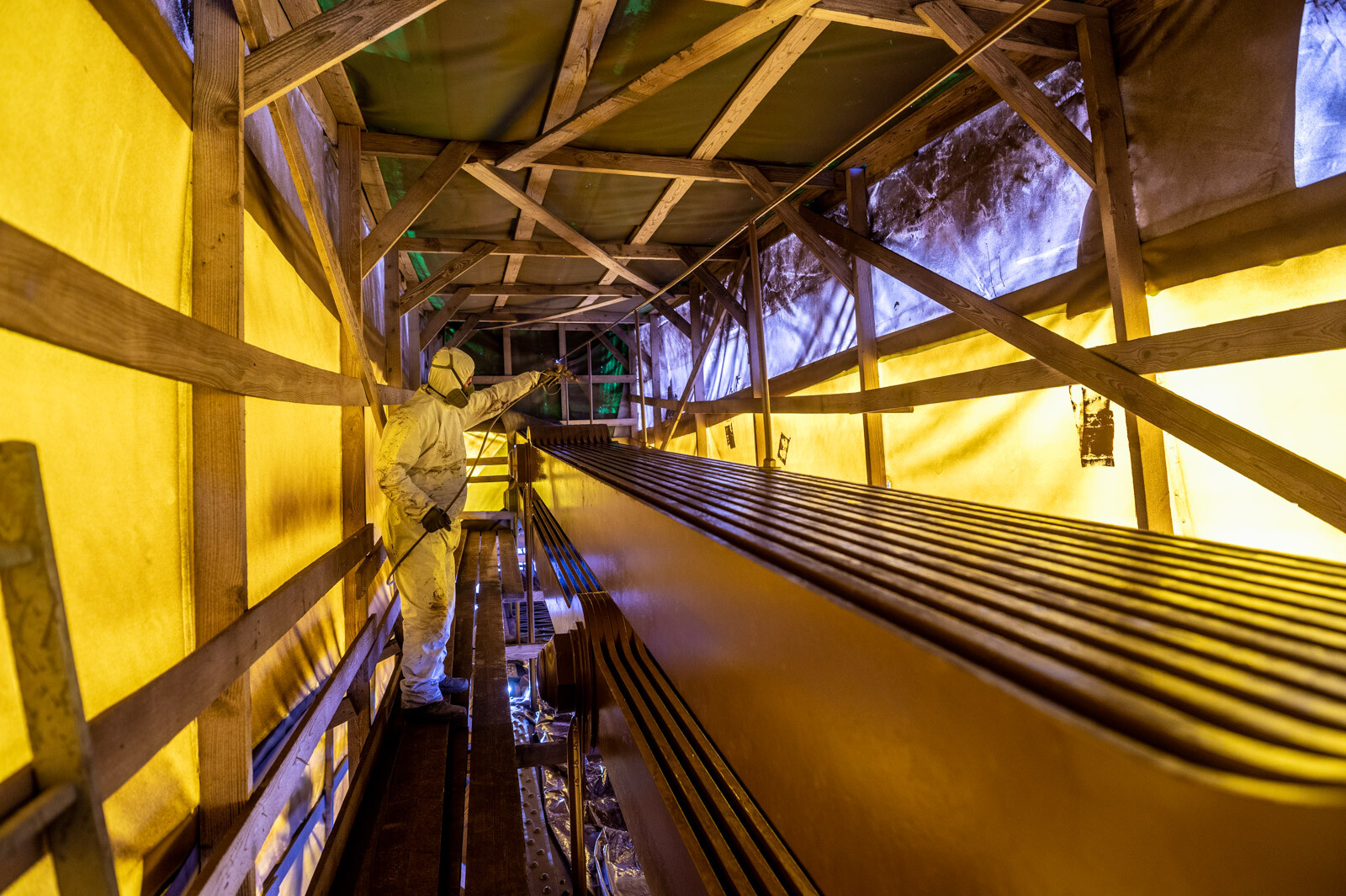 A láncok többi szakaszához hasonlóan a ponyvával borított állványzat alatt ezúttal is szemcseszórással távolítják el a régi festékrétegeket, majd felviszik az újakat. A budai és a pesti pilon koronasaruin, illetve a budai lánccsatornában továbbra is dolgoznak a szakemberek.