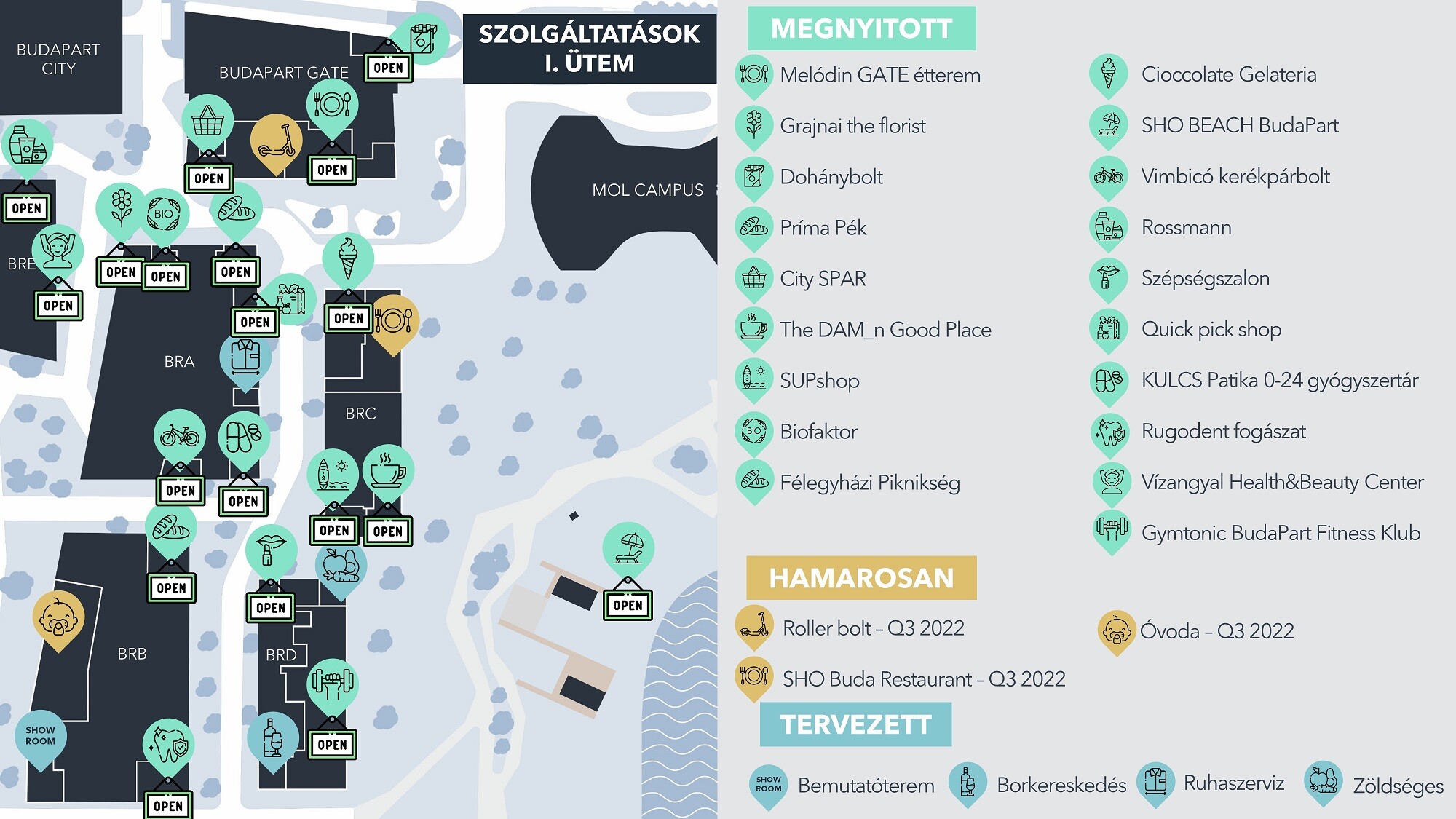 Elkészült a BudaPart GATE és a BudaPart CITY irodaház. Jelenleg építés alatt áll a BudaPart DOWNTOWN irodaház, amely egy 200 szobás, négycsillagos Radisson szállodát is magában foglal. A bérbeadott kereskedelmi felület nagysága 5.574 négyzetméter. 2022 végére adják át a terület és Budapest legmagasabb épületét, a MOL-székházat.