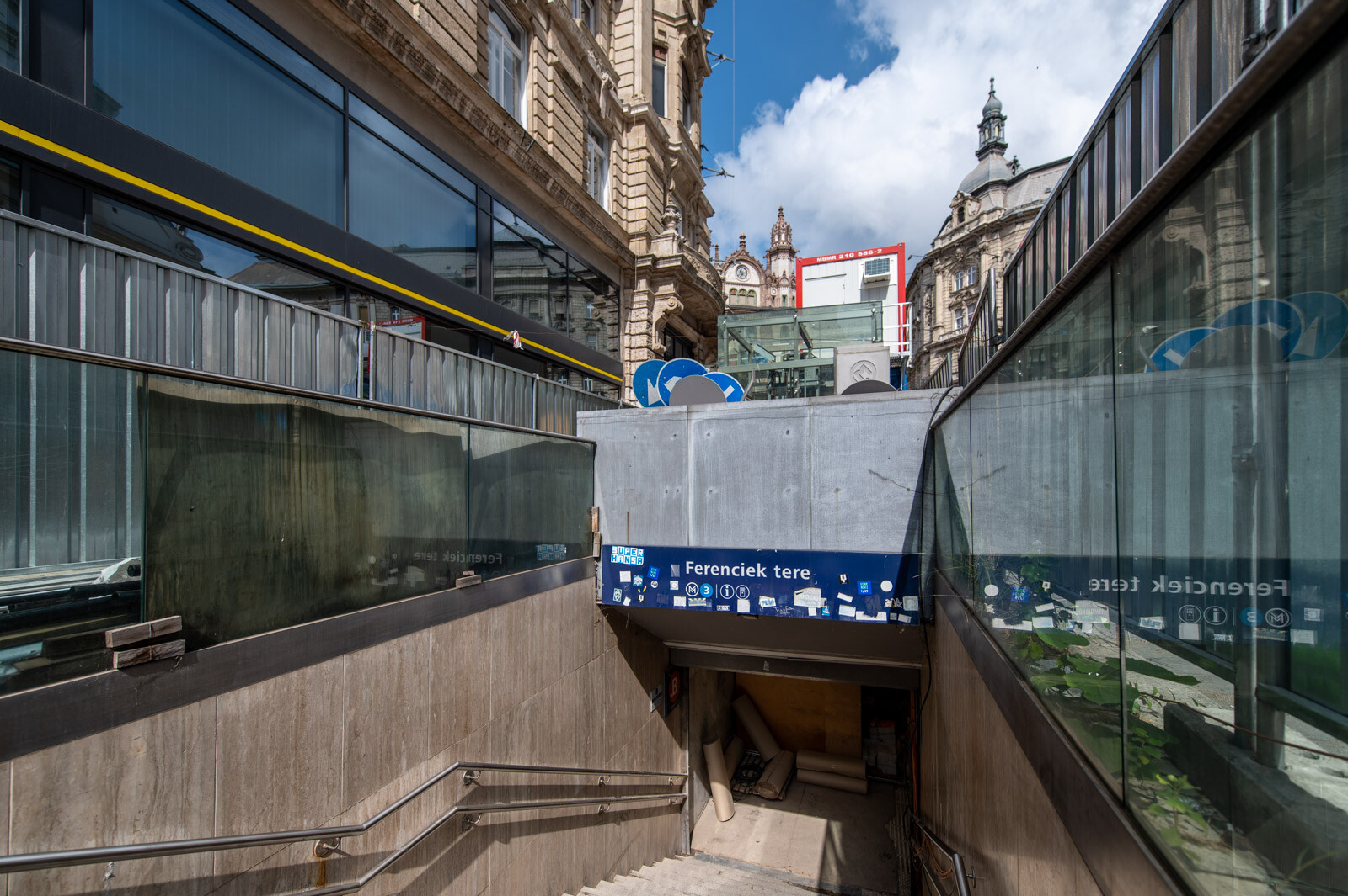 Az elmúlt hetekben a lejtaknában is látványosan haladtak a munkálatokkal. A Ferenciek terén – hasonlóan a Kálvin tér, Corvin-negyed és Semmelweis Klinikák állomáshoz – ferdepályás felvonó biztosítja az akadálymentes közlekedést, amely mellett három mozgólépcső üzemel majd. Utóbbiakat már beemelték a helyükre, a lépcsőkocsikat is beépítették, a hozzá tartozó vezérlőszekrények telepítése is megtörtént a gépházban. A ferdelift főbb szerkezeteit beállították és elkezdték a felvonó melletti üvegfalhoz az acélszerkezetek beépítését.