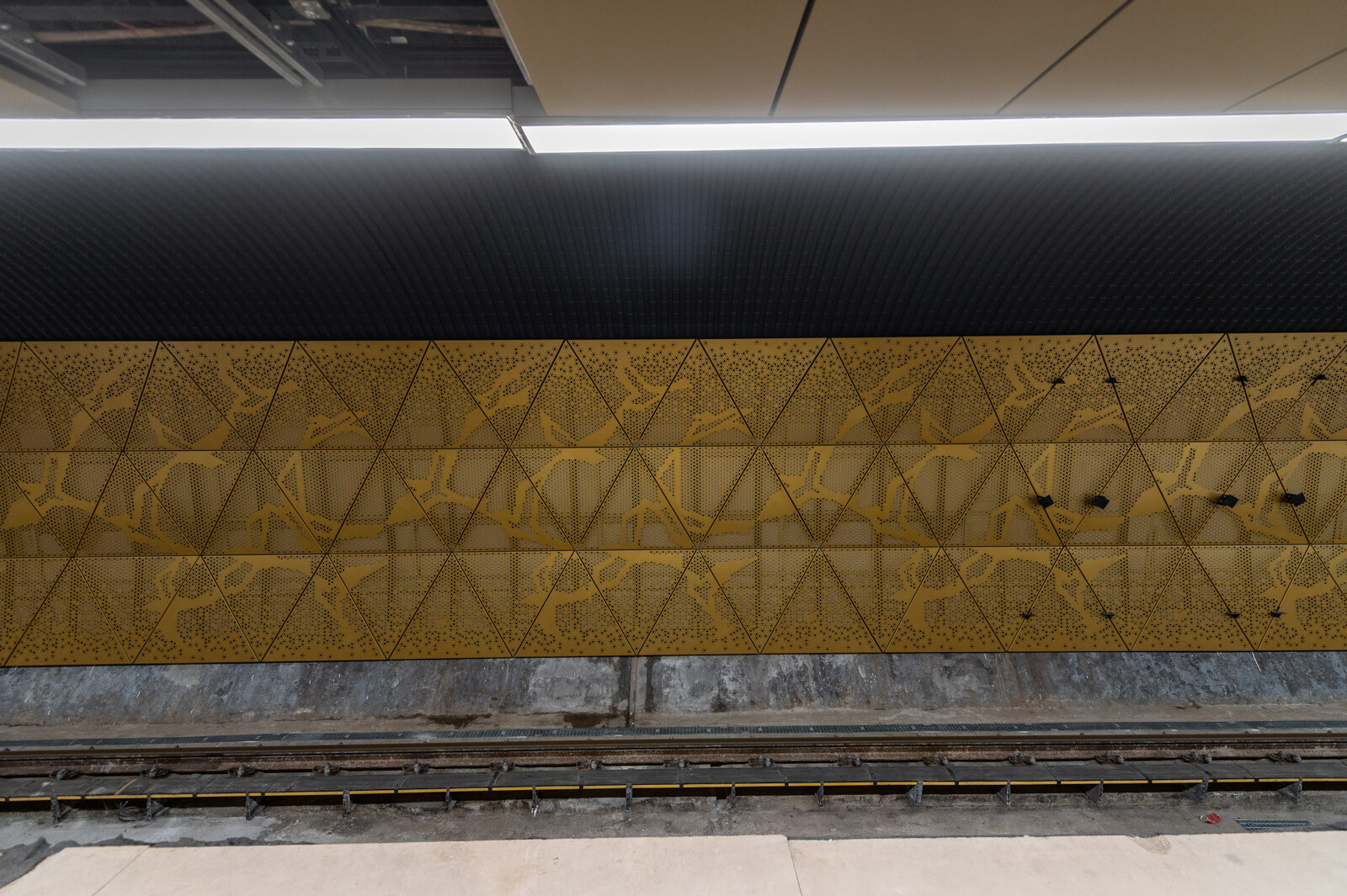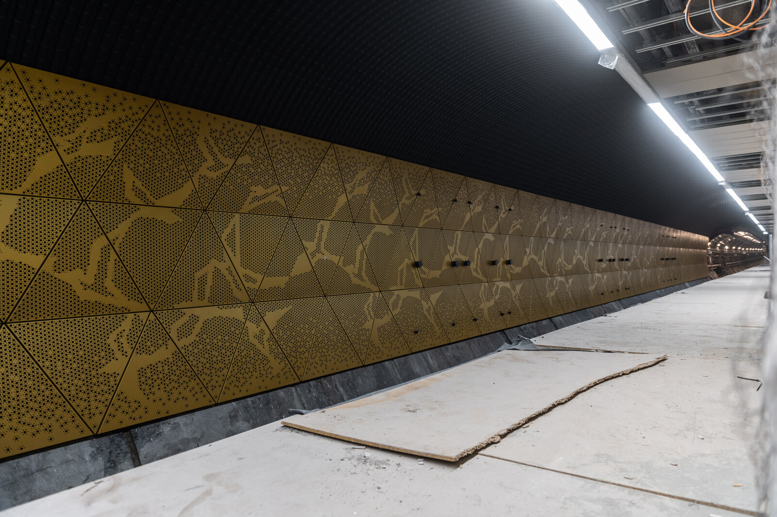 Augusztusban szintén elkezdődött a peronszint fix álmennyezeti fémlemez elemei és az oldalfalburkolat-elemek felhelyezése (ez utóbbiak a Kálvin térihez hasonló perforált fémlemezek, ám itt aranyszínűek). Ebben a folyamatban elsőként a standard méretű elemeket helyezik el, majd helyszíni mérések segítségével kerülnek helyükre az egyedi méretű, nem standard alakú burkolatelemek.