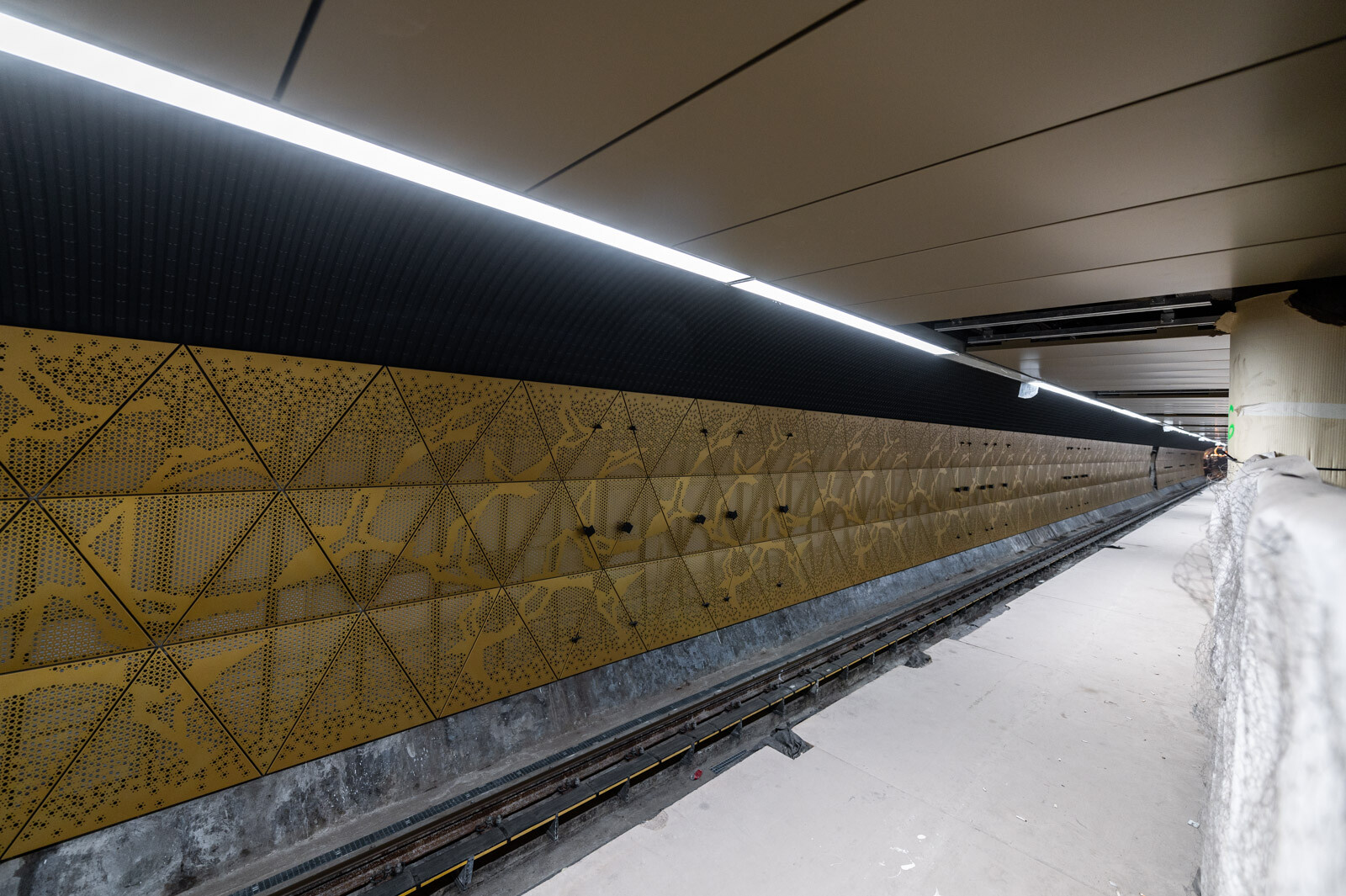 Az elmúlt hetekben elkészült az álmennyezet, oldalfalburkolatok, kábeltakaró, valamint a peronburkolat is.
