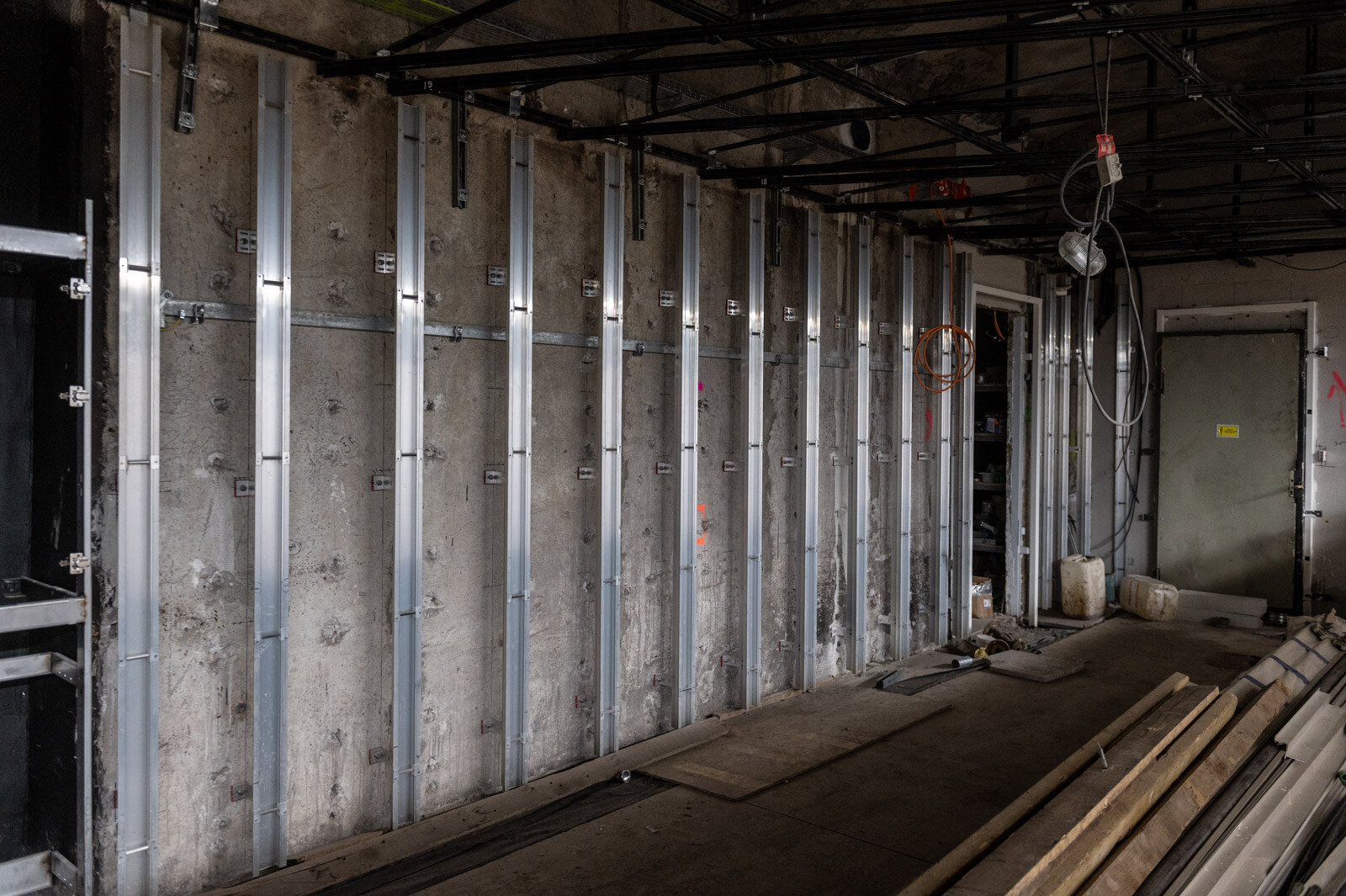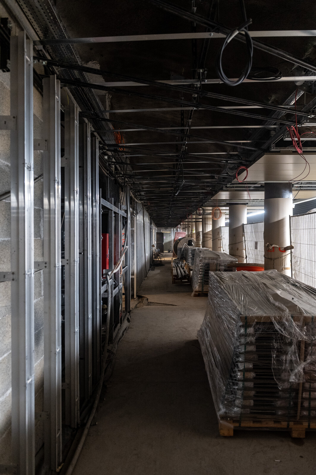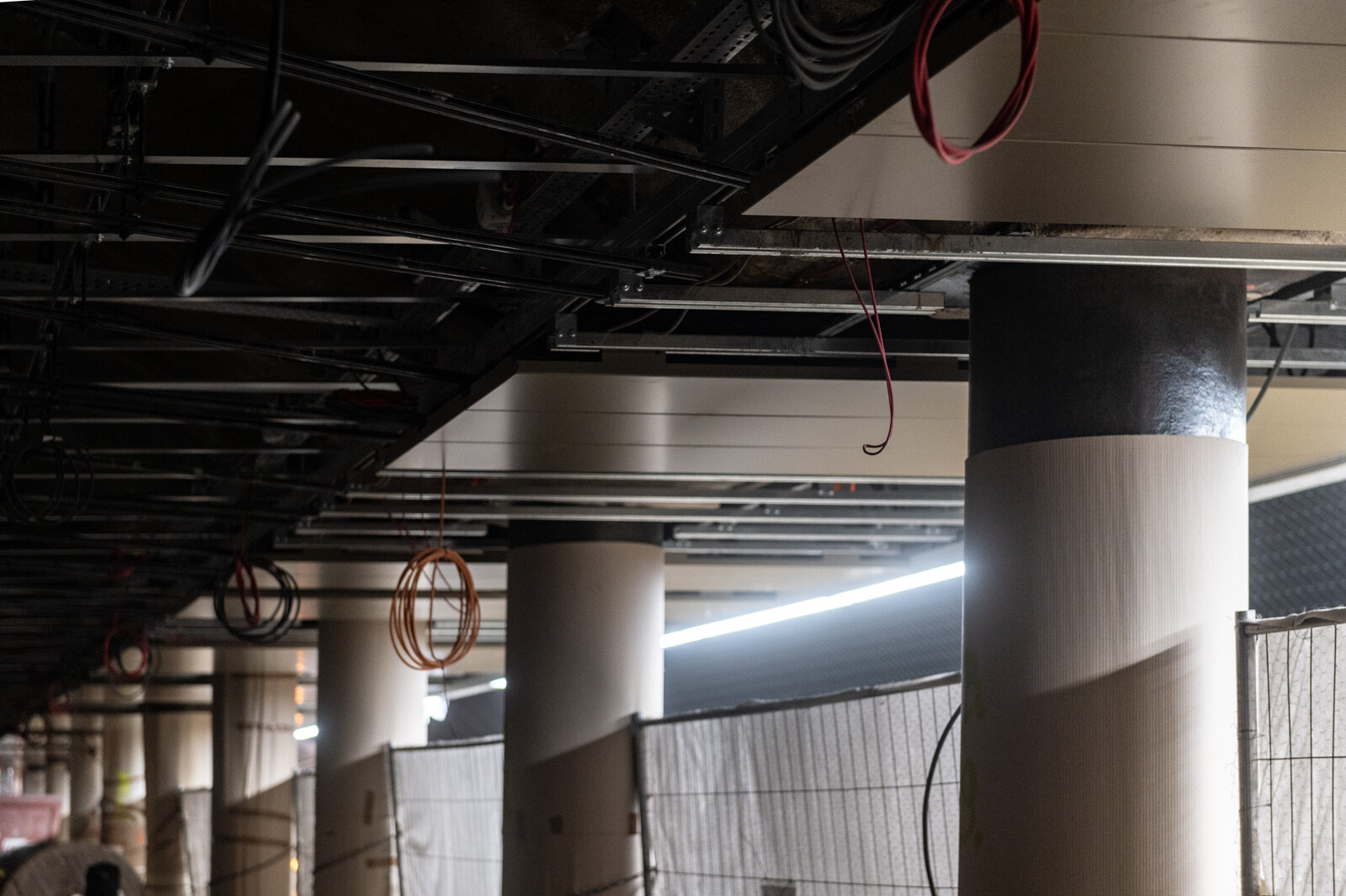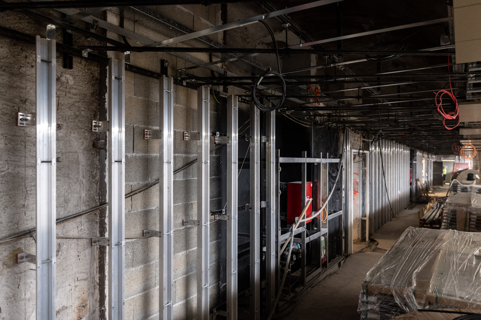 A fémlemezburkolatok, valamint az oldalfal burkolatok tartószerkezeteinek munkái elkezdődtek és kialakították az álmennyezet feletti teljes elektromos és gyengeáramú nyomvonalakat is.
