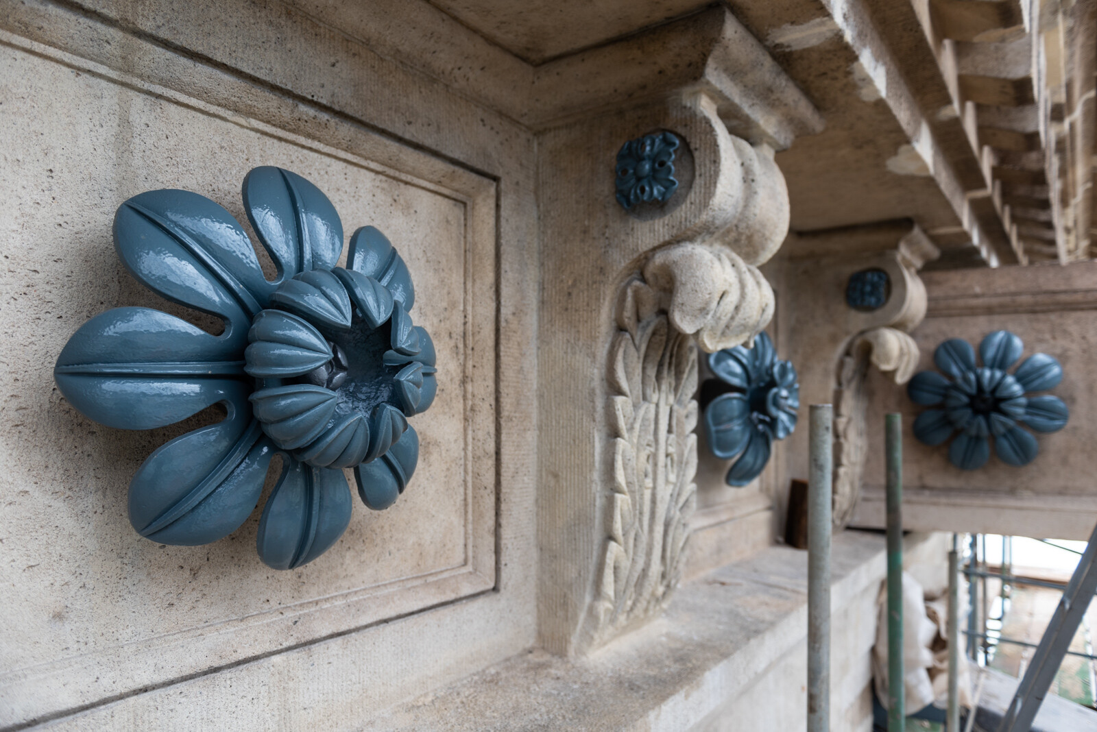 A pesti pilonra már visszaszerelték a köveket díszítő 60 kis rozettát (a rózsaszirmokat formázó fém épületdíszeket) és 26 nagyobb díszöntvényt is, amelyeket a híd „új”, kékesszürke színére festettek. A felújított gránit- és mészkőelemeket a pilon egyes részein még patinázzák és víztaszító szerrel kezelik.