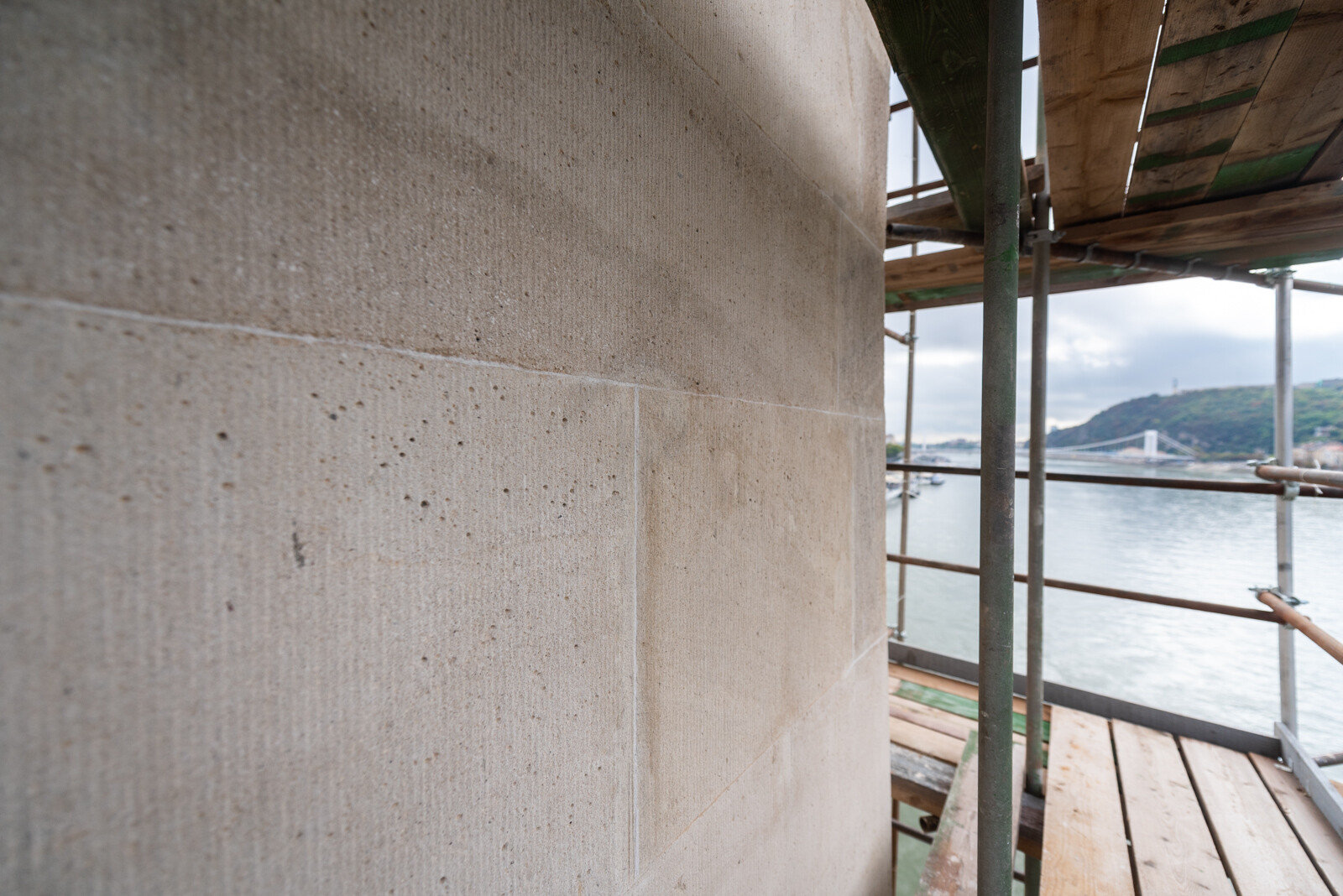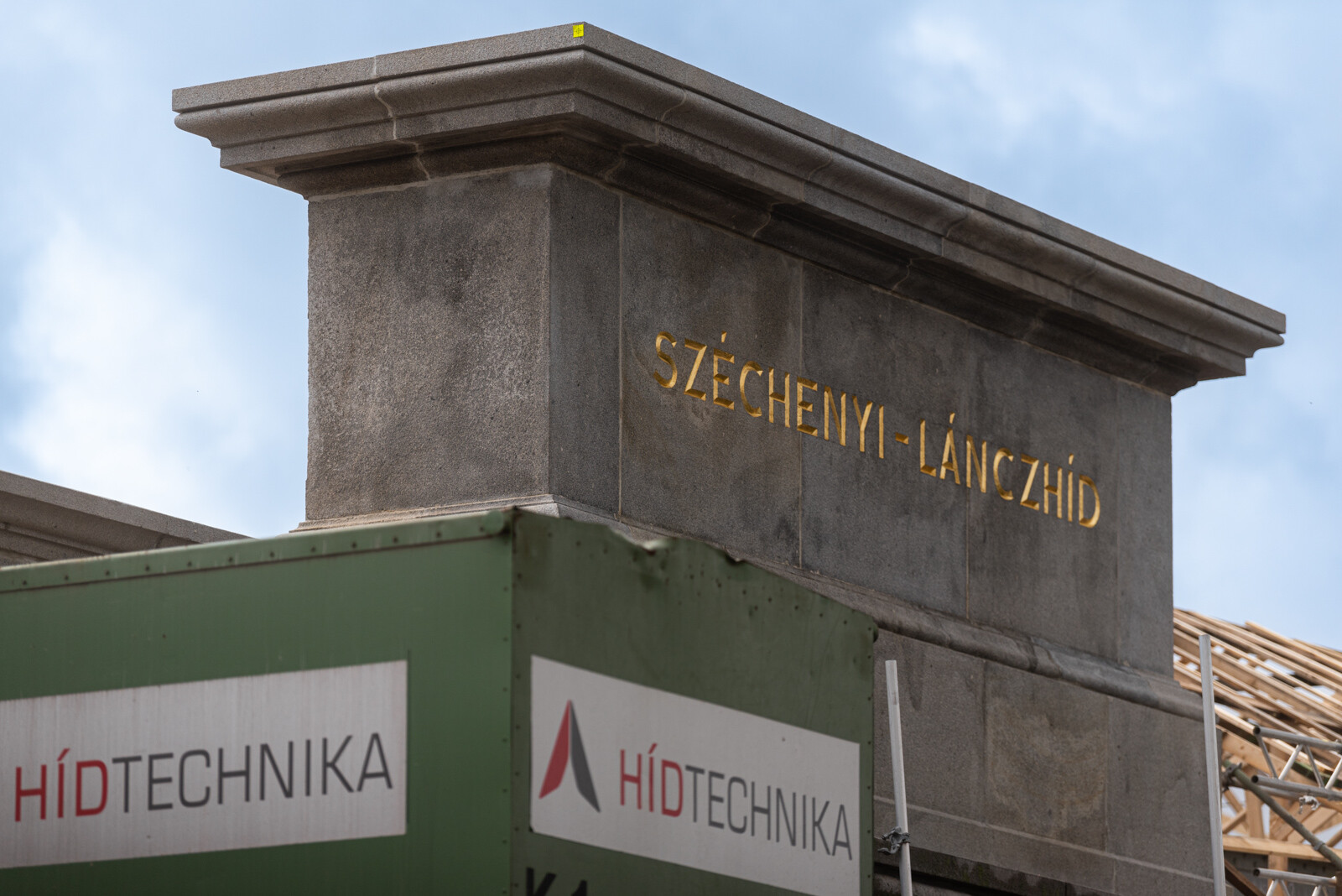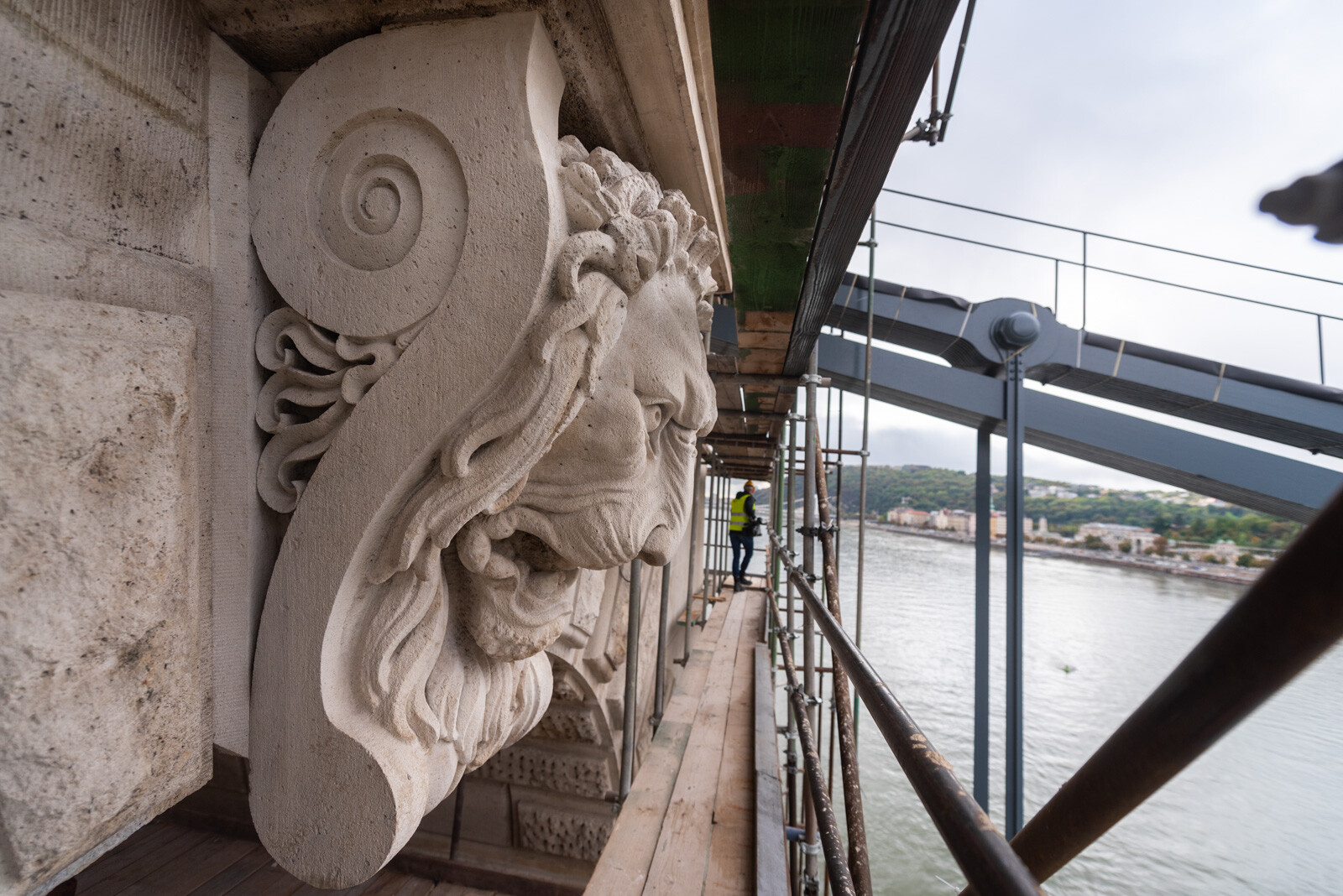 Az A-híd szakemberei az utolsó simításokat végzik a pesti pilon kőfelületein, ahol tavasszal kezdődtek a munkák. Megszépültek a pesti kapuzaton lévő oroszlánfejek és a fölöttük lévő címerek, amelyek megújításán szintén a helyszínen, a kapuzatokat körülölelő állványról dolgoztak a restaurátorok.
