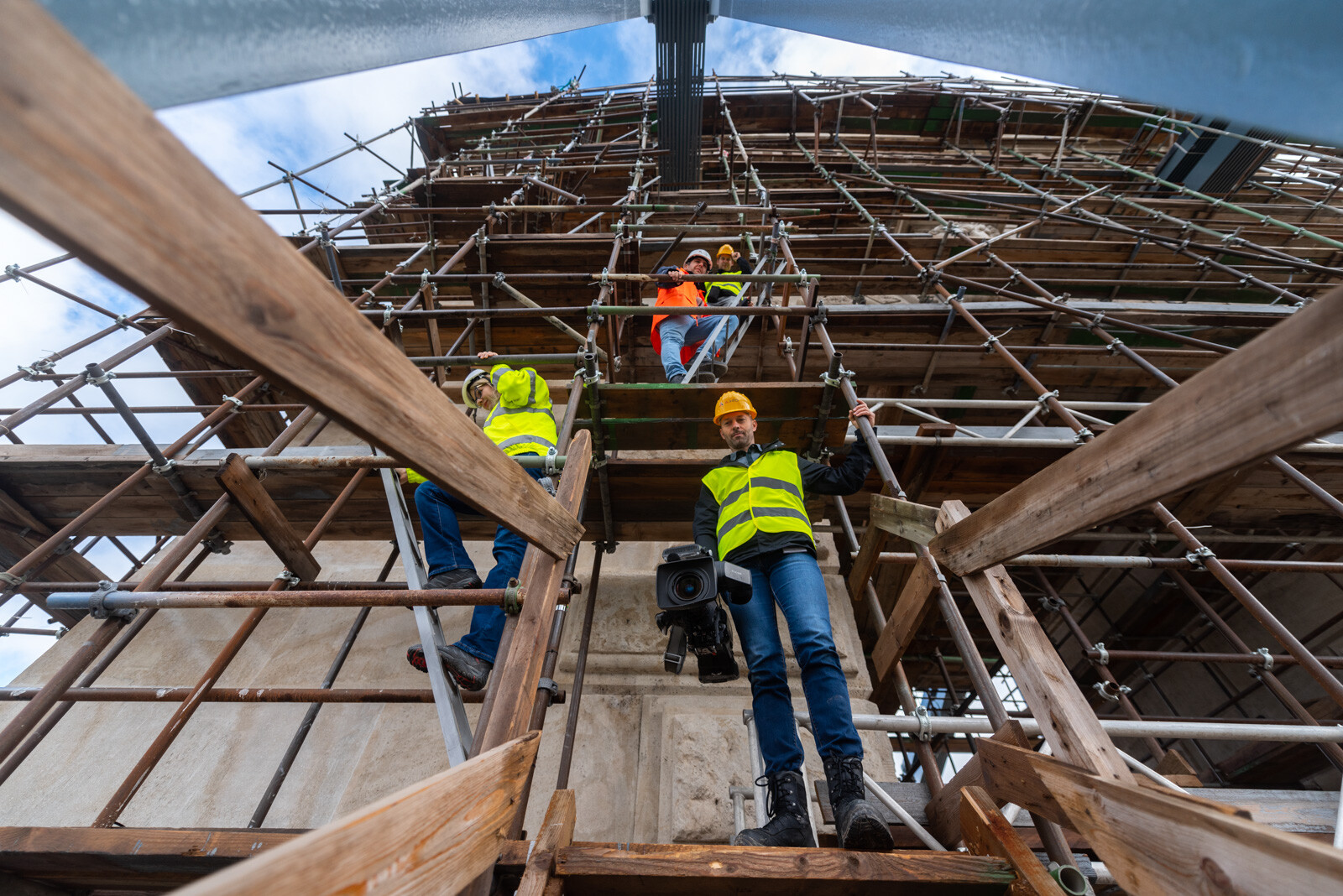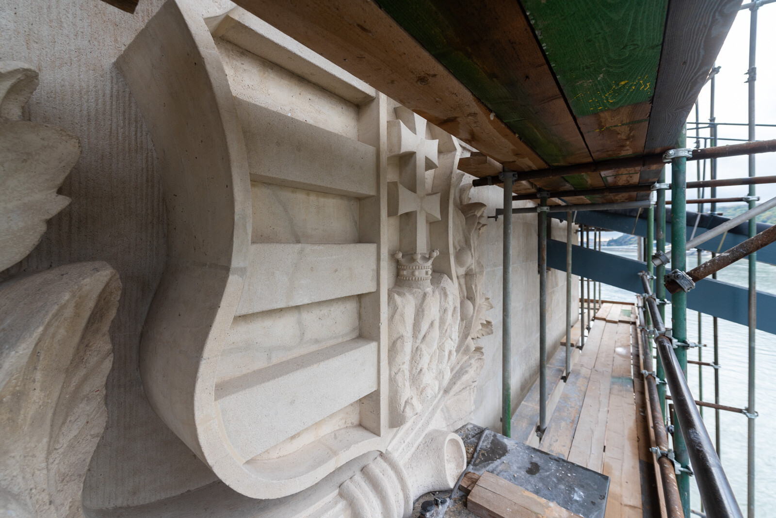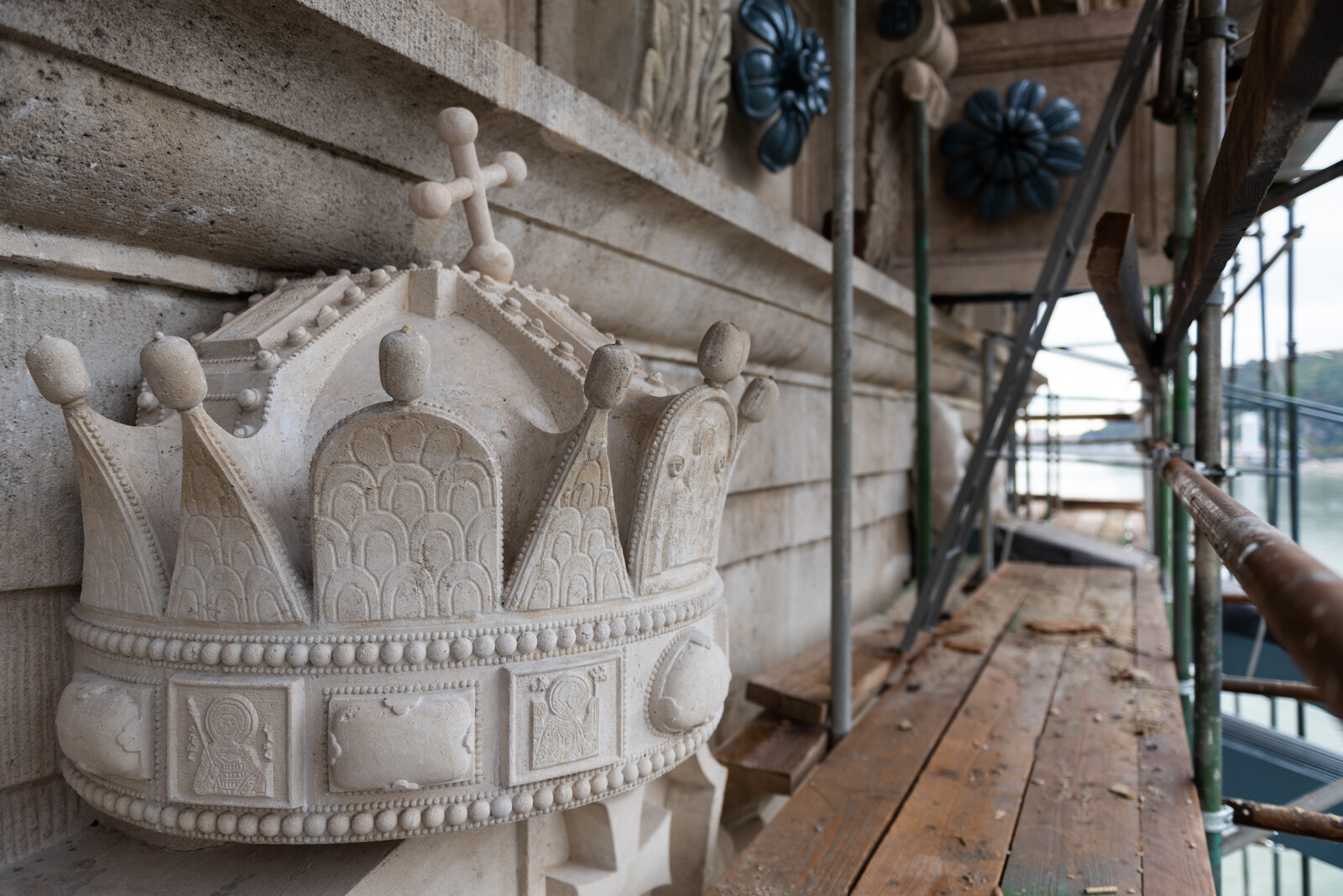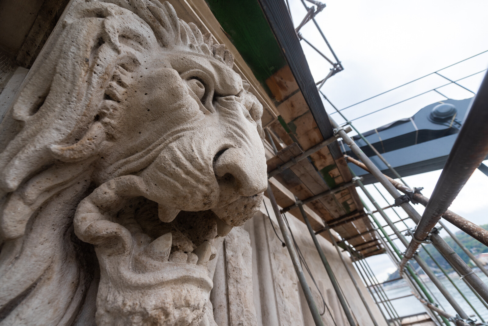 Az A-híd szakemberei az utolsó simításokat végzik a pesti pilon kőfelületein, ahol tavasszal kezdődtek a munkák. Megszépültek a pesti kapuzaton lévő oroszlánfejek és a fölöttük lévő címerek, amelyek megújításán szintén a helyszínen, a kapuzatokat körülölelő állványról dolgoztak a restaurátorok.