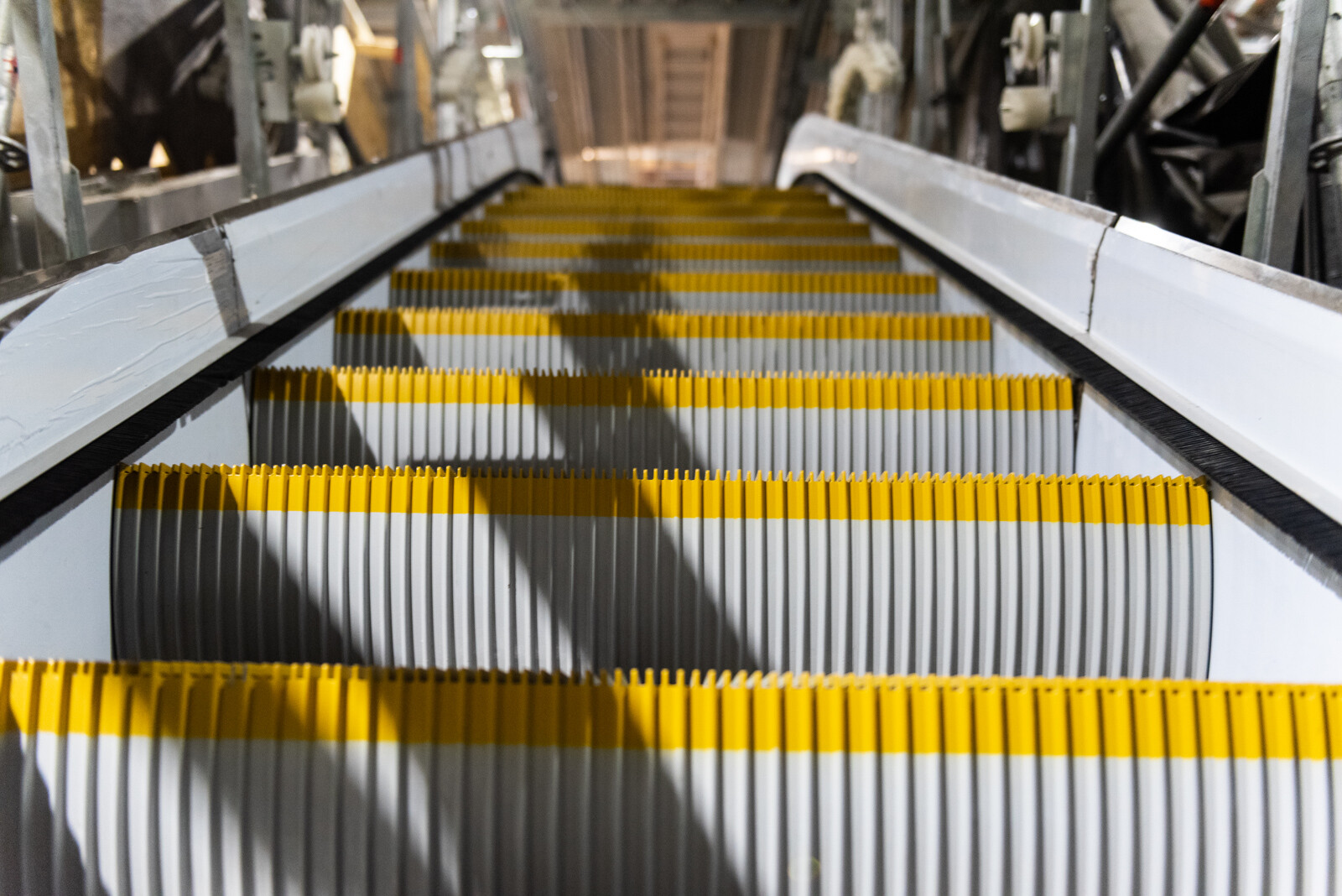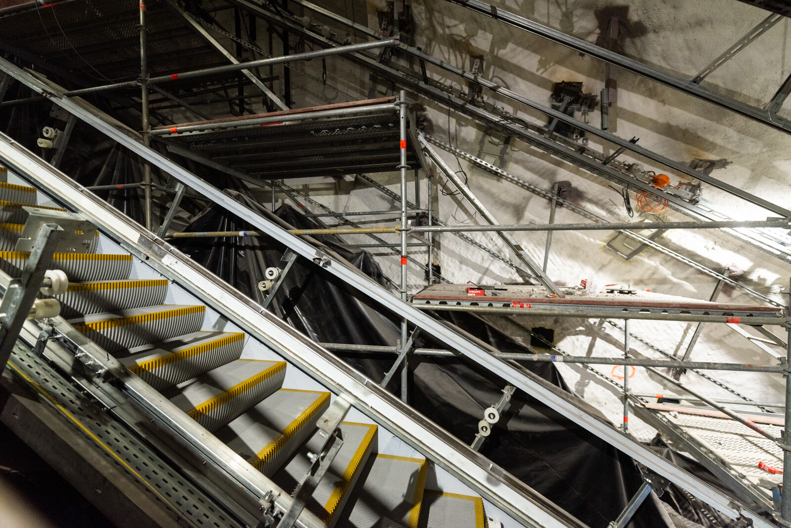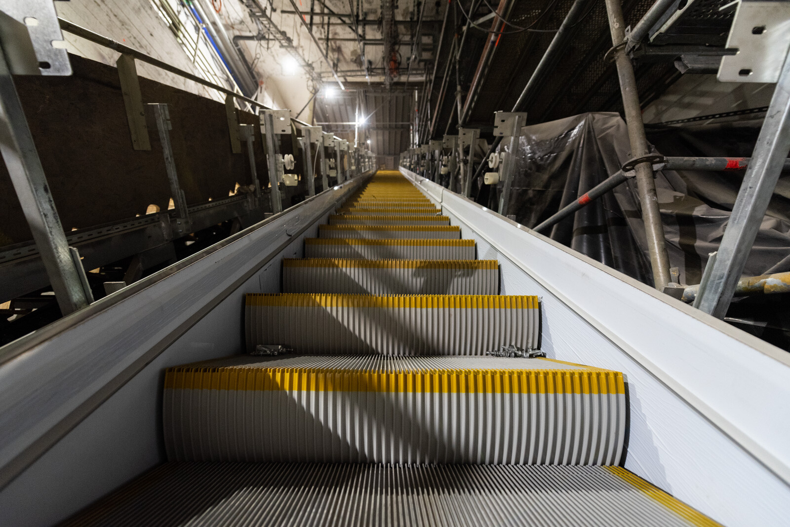 A mozgólépcsők kivitelezése komoly logisztika, hiszen a három szerkezetet csak külön ütemezve tudják készre építeni. Mint Zöld Viktor elmondta, jelenleg a munkát is segítik már ezek a berendezések. Egyiken a le- és feljutást biztosítják, a középső mozgólépcsőt már öltöztetik, a harmadik felett pedig jelenleg is zajlanak a mennyezeti munkák: tartószerkezet építése, kábelezés, lámpák szerelése. A különböző szakágaknak biztosítani kell a megfelelő időt a munkák elvégzésére. Ha egy fázis befejeződött, cserélik a mozgólépcsőkön folyó munkálatokat.