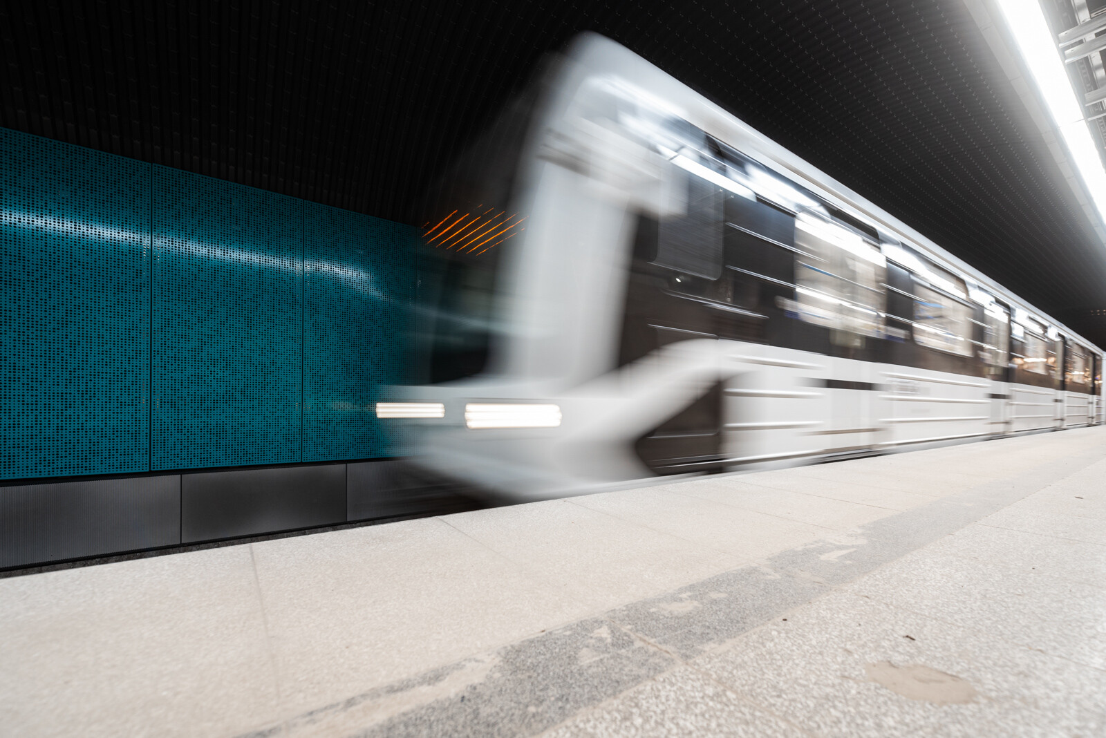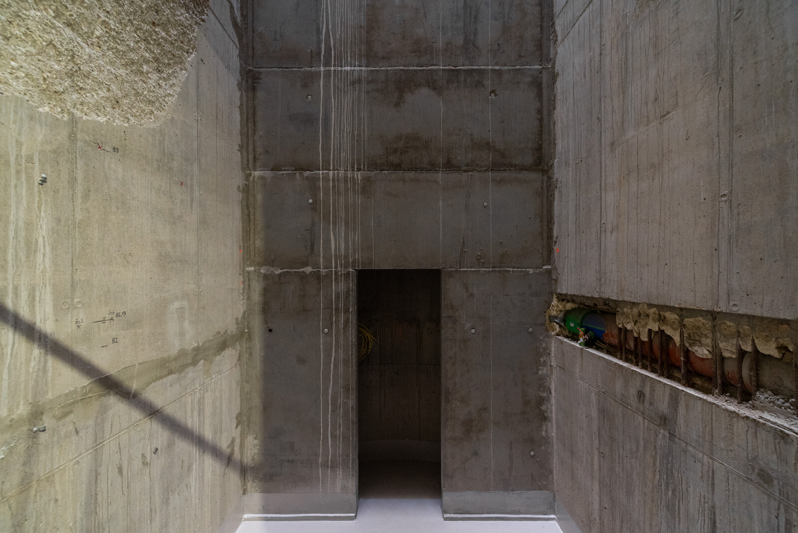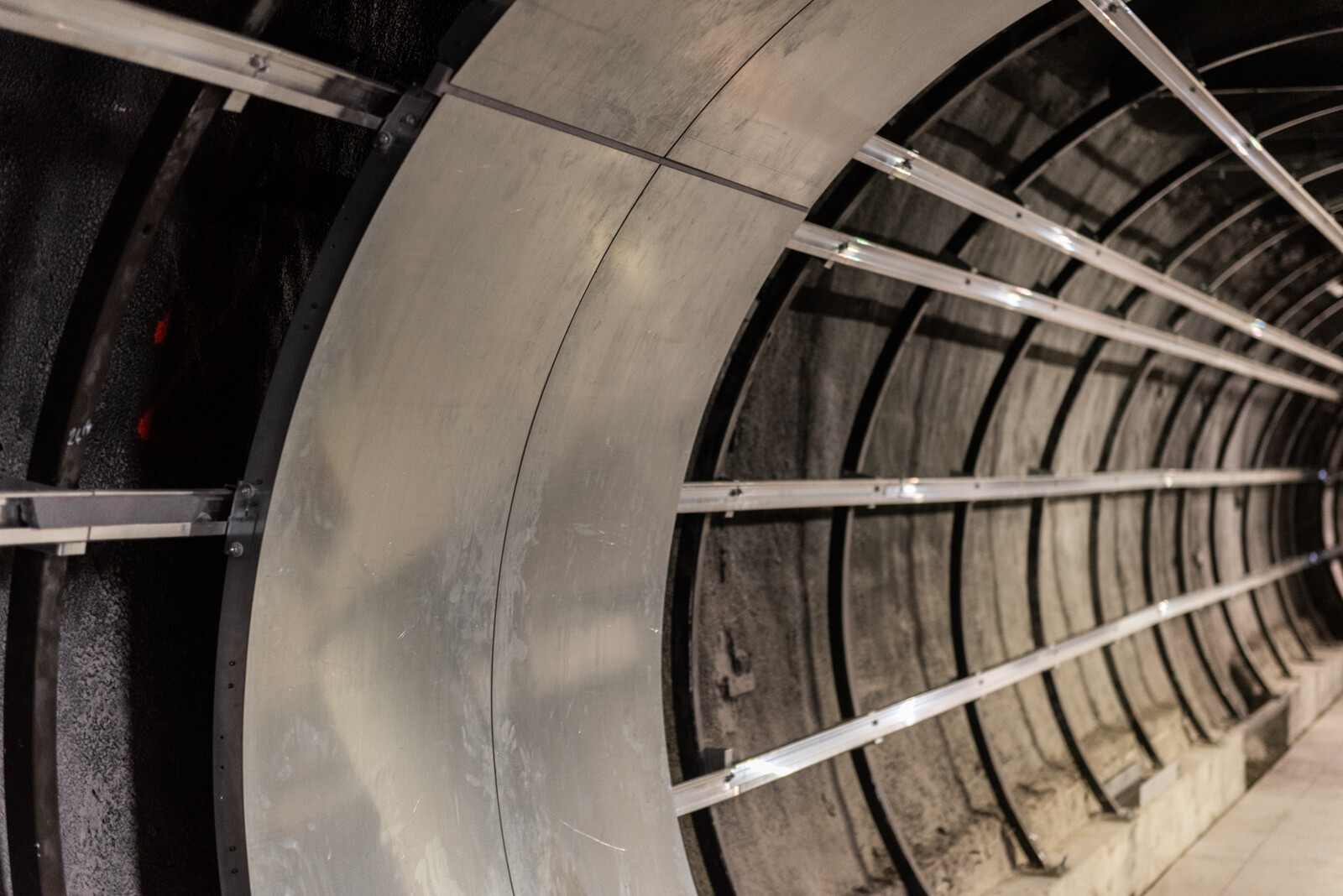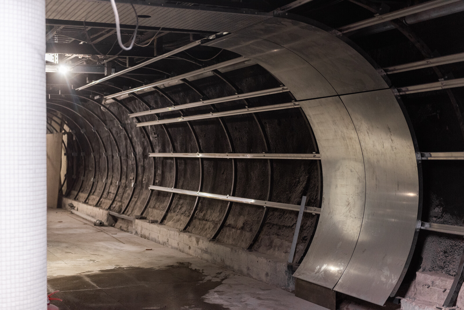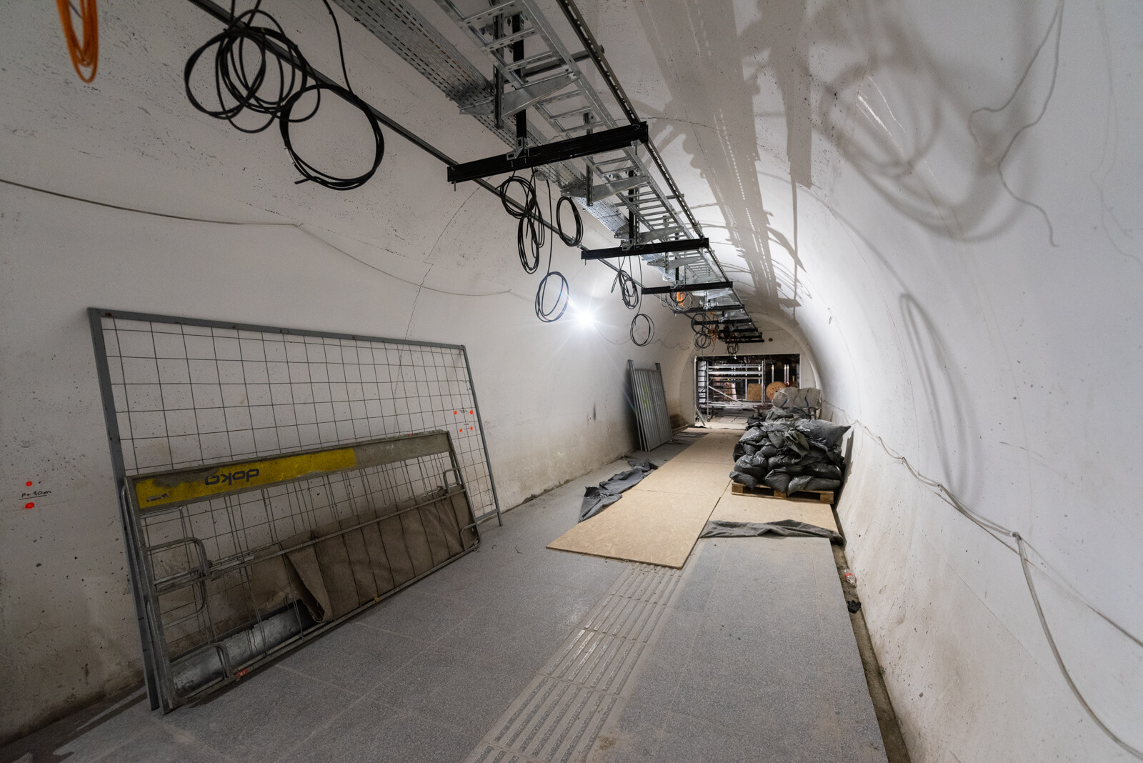 A függőleges liftaknáról, amelyet a korábban tervezett Nemzeti Színház alépítményeinek felhasználásával valósítottak meg, már korábbi cikkeinkben is írtunk. A felvonóakna lejáratához több mint 20 méter hosszú új alagutat fúrtak az állomás peronszintjétől (ennek célba éréséről videót is készítettünk), amelyben az utasforgalom áthaladásának ritmusára egyenletesen kiosztott, fehér színű íves fém fal- és mennyezetburkolat reflektál majd.