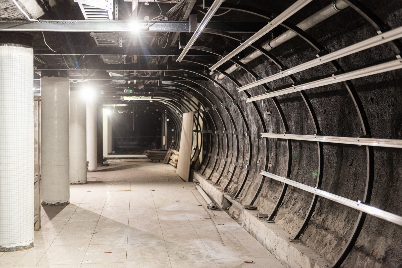 A kivitelezési munkák itt mintegy fél éve kezdődtek, a tartószerkezeteket három hónappal ezelőtt kezdték felmérni, majd beépíteni. Miután ázásnyomokat találtak, a munka lelassult: a szakemberek feltárták az 50-60 éves szigetelést, amihez fel kellett szedniük az aljzatbetont. A javítások kihagyhatatlanok, folyamatban vannak. Zöld Viktor azt is elmondta: komoly kihívás lesz a két szerkezet összedolgozása ott, ahol az alagút vége az M2-es metró területére érkezik.