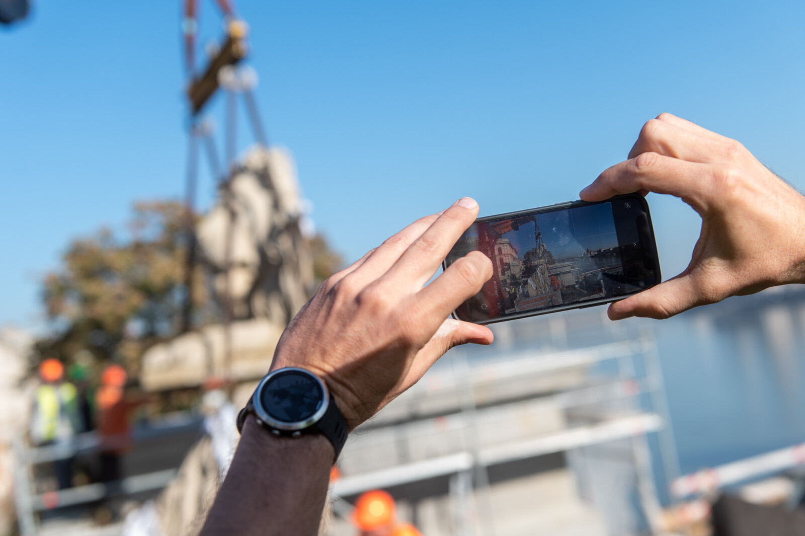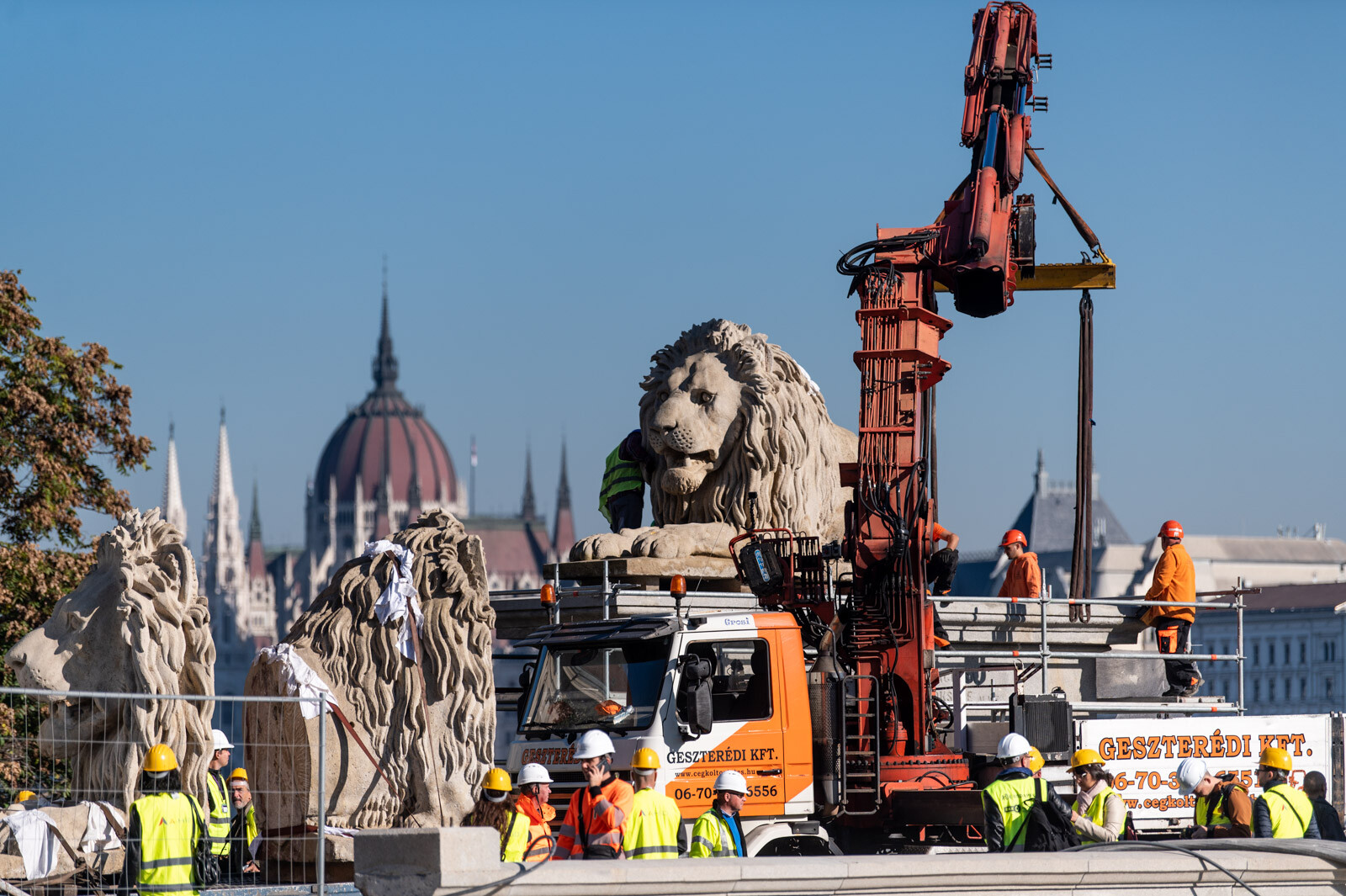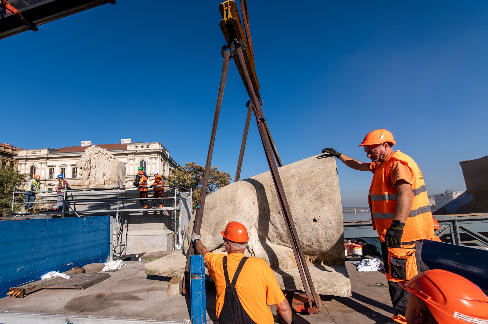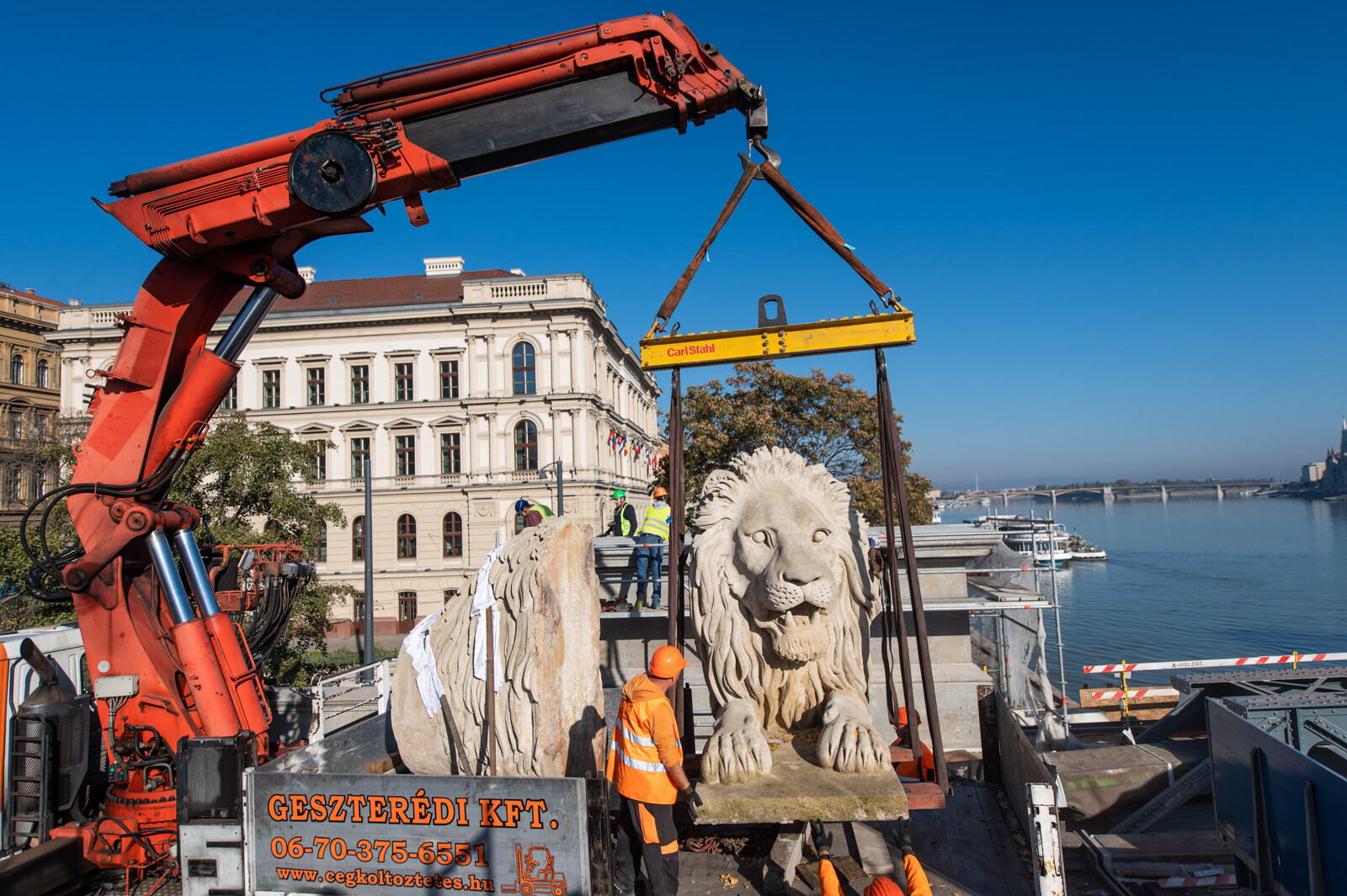 A tavaly augusztusban elszállított szobrok kedden egy pótkocsis autódaru, illetve két teherautó által érkeztek vissza a helyszínre. A több kőtömbből álló oroszlánokat, ahogy az elszállításnál, most is három külön részben mozgatják, a talpazatukon újra összeillesztik, végleges rögzítésük pedig még hetekig eltart.