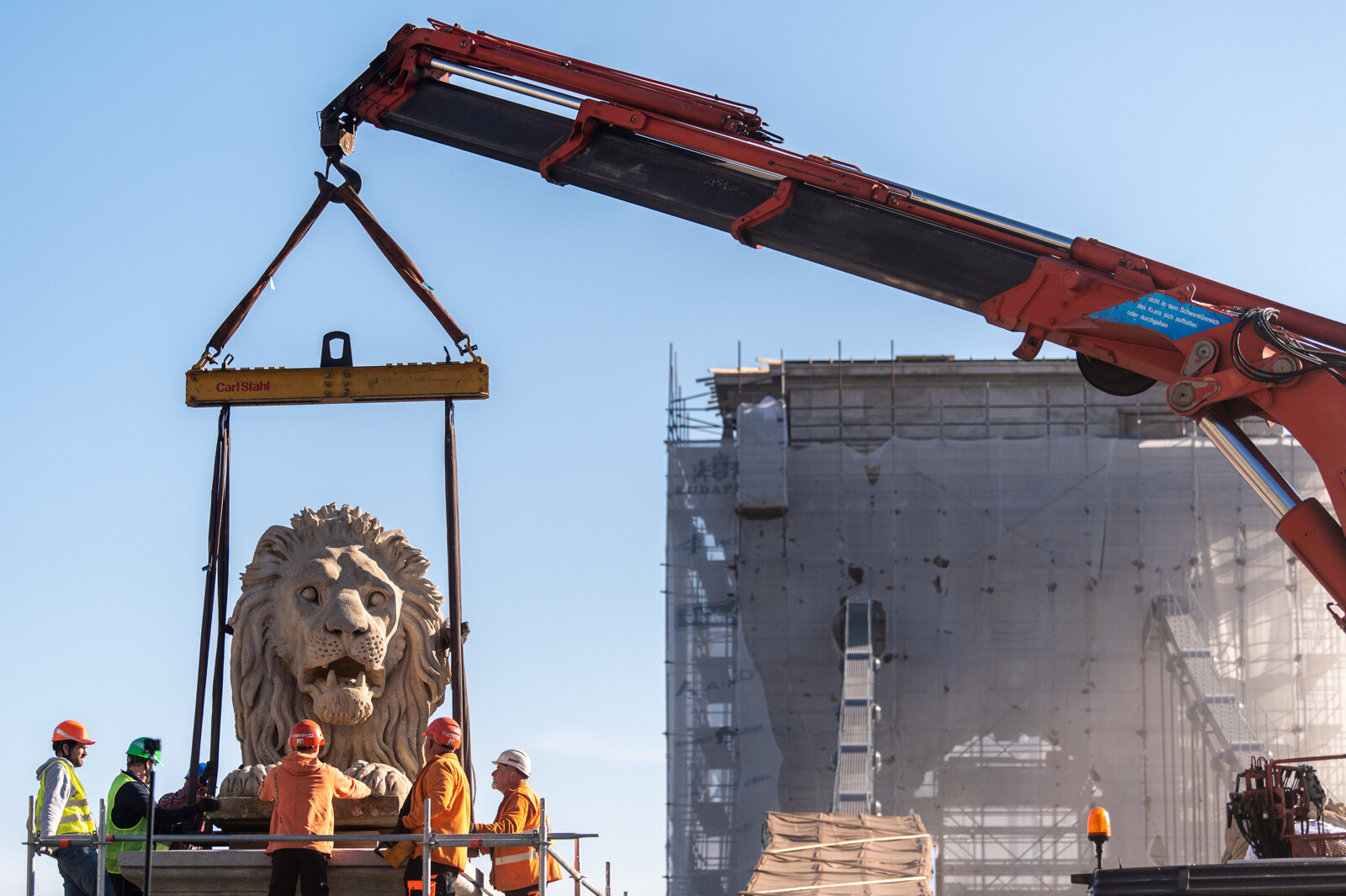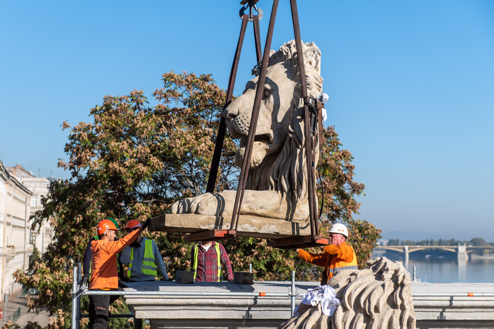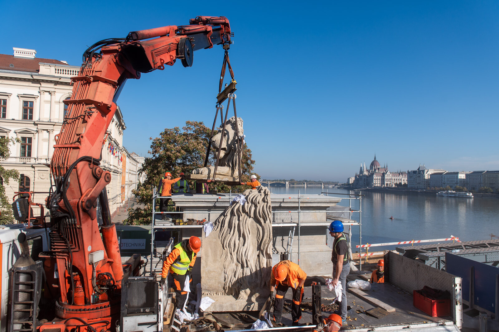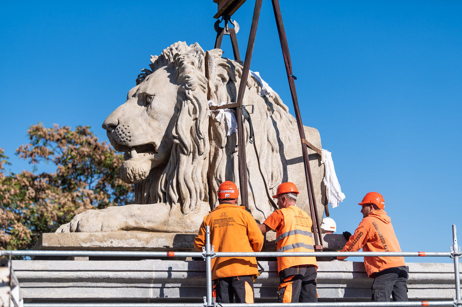A budai hídfőket őrző, egyenként több mint 10 tonnás oroszlánszobrokat három teherautóval szállították a helyszínre és daruval, három darabban emelték vissza a háromméteres gránittalapzatukra.