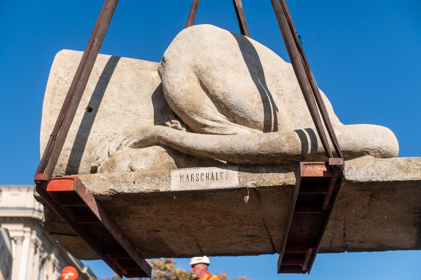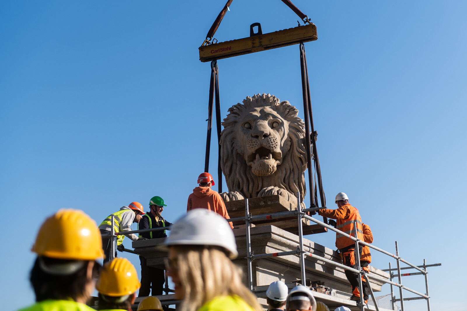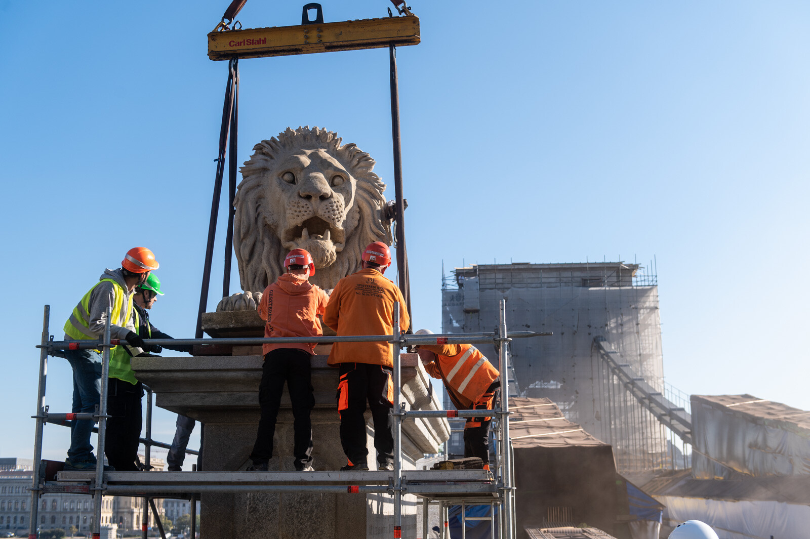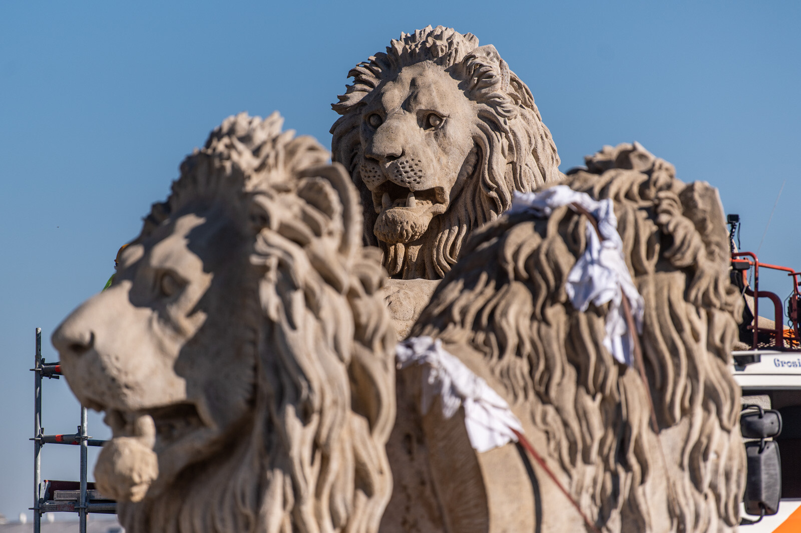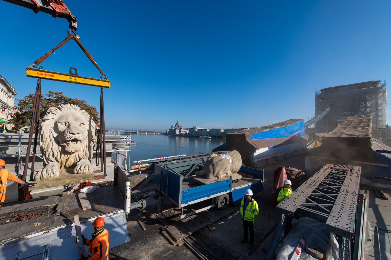 A budai hídfőket őrző, egyenként több mint 10 tonnás oroszlánszobrokat három teherautóval szállították a helyszínre és daruval, három darabban emelték vissza a háromméteres gránittalapzatukra.